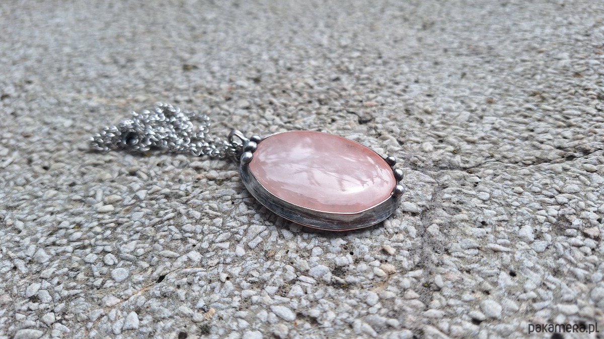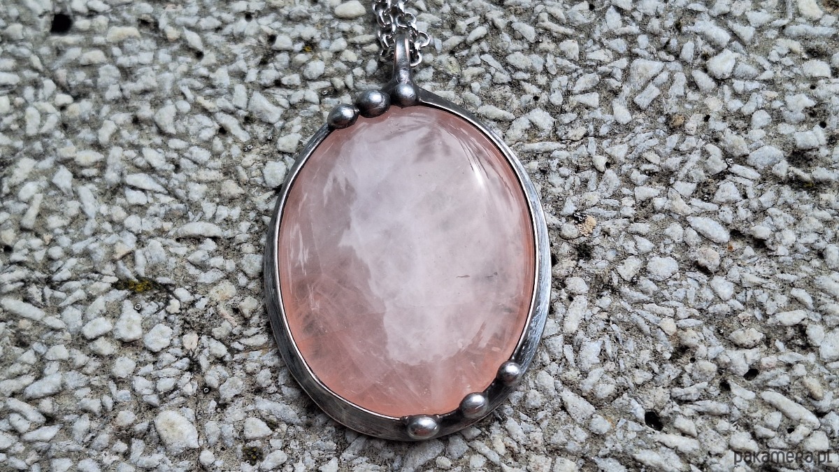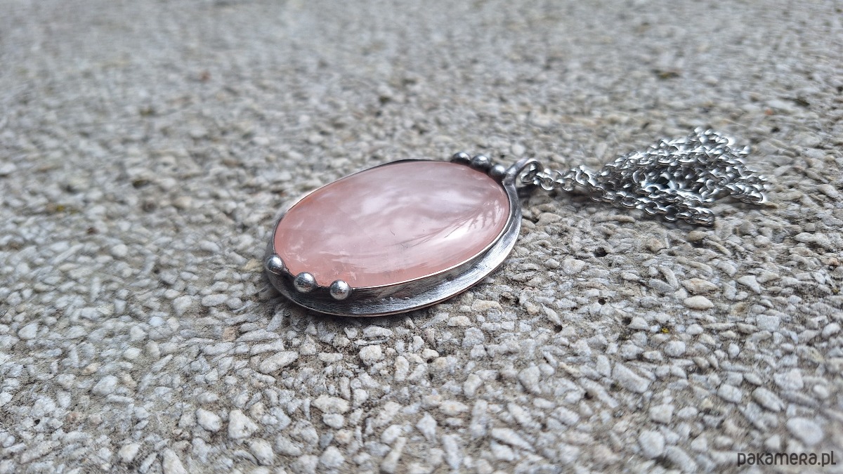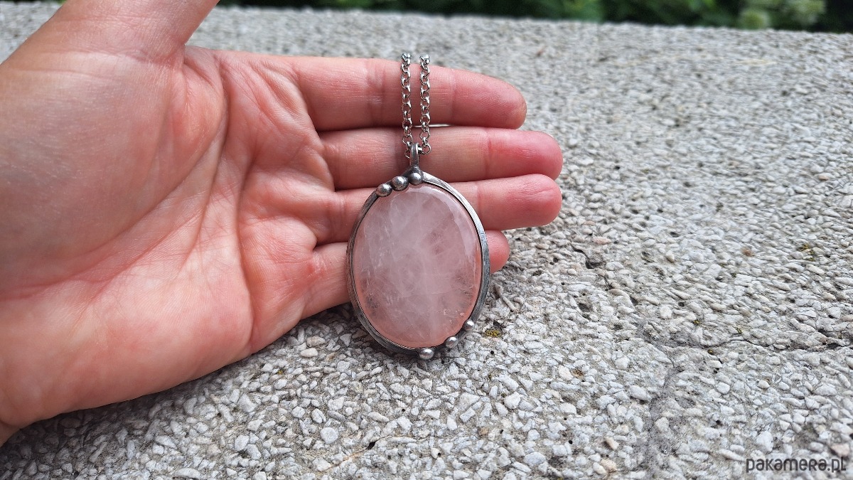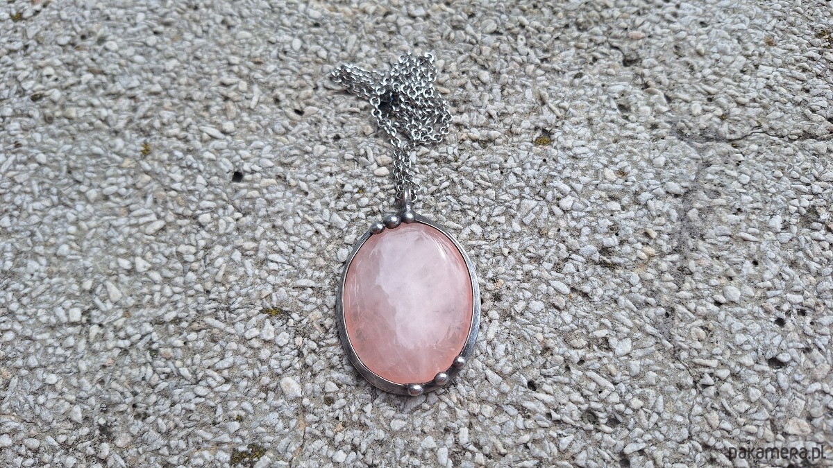 Wisiorek wykonany z miedzi, cyny i kwarcu. Wymiary ok. 5 na 4 cm. Zawieszony na łańcuszku o długości ok. 50 cm.