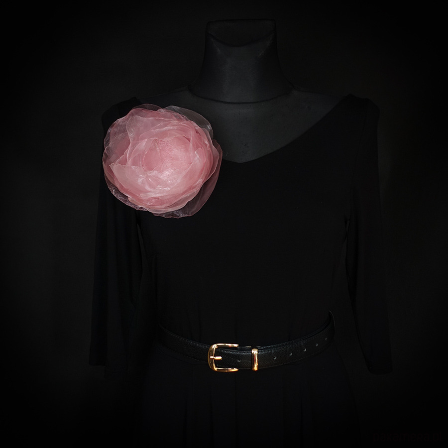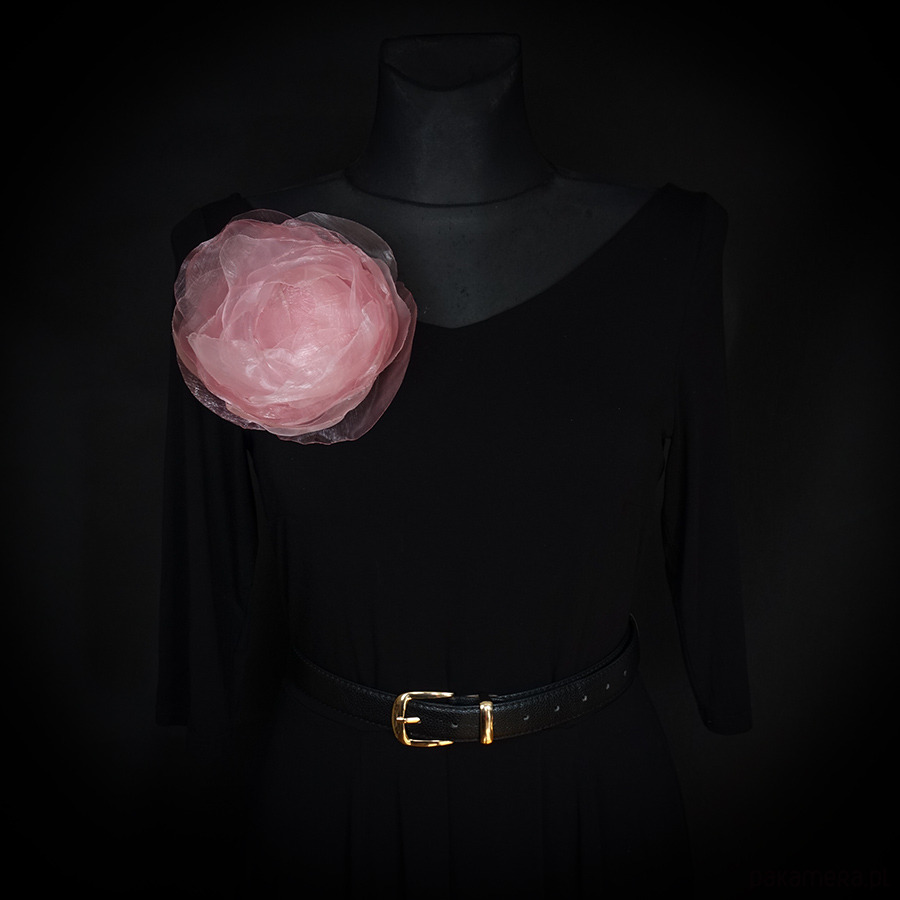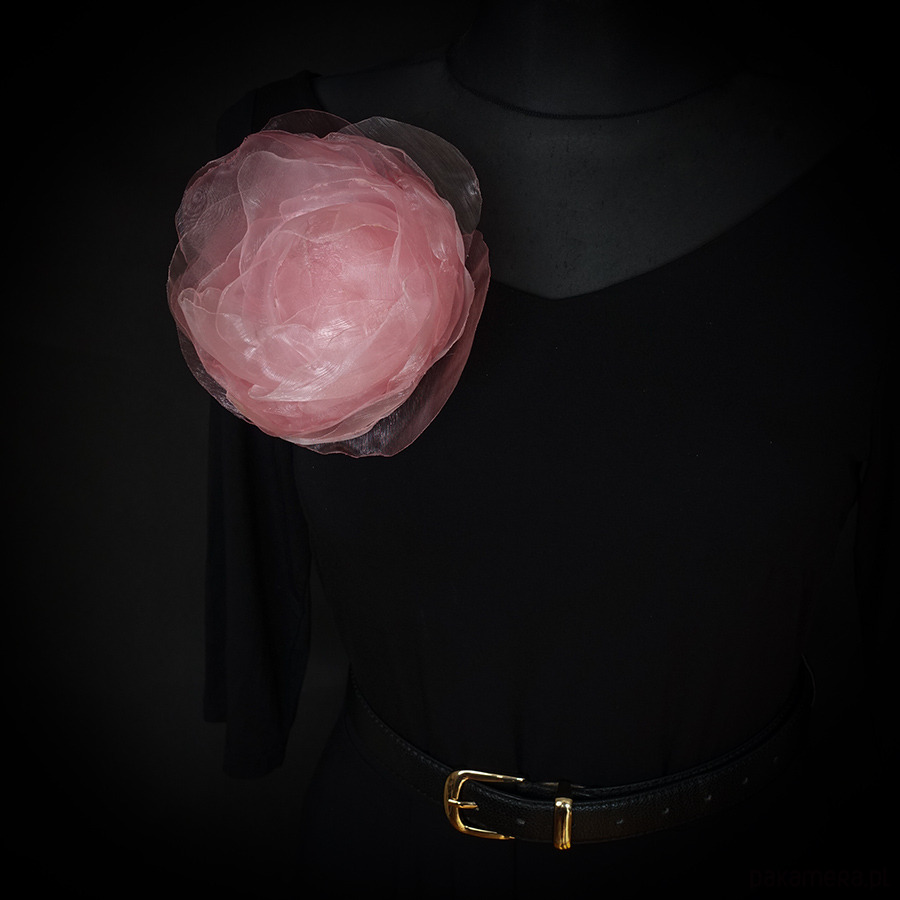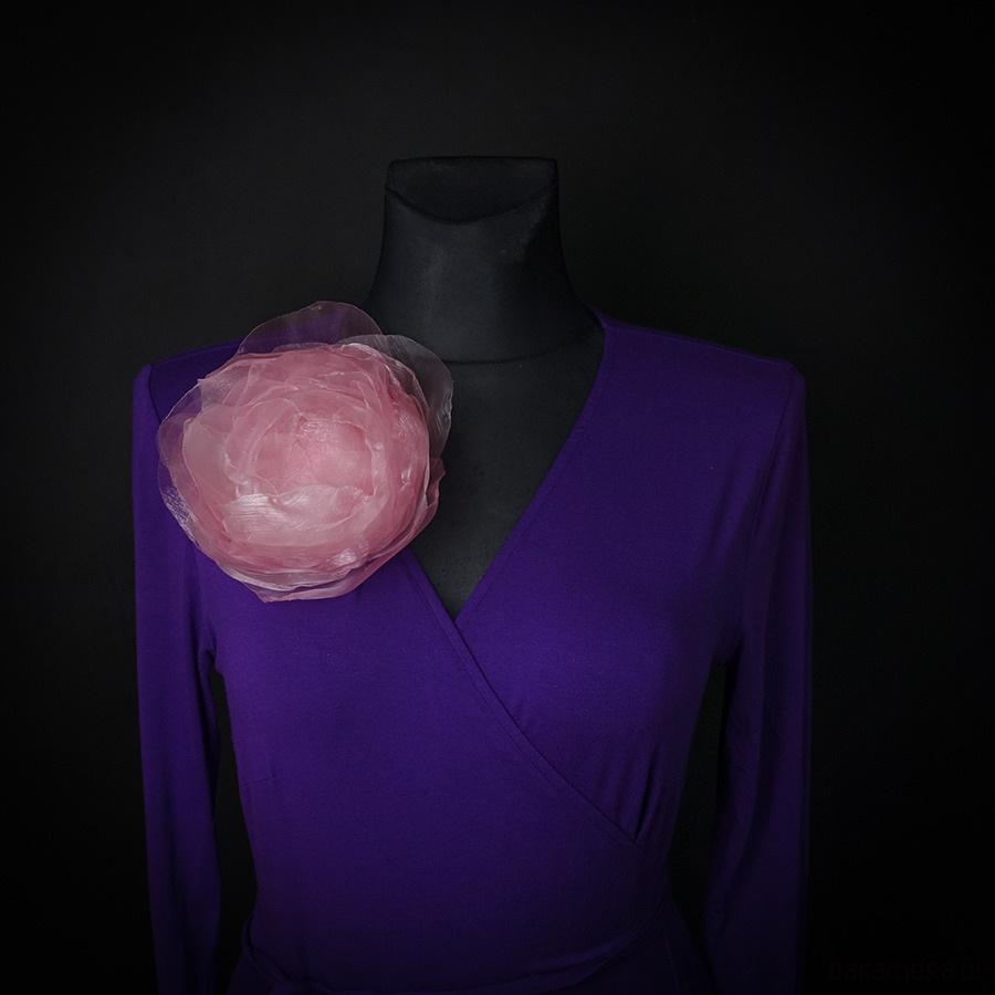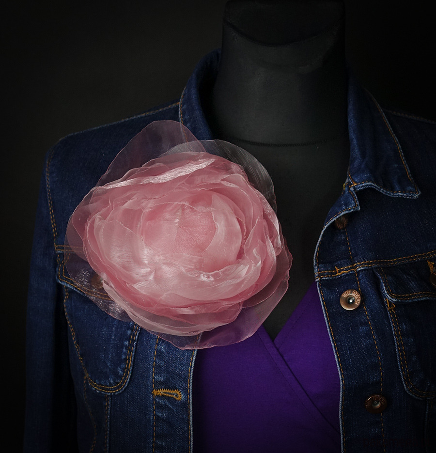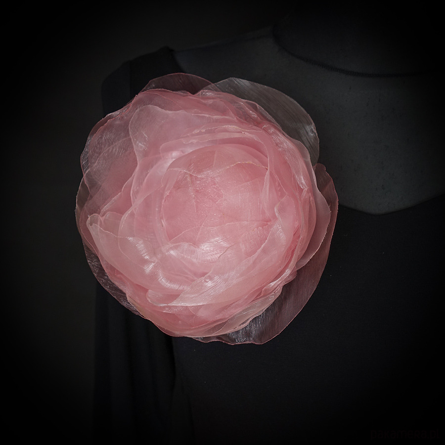 Delikatna, a zarazem wyrazista broszka w intensywnym odcieniu fuksji. Wykonana ręcznie z lekkiej organzy, pięknie układa się na ubraniu i dodaje stylizacji kobiecego uroku.