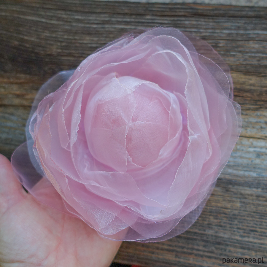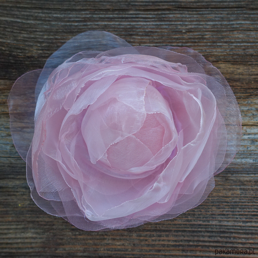 🌸 Pudrowo-różowa broszka – kwiat z organzy