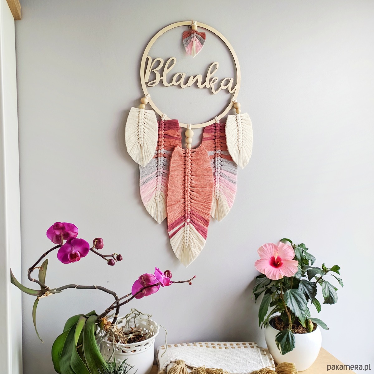 Różowy makramowy łapacz snów z imieniem, urodzinowy prezent