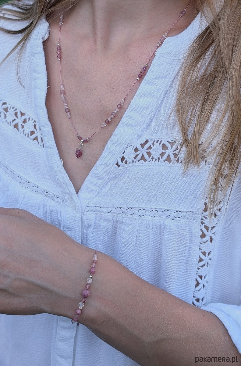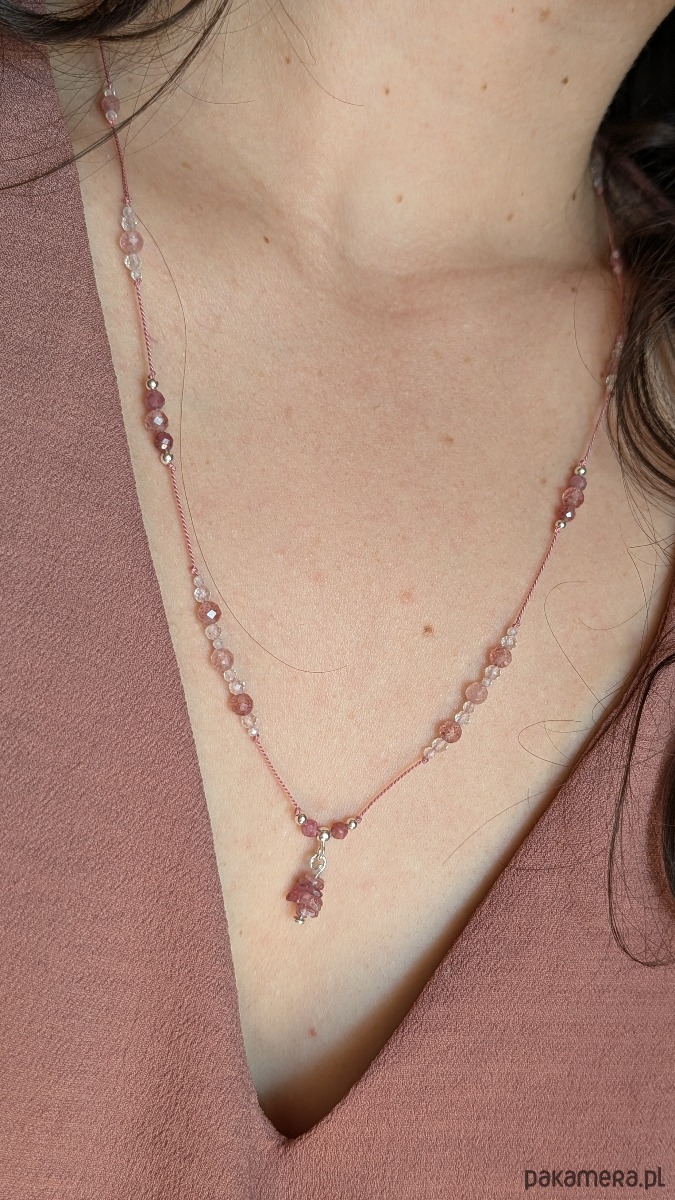 Unikatowy naszyjnik na różowej nici jedwabnej, stworzony z rodonitów, truskawkowych kryształów górskich i cyrkonii. Dodatkowo w centralnej części znajdują się nieregularne bryłki różowych turmalinów w formie zawieszki.