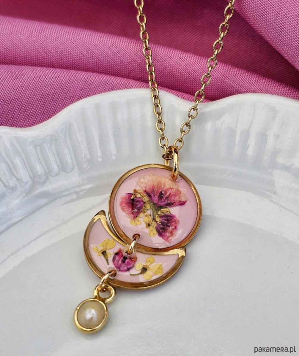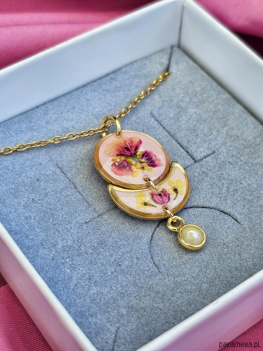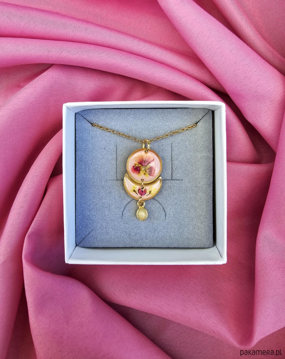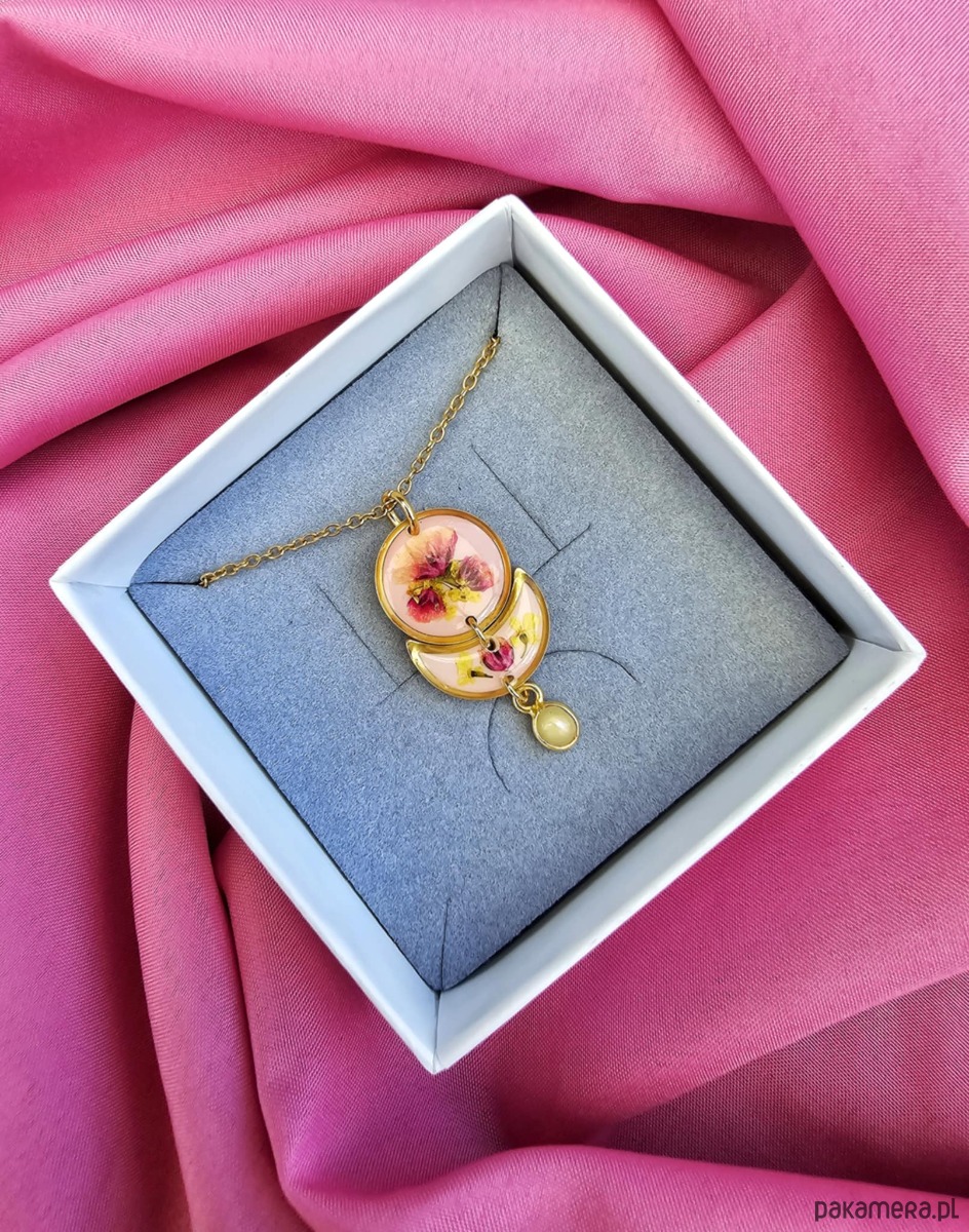 Naszyjnik z kwiatami suszonej gipsówki i dzikiej marchwii to unikatowa, ręcznie wykonana biżuteria z serii Harmonia.
