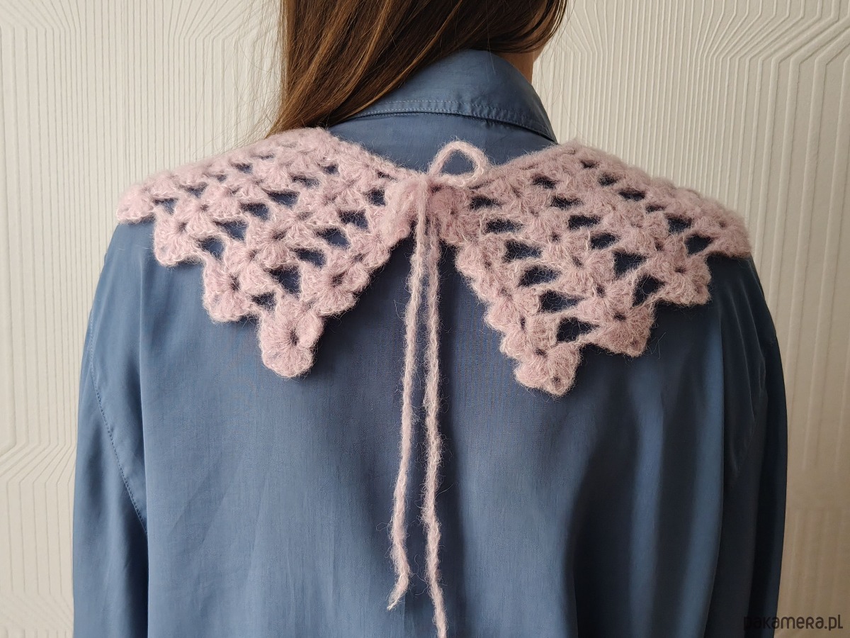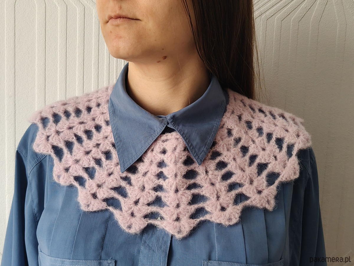 Stylowy koronkowy kołnierzyk wykonany ręcznie z włóczki na szydełku.