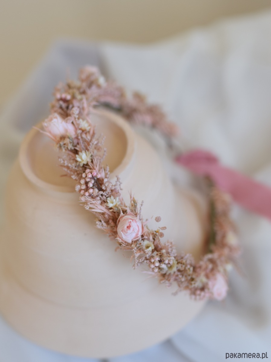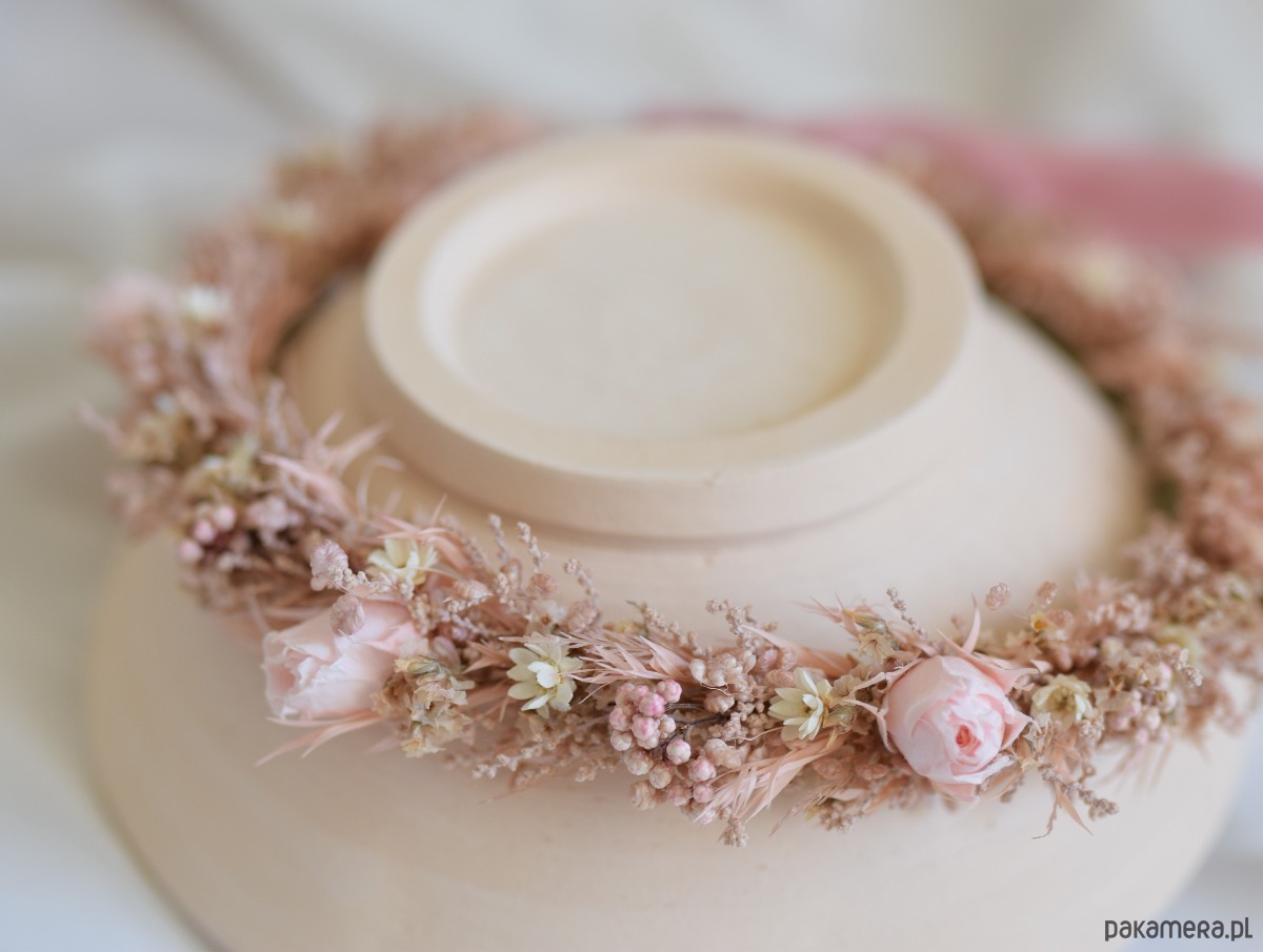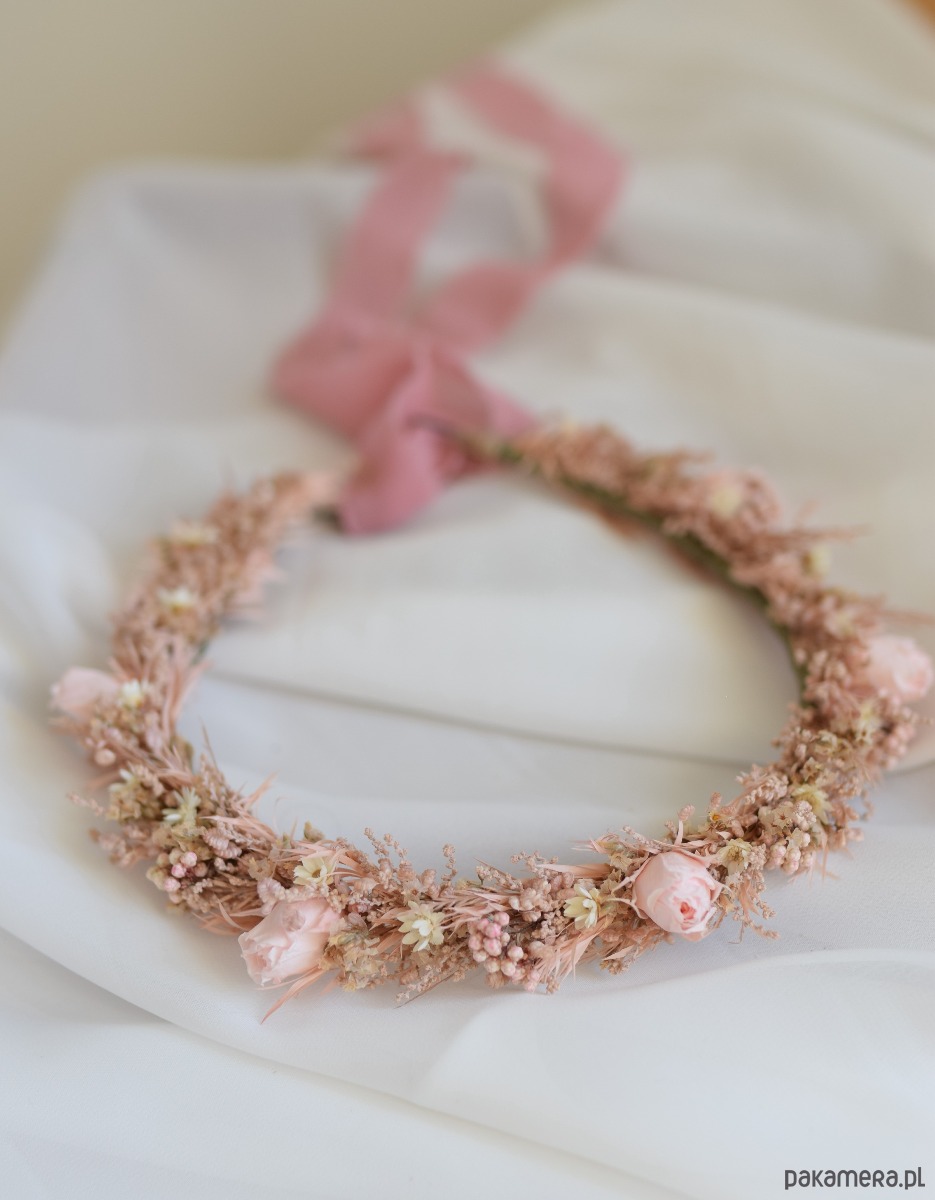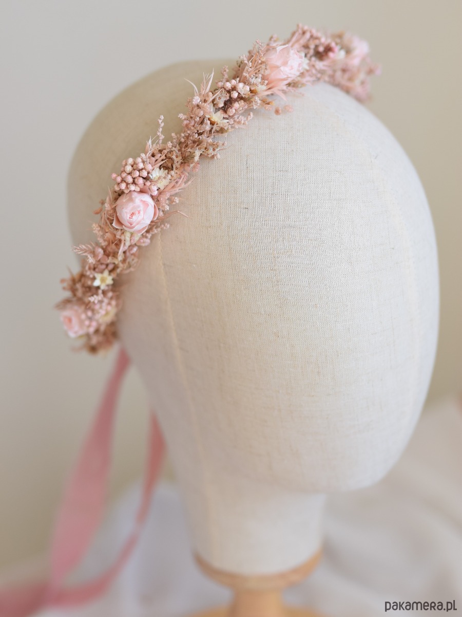 Romantyczny różowy wianek na głowę wykonany ręcznie z suszonych i stabilizowanych roślin w odcieniach vintage pink, pudrowego różu i ecru. Kompozycja oparta na naturalnych kwiatach, takich jak róże, limonium, melaleuca, rice flowers, glixia i stoebe, tworzy subtelną, lekką ozdobę o bardzo dziewczęcym i delikatnym charakterze.