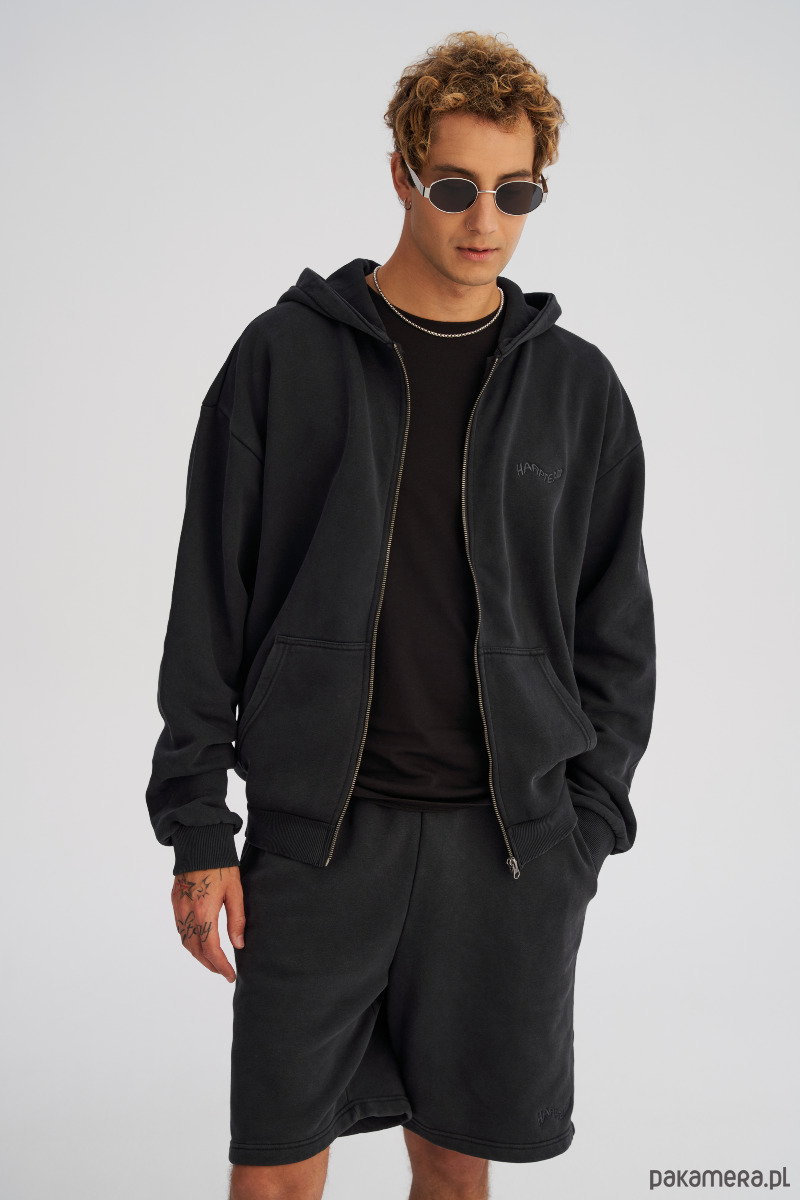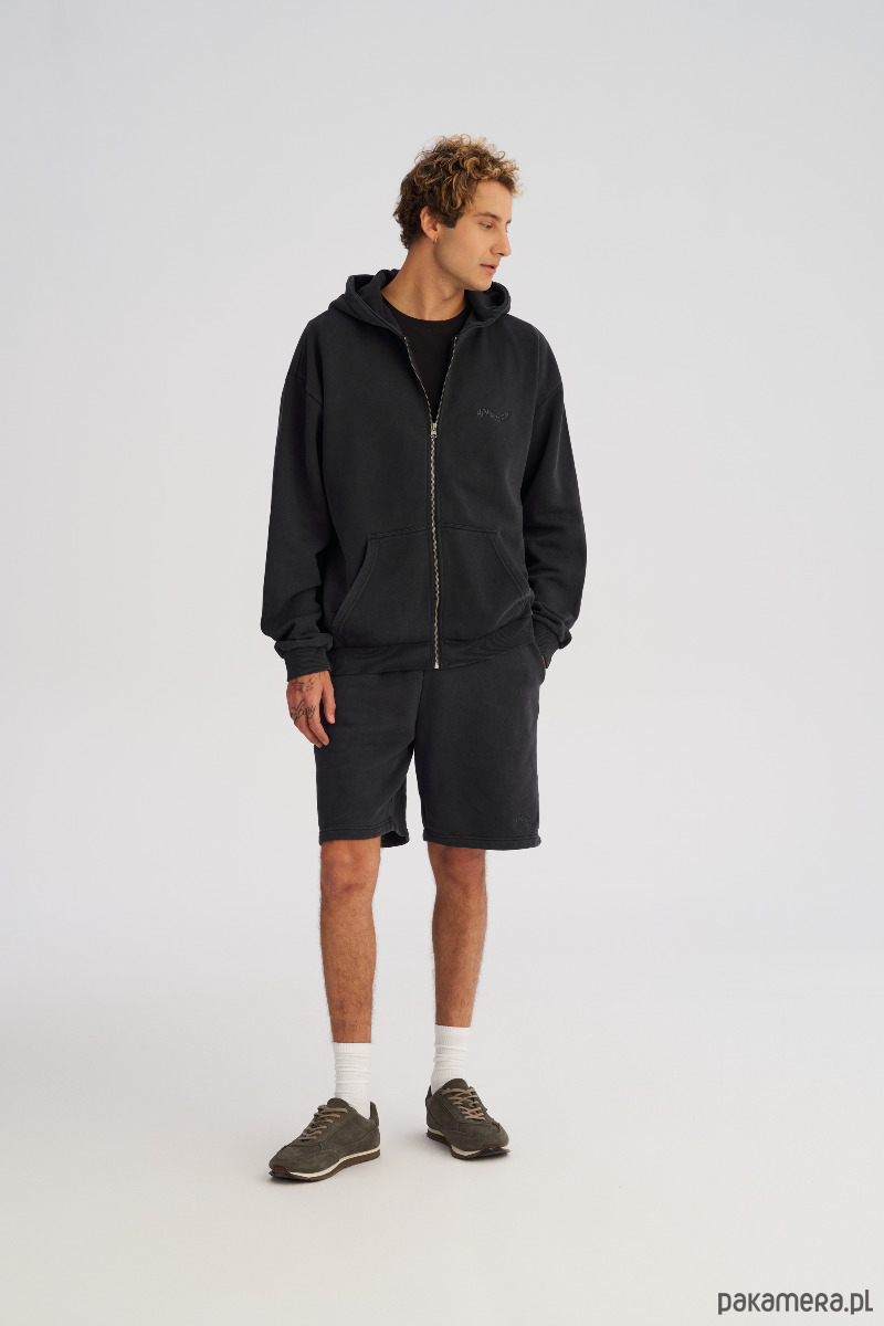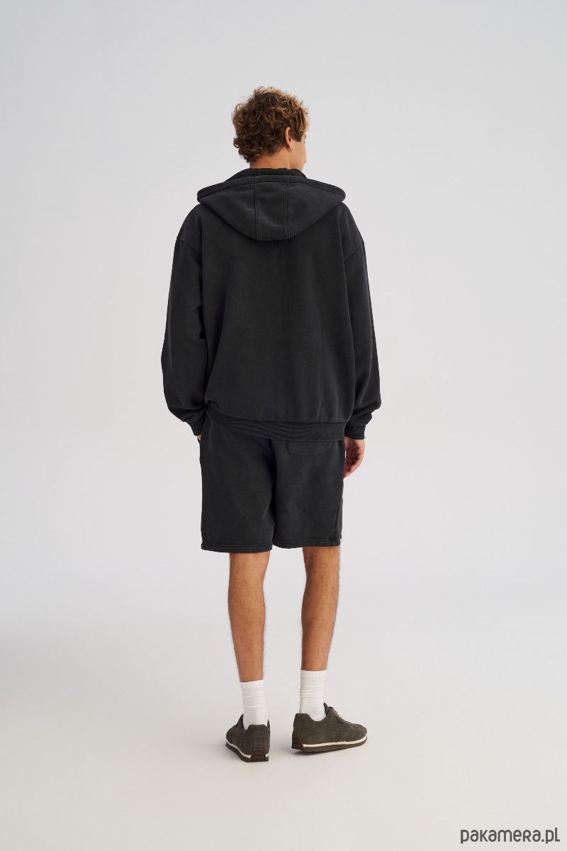 Rozpinana bluza z kapturem wykonana z grubszej, zbitej dzianiny o efekcie lekkiego sprania. Materiał ma solidną strukturę, a dzięki szczotkowanemu wykończeniu miękko się układa i nie jest sztywny. Z przodu suwak na całej długości, naszyte kieszenie boczne oraz mały, subtelny haft na piersi. Rękawy i dół wykończone ściągaczami dla wygody i trzymania formy. Pasuje do codziennych miejskich zestawów, ale idealnie sprawdzi się też nonszalancko narzucona na klasyczny t-shirt podczas wieczornego wyjścia.