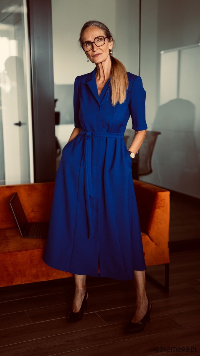 Krój sukienki podkreśla talię i wyrównuje proporcje między biodrami i ramionami.