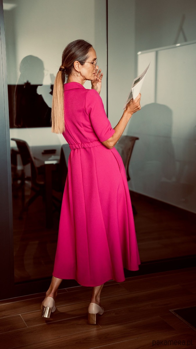 Krój sukienki podkreśla talię i wyrównuje proporcje między biodrami i ramionami.