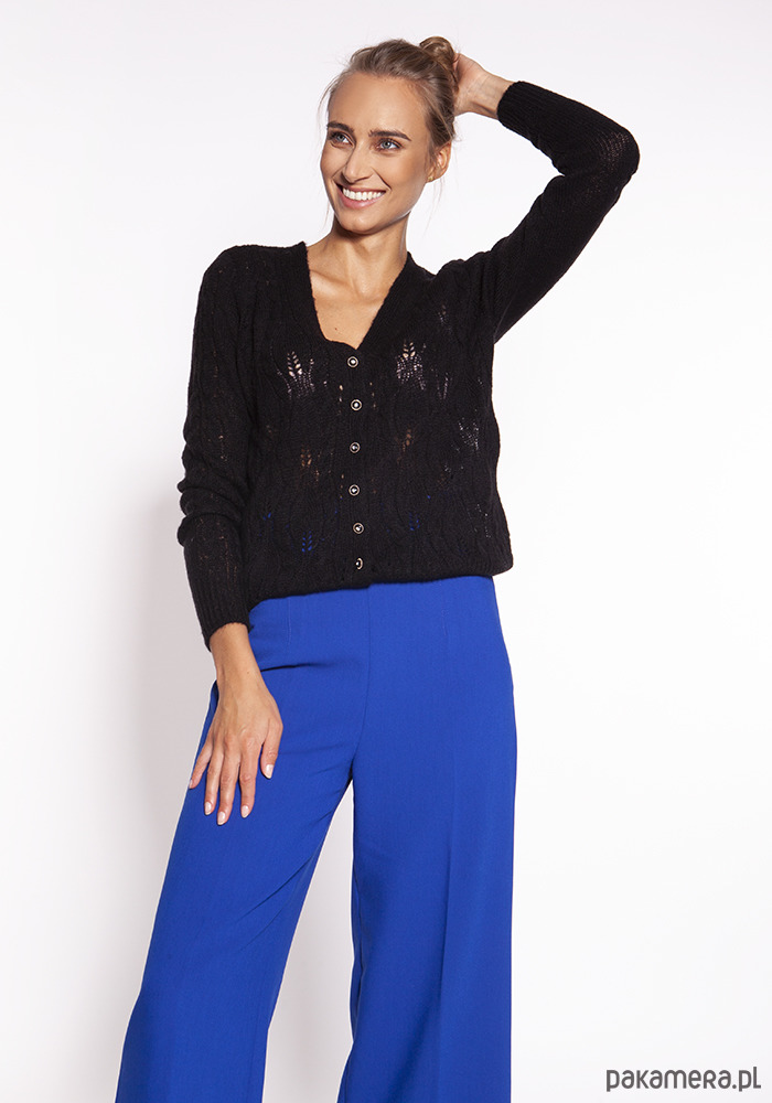 Rozpinany sweter z głębokim dekoltem w serek zdobią misterne ażury, które dodają mu elegancji i klasy. Lekki i praktyczny, bardzo przyjemny w dotyku - sprawdza się noszony na koszulę, t-shirt jak i bezpośrednio na bieliznę.