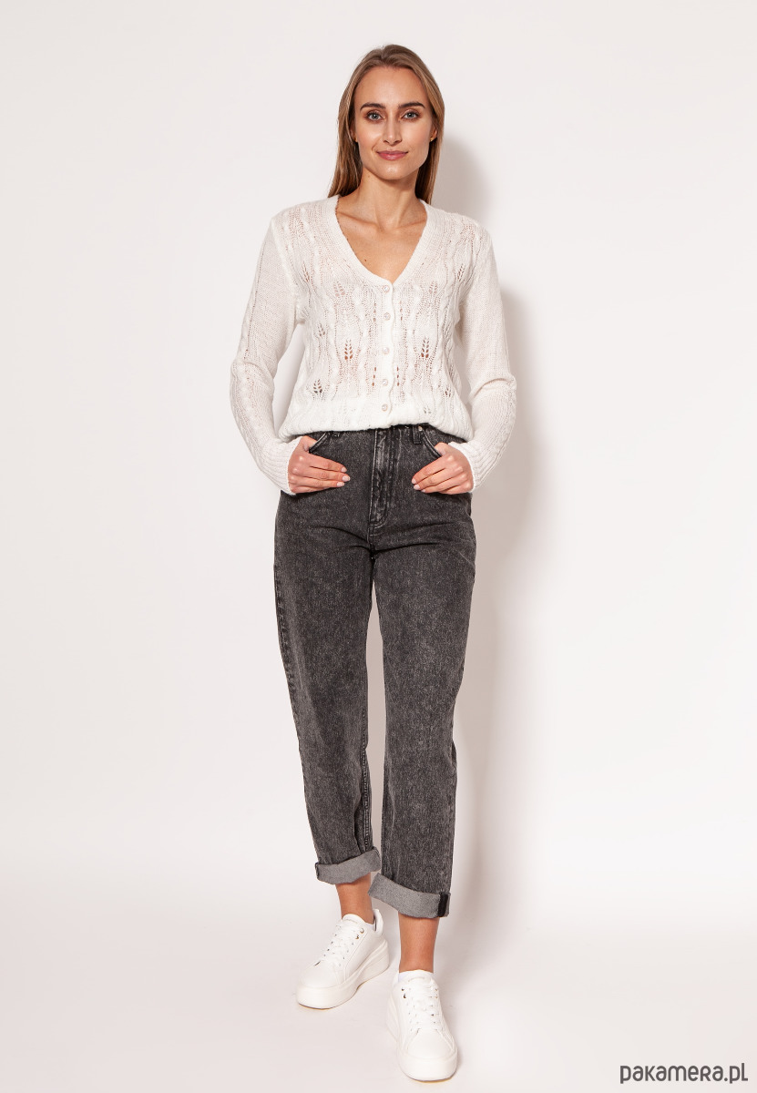 Rozpinany sweter z głębokim dekoltem w serek zdobią misterne ażury, które dodają mu elegancji i klasy. Lekki i praktyczny, bardzo przyjemny w dotyku - sprawdza się noszony na koszulę, t-shirt jak i bezpośrednio na bieliznę.