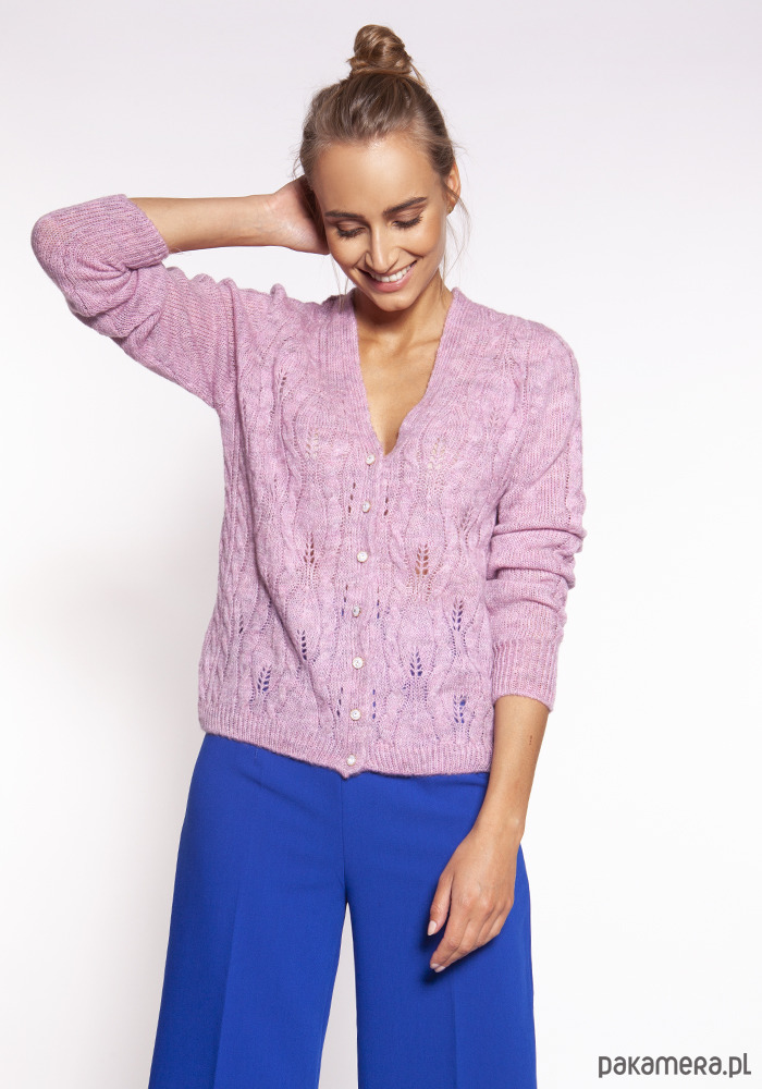 Rozpinany sweter z głębokim dekoltem w serek zdobią misterne ażury, które dodają mu elegancji i klasy. Lekki i praktyczny, bardzo przyjemny w dotyku - sprawdza się noszony na koszulę, t-shirt jak i bezpośrednio na bieliznę.