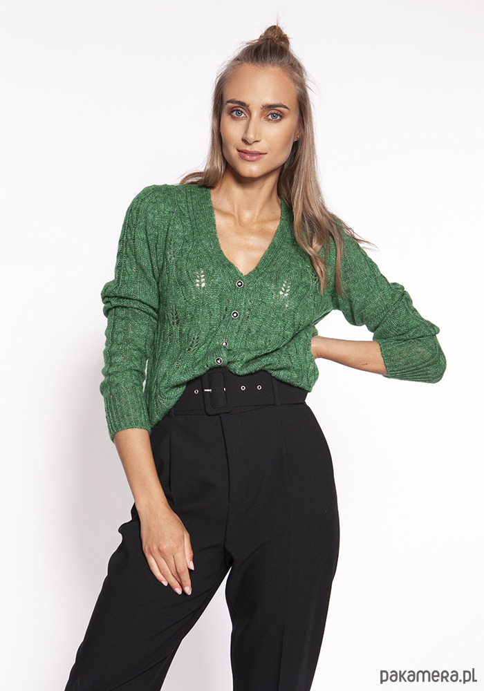 Rozpinany sweter z głębokim dekoltem w serek zdobią misterne ażury, które dodają mu elegancji i klasy. Lekki i praktyczny, bardzo przyjemny w dotyku - sprawdza się noszony na koszulę, t-shirt jak i bezpośrednio na bieliznę.