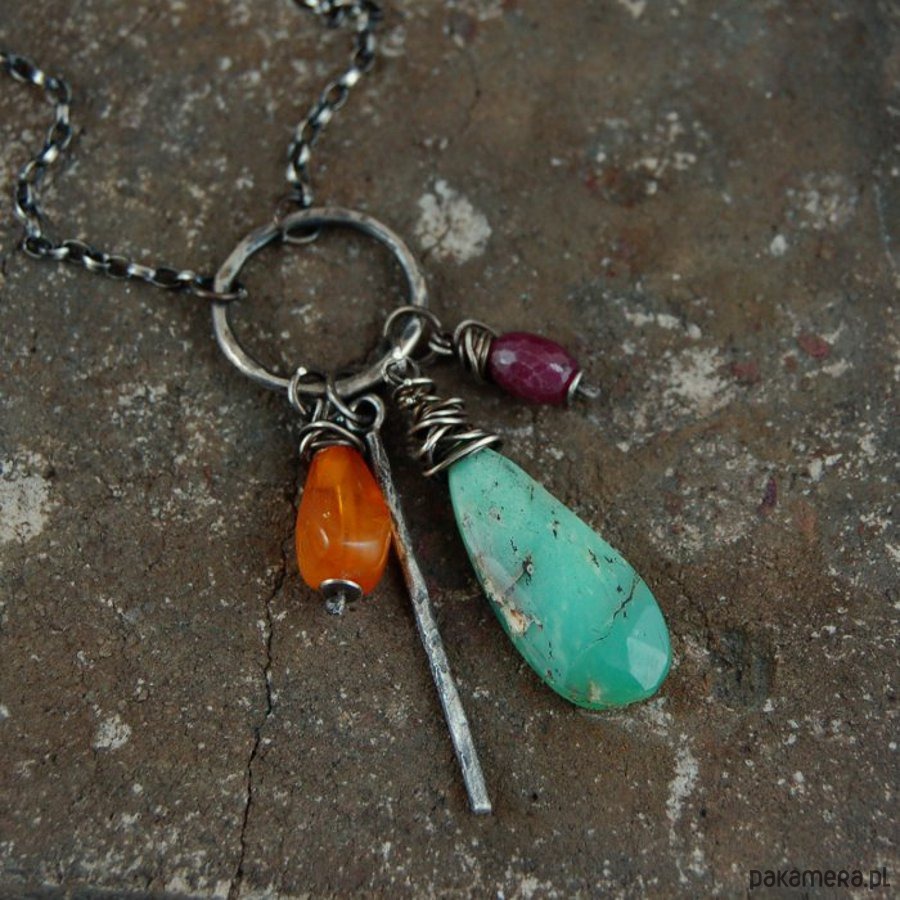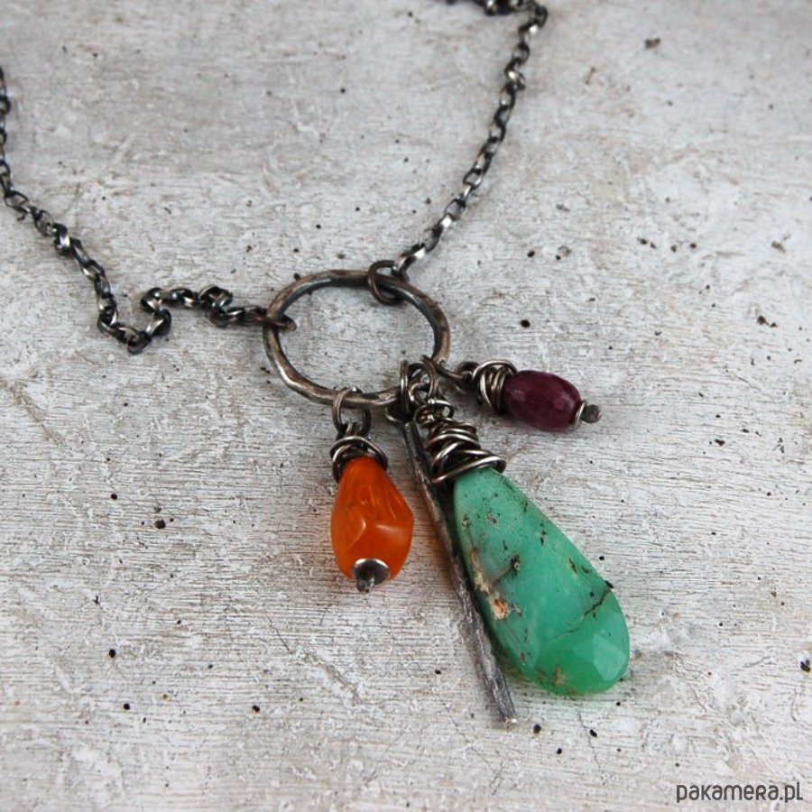 Naszyjnik z oksydowanego srebra, rubinu, bursztynu i chryzoprazu. Wielkość chryzoprazu 3 x 1,5 cm, bursztynu 1,5 cm, rubinu 0,6 x 1 cm, średnica kółka 2,2 cm, długość łańcuszka 46 cm.