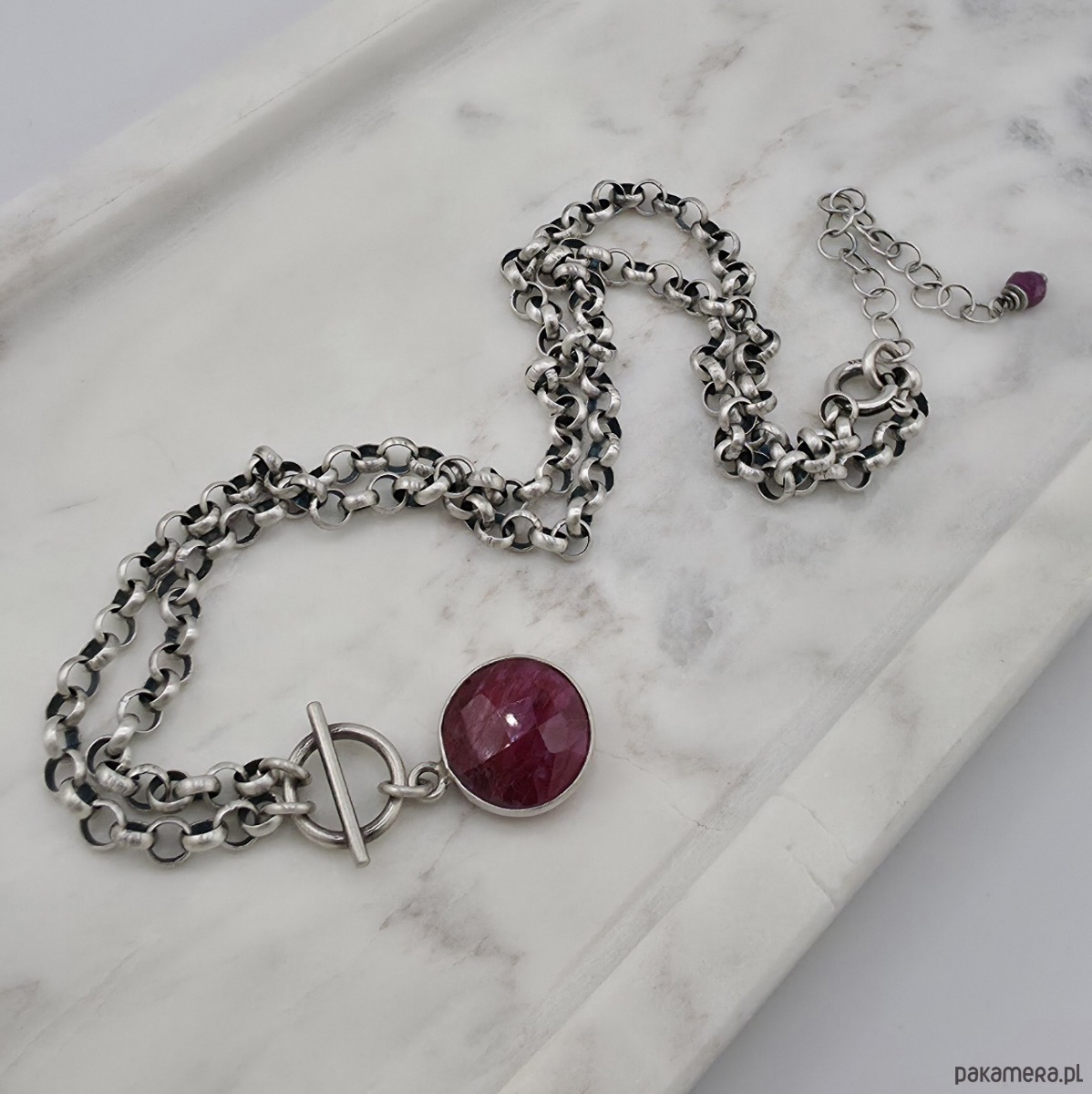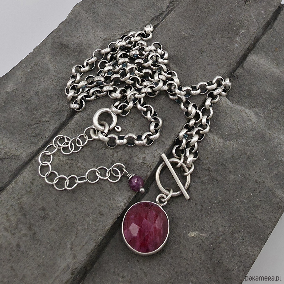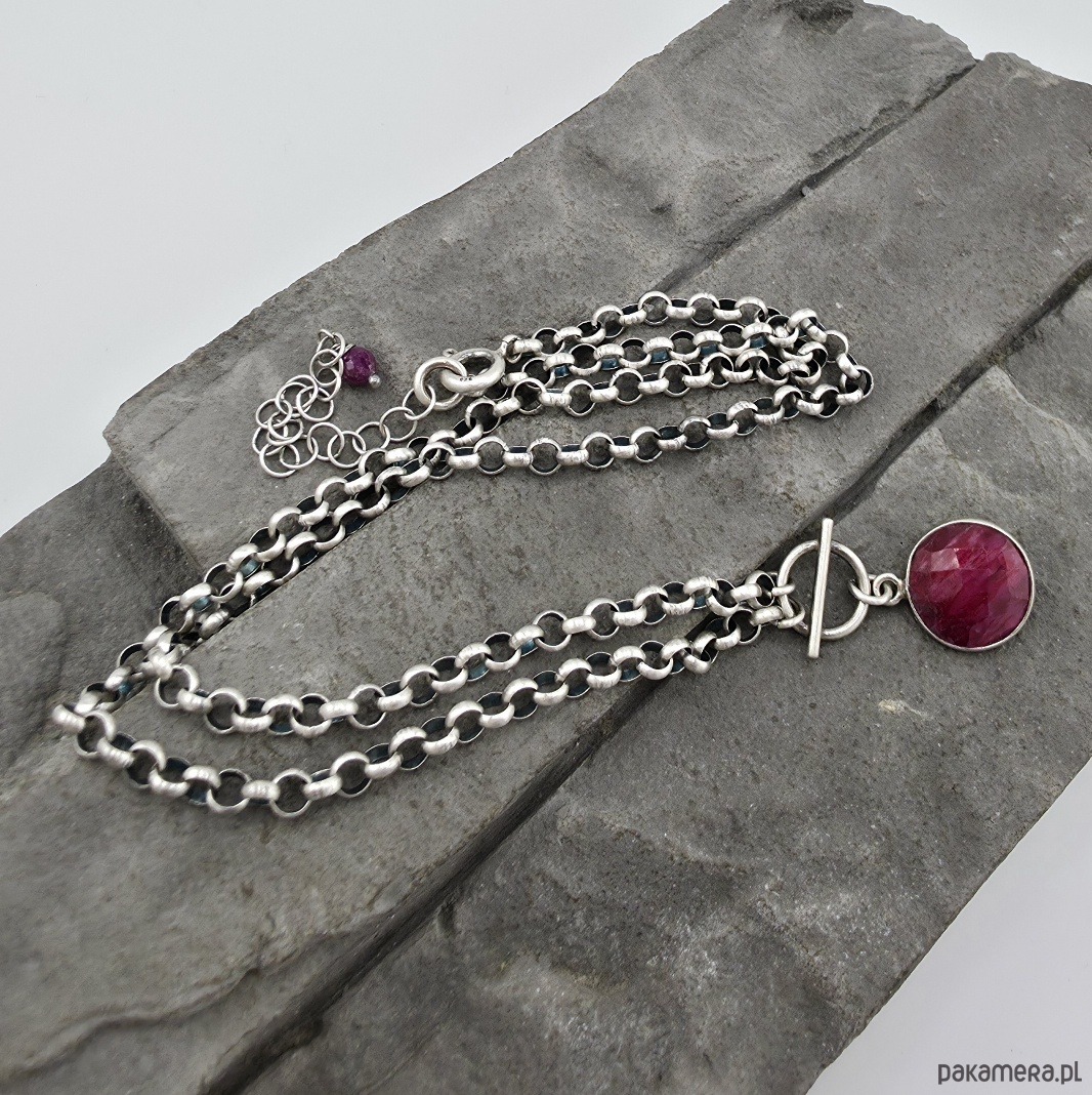 Kobiecy, modny naszyjnik na co dzień i nie tylko. Wykonany w całości z oksydowanego srebra próby 925 oraz fasetowanej monety rubinu oprawionej w srebro wielkosci aż 12 mm. Grubość łańcuszka to 3,8 mm. Obwód naszyjnika to 46 cm plus regulacja 5 cm. Na życzenie mogę go przedłużyć lub wykonac w wersji nieoksydowanej. W mojej galerii bransoletka do kompletu. Ozdobnie zapakowany.