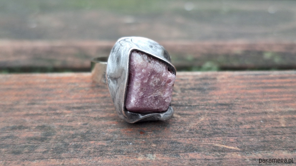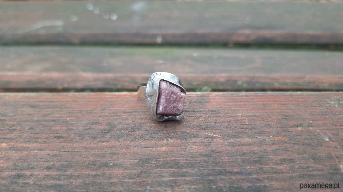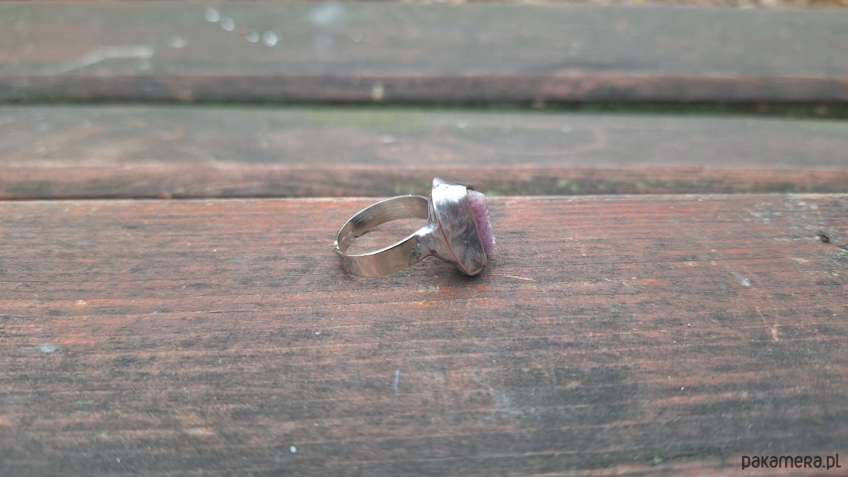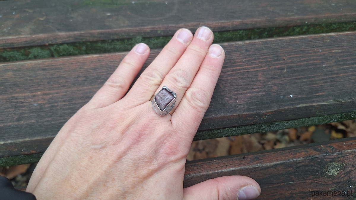 Pierścionek wykonany z miedzi, cyny i rubinu. Wymiary ok. 1.8 na 1 cm. Regulowany. Nie jest ciężki.