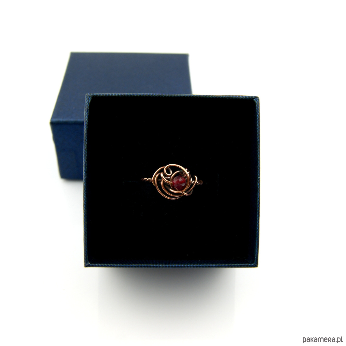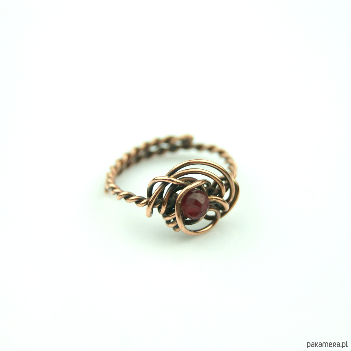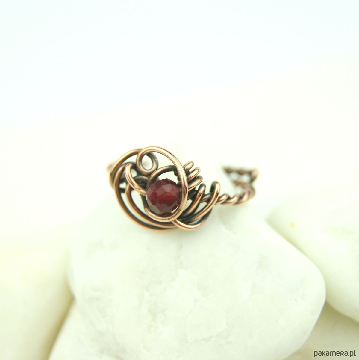Pierścionek wykonany w pracochłonnej technice wire wrappingu. Centralnym punktem jest tu rubin, który został misternie opleciony miedzią. Pierścionek w uniwersalnym rozmiarze, możliwość regulacji.