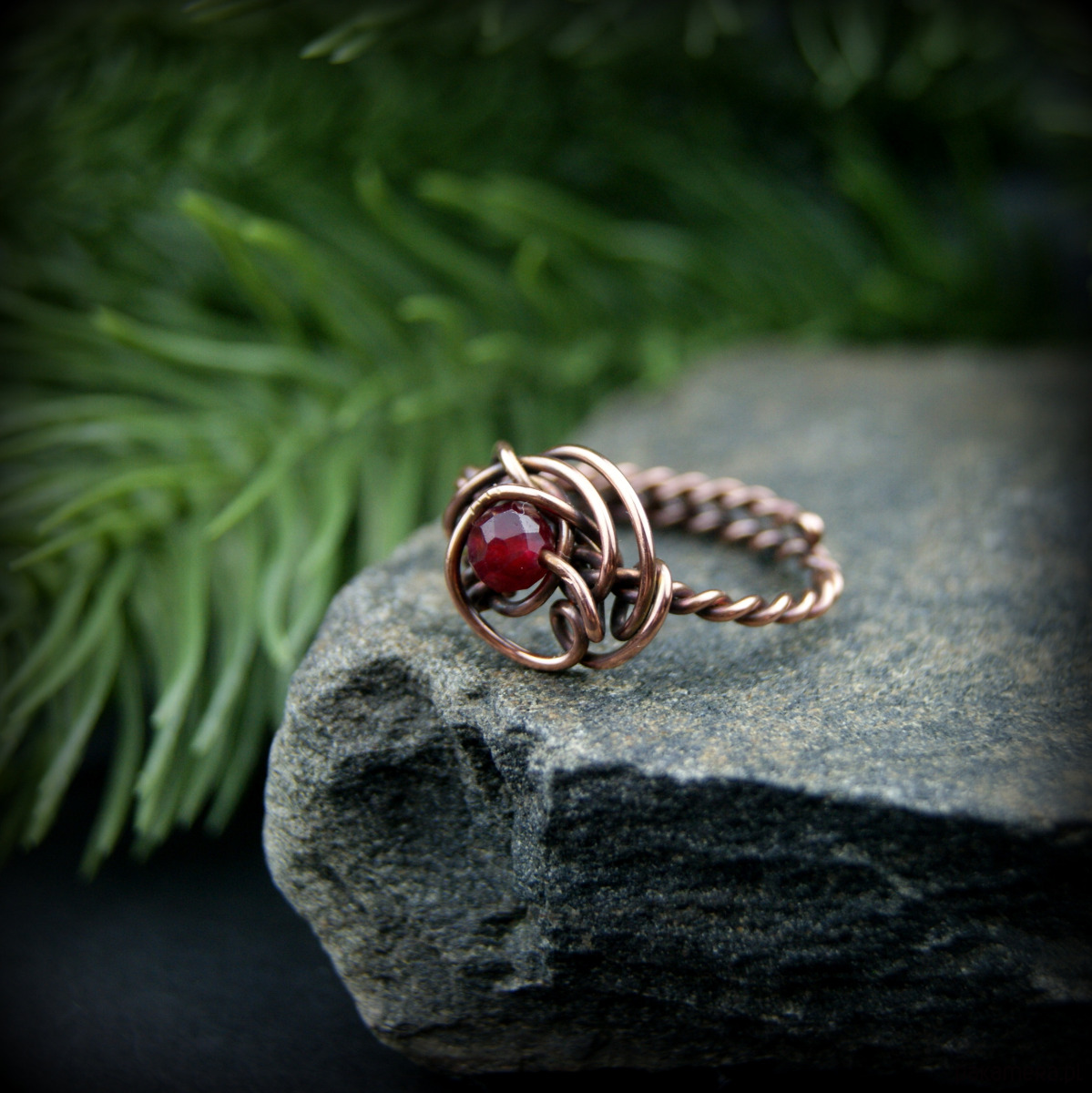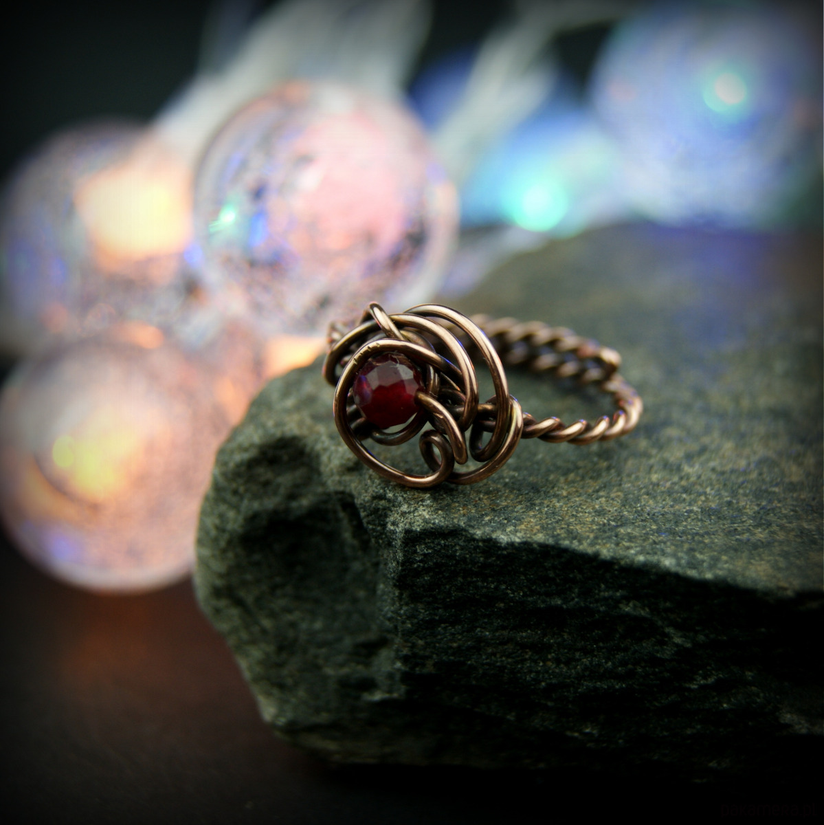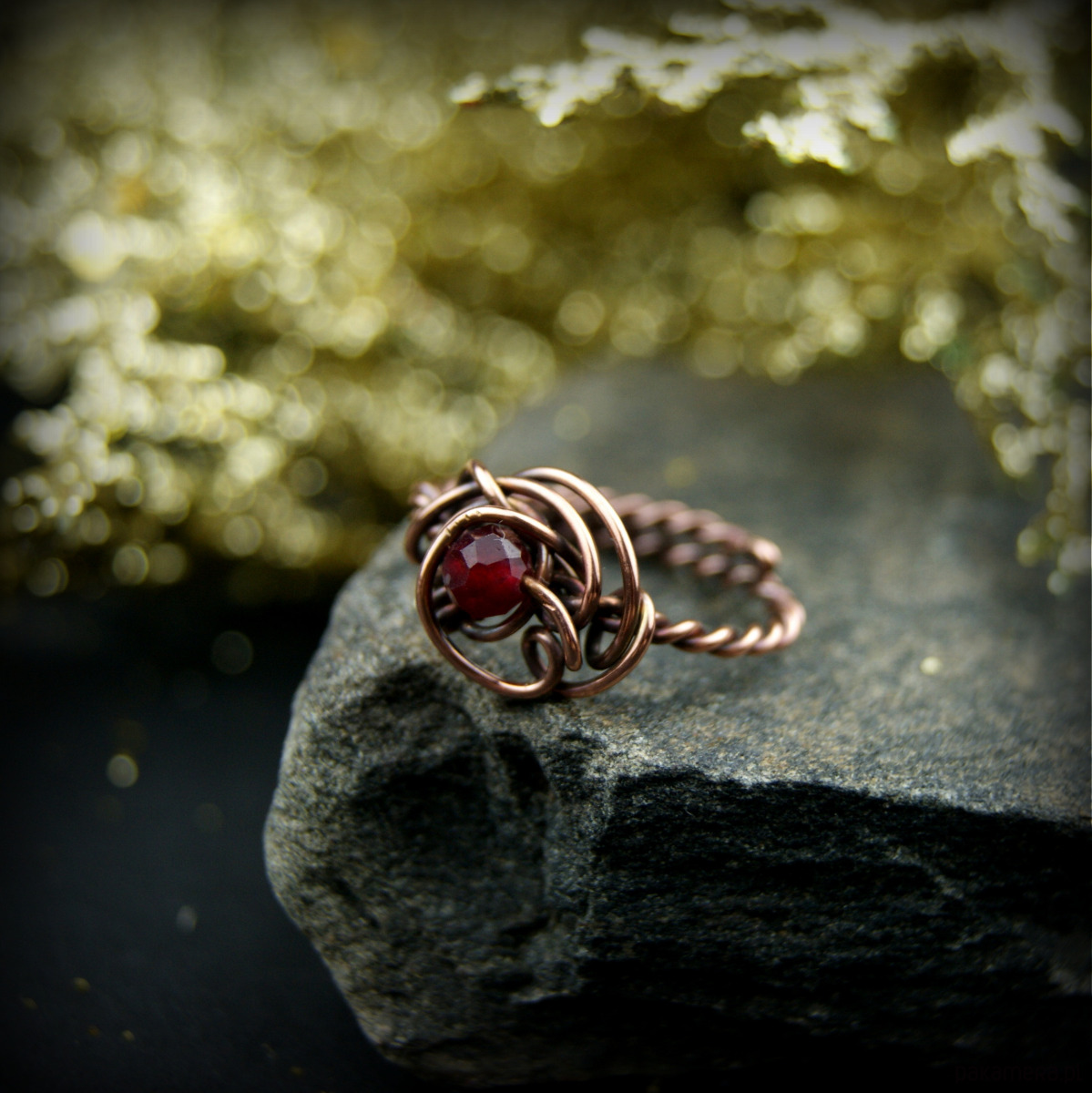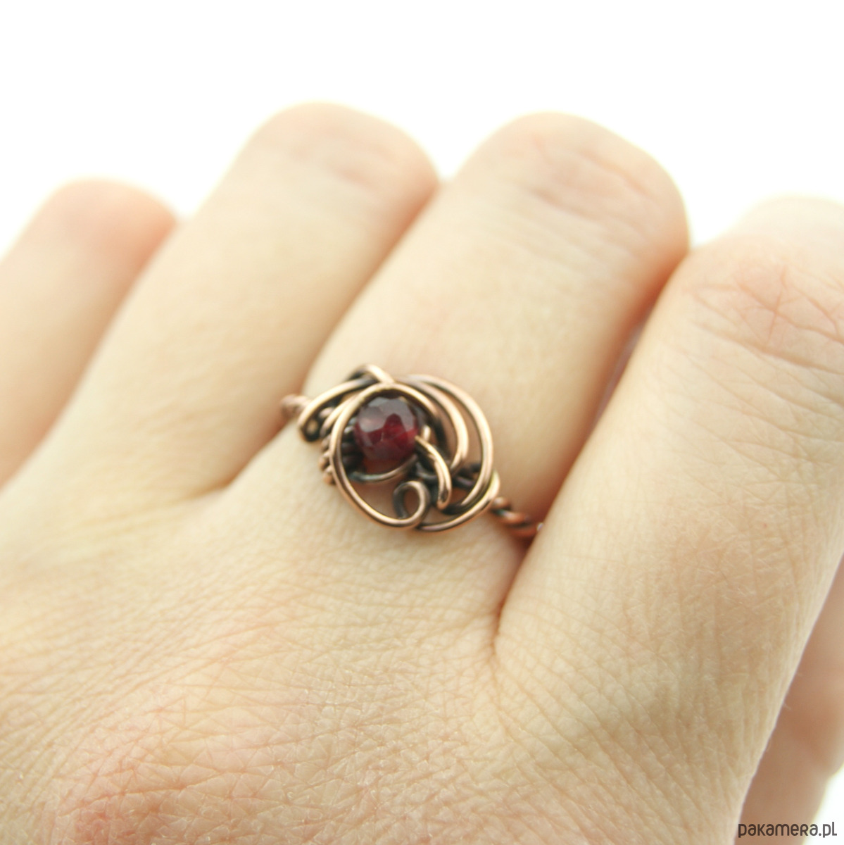 Pierścionek wykonany w pracochłonnej technice wire wrappingu. Centralnym punktem jest tu rubin, który został misternie opleciony miedzią. Pierścionek w uniwersalnym rozmiarze, możliwość regulacji.