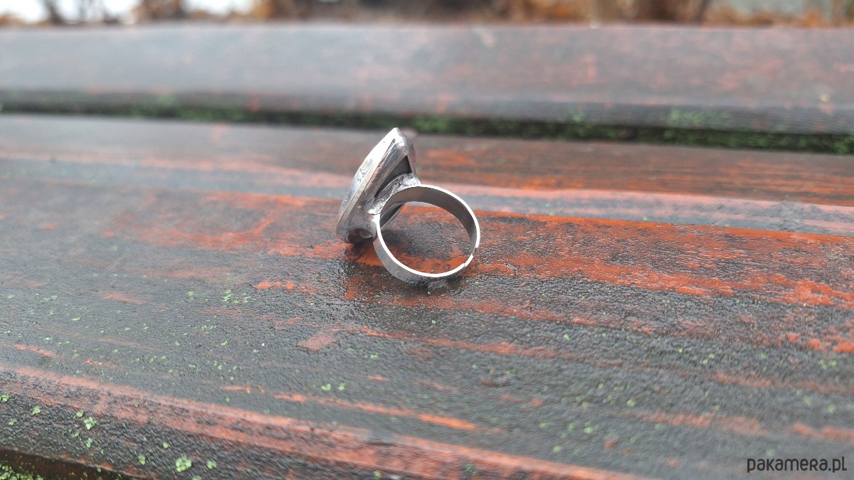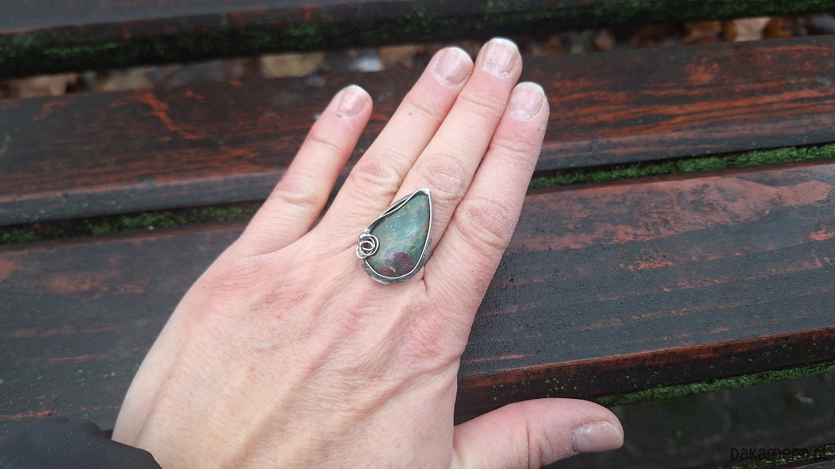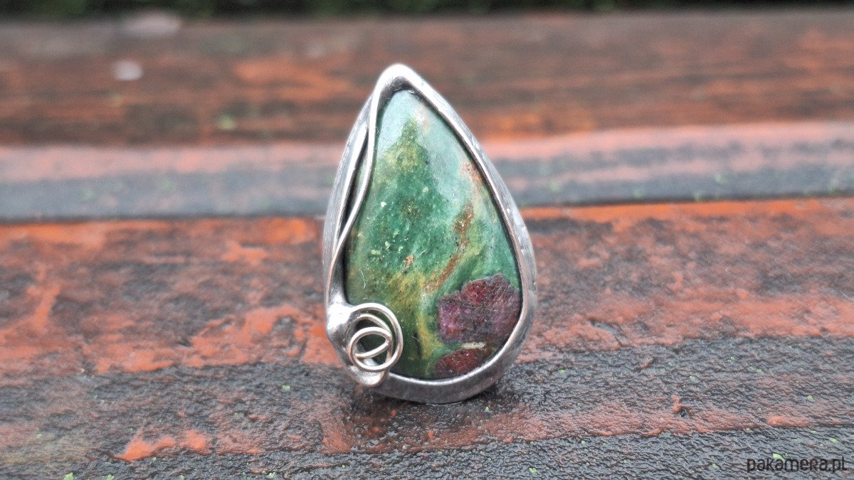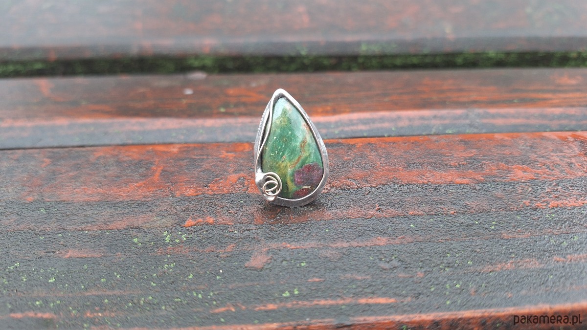 Pierścionek wykonany z miedzi, cyny i rubinu w fuksycie. Wymiary ok. 3 na 1.8 cm. Regulowany. Nie jest ciężki.