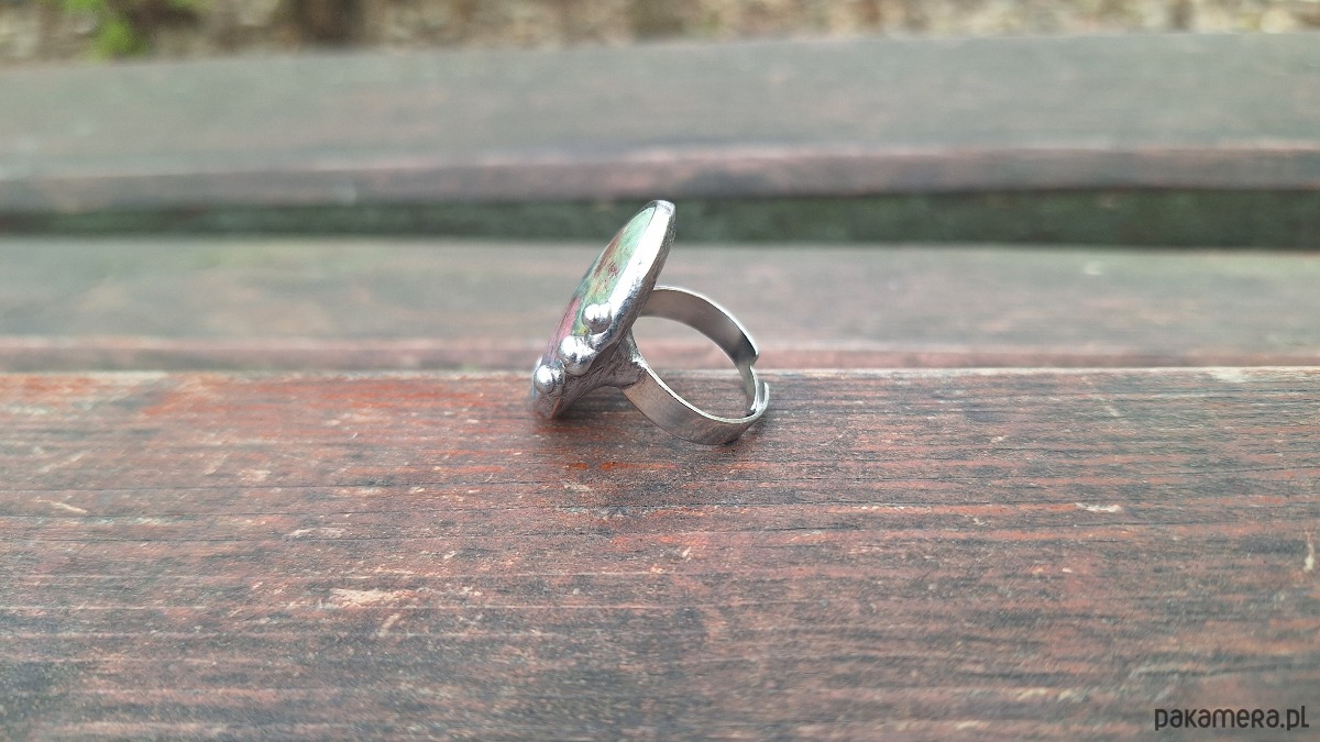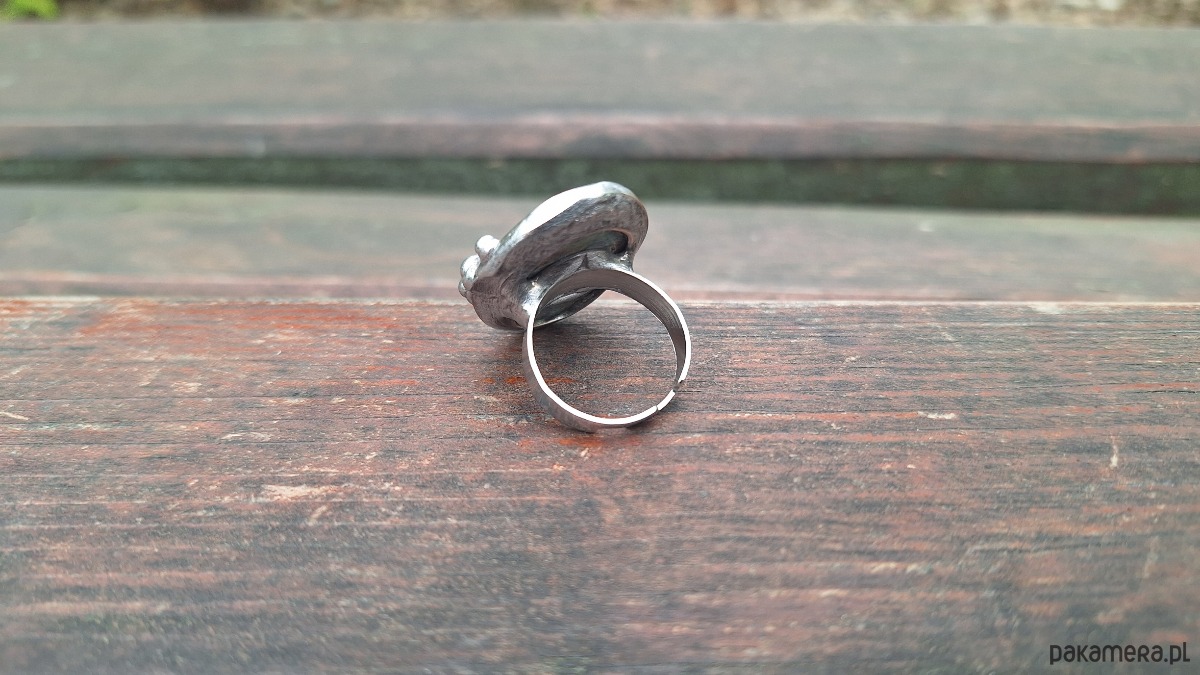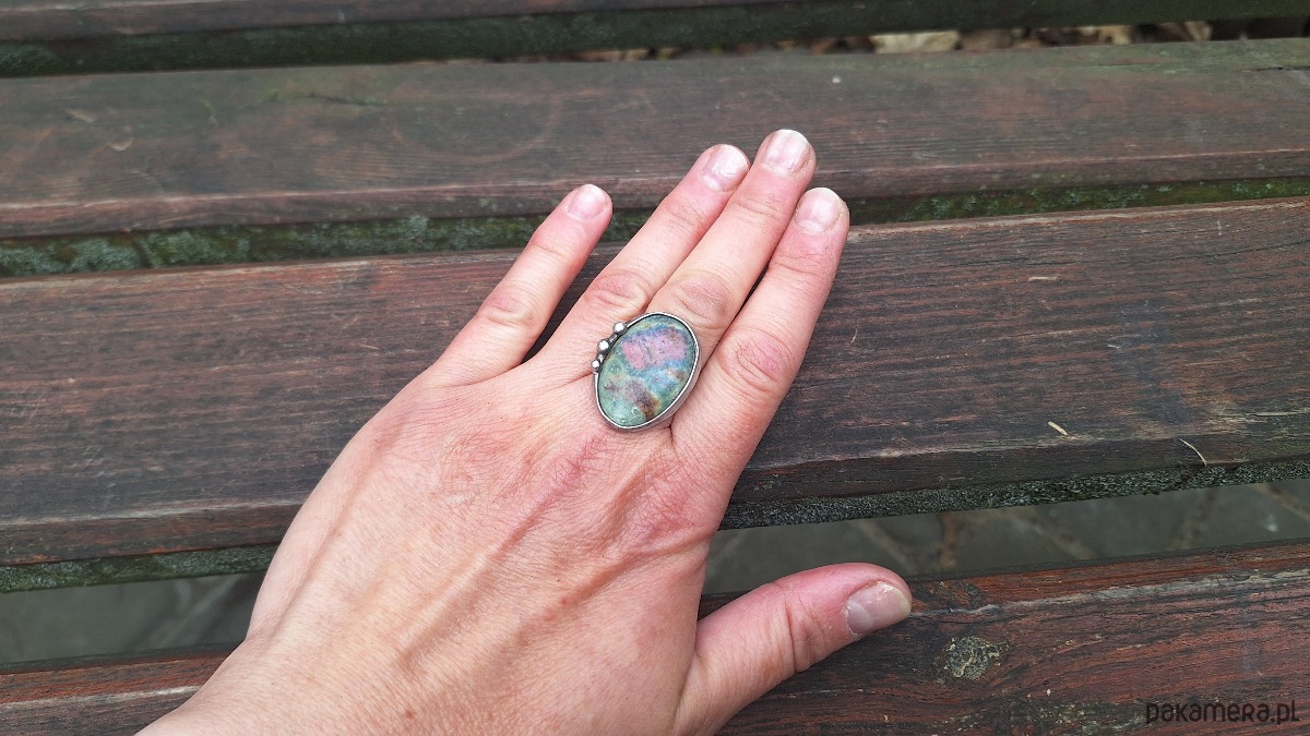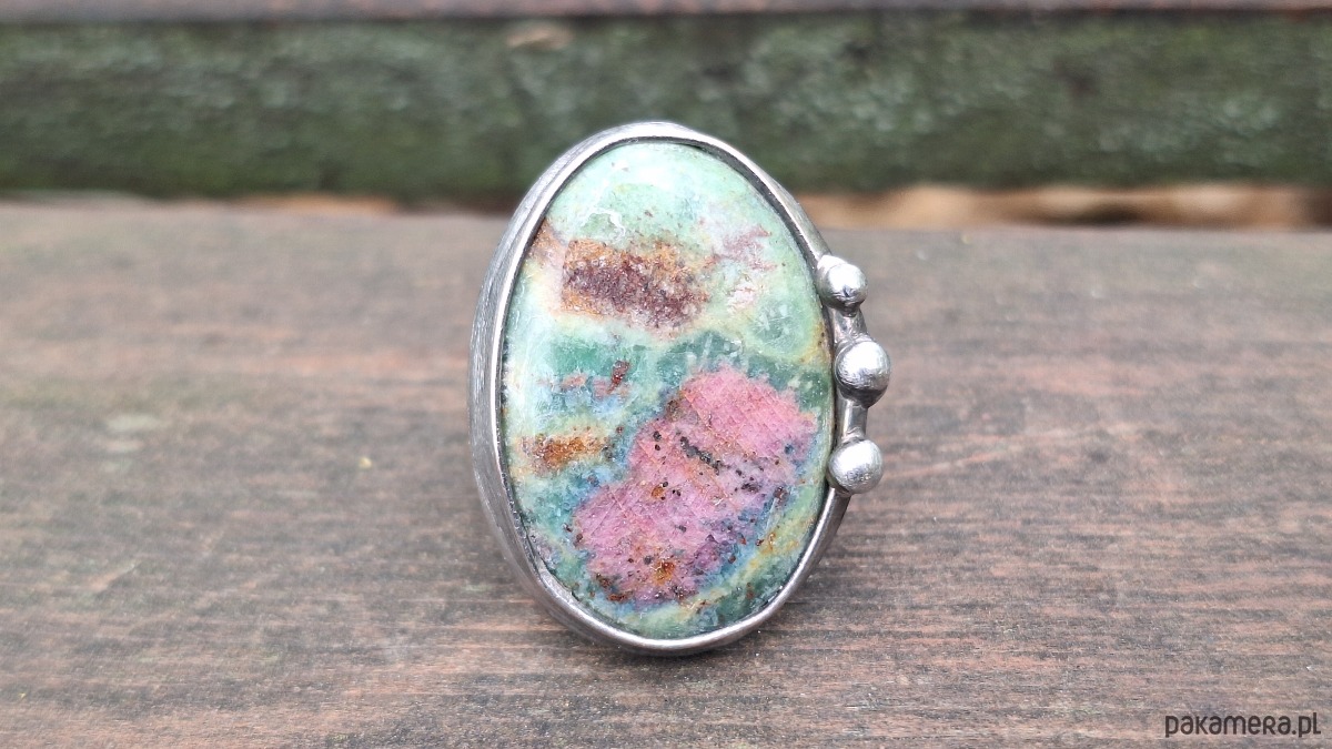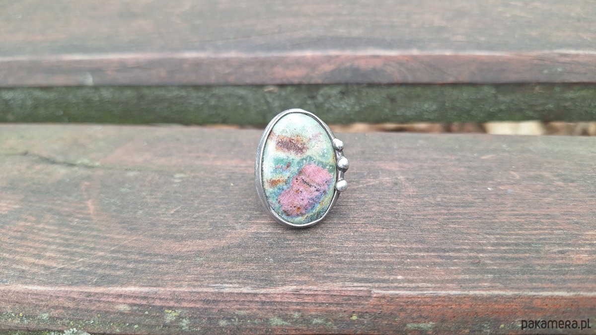 Pierścionek wykonany z miedzi, cyny i rubinu w fuksycie. Wymiary ok. 3 na 2 cm. Regulowany. Nie jest ciężki.