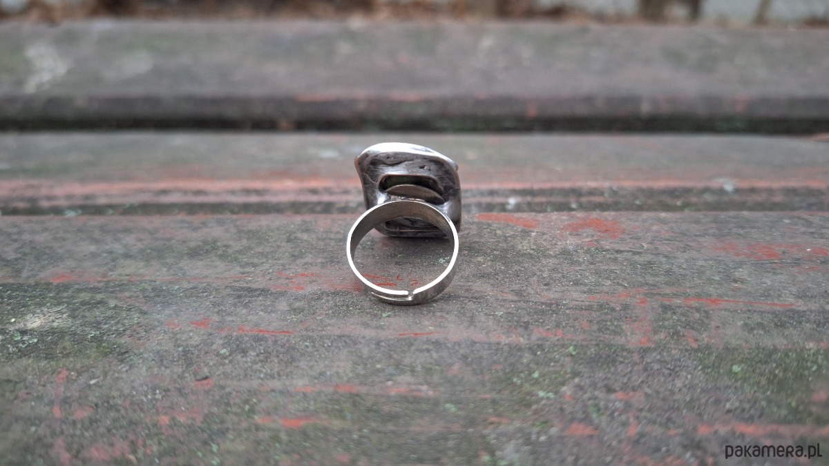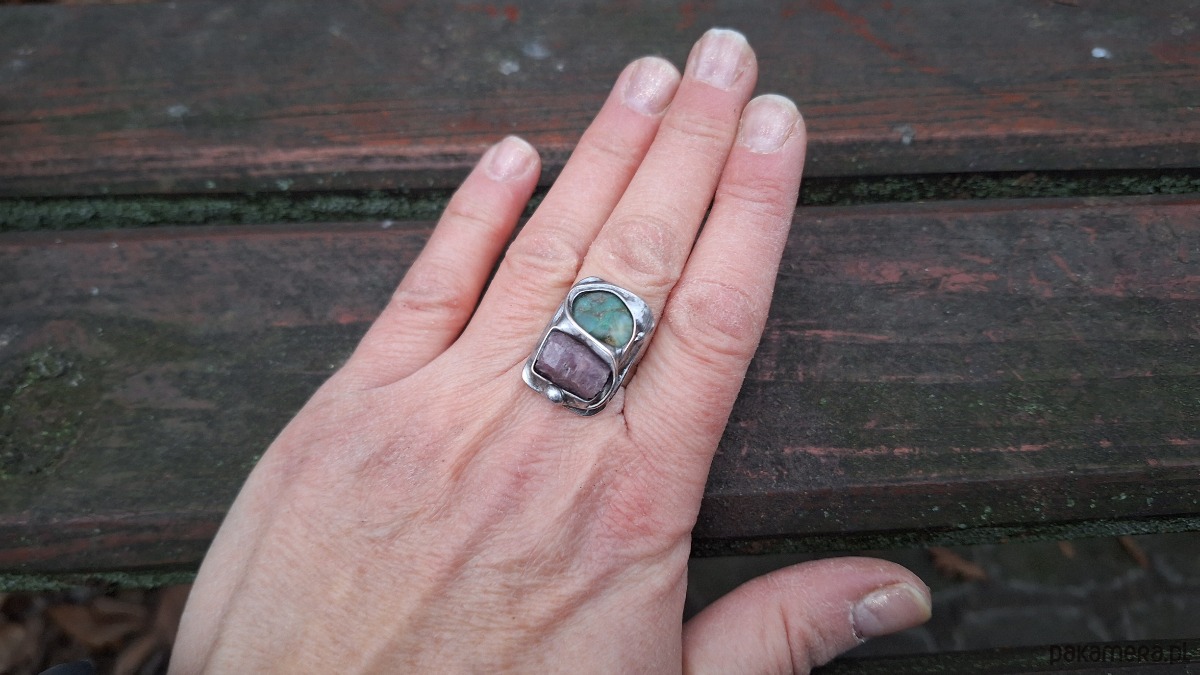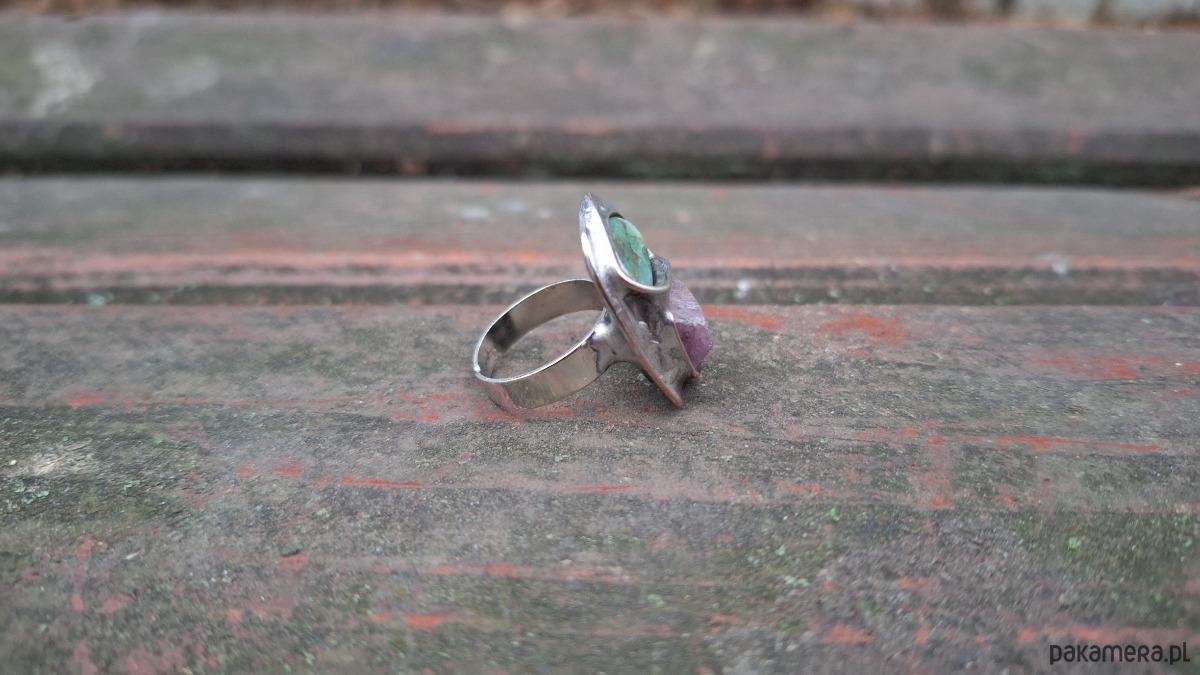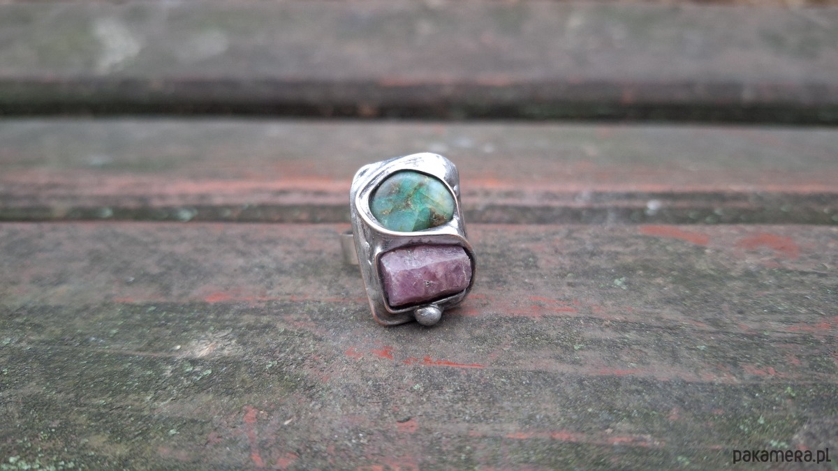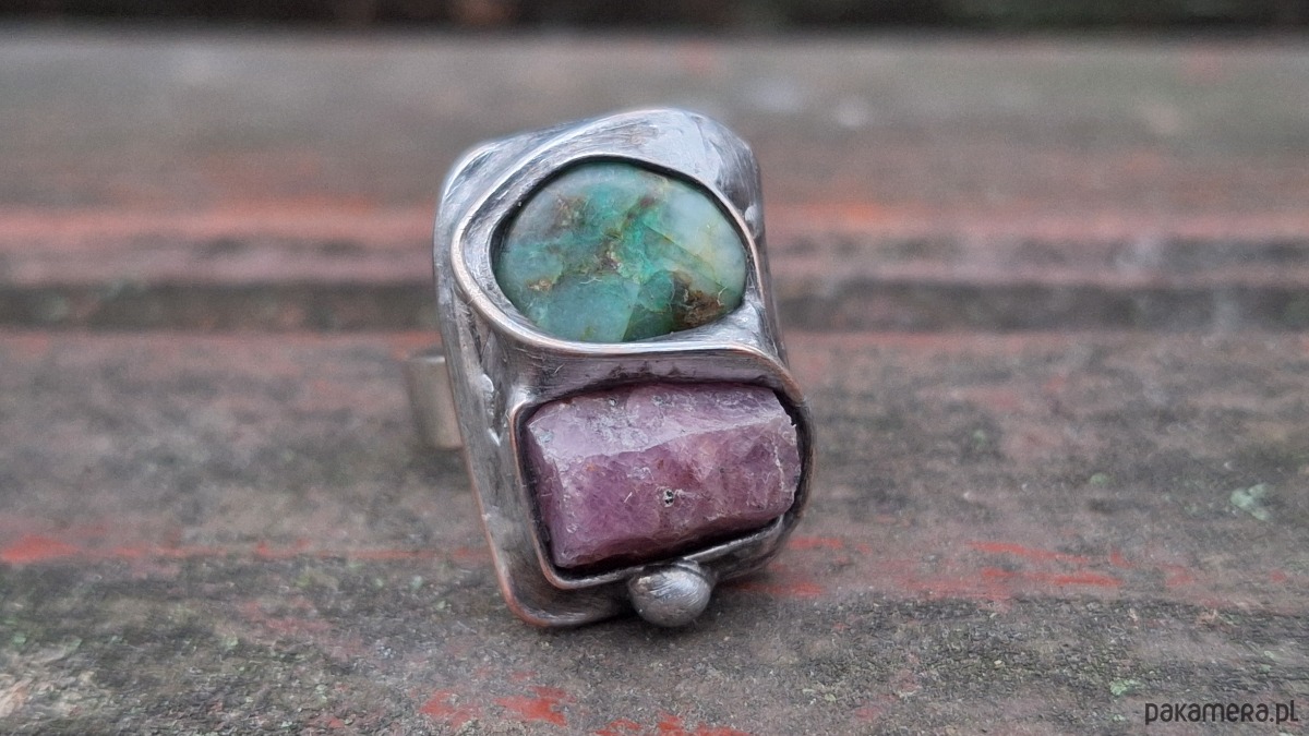 Pierścionek wykonany z miedzi, cyny, chryzoprazu i rubinu. Wymiary ok. 2.2 na 1.6 cm. Regulowany. Nie jest ciężki.