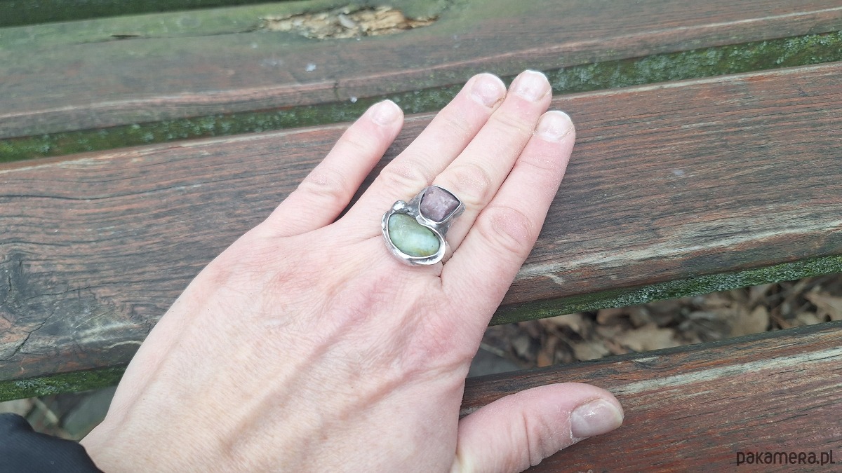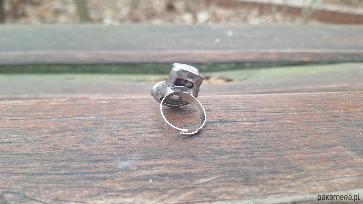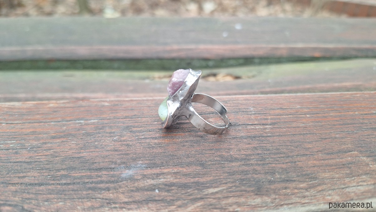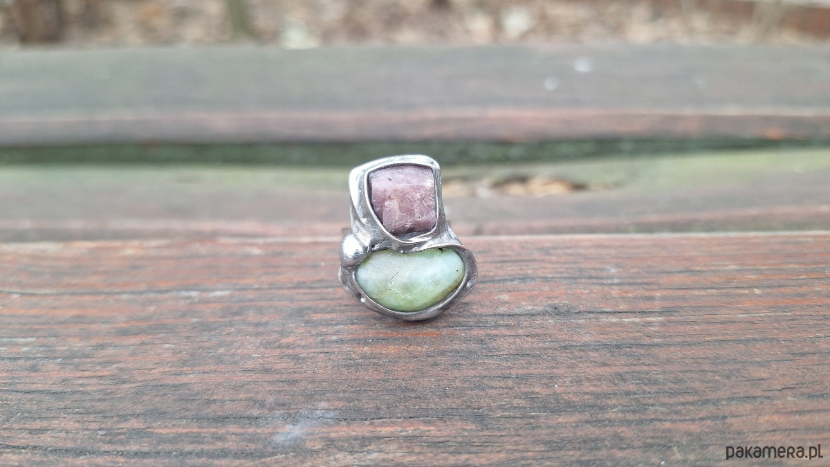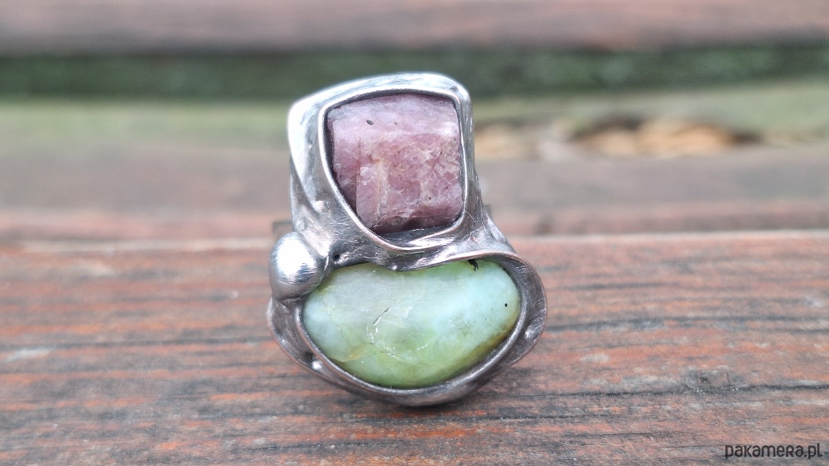 Pierścionek wykonany z miedzi, cyny, chryzoprazu i rubinu. Wymiary ok. 2.3 na 2 cm. Regulowany. Nie jest ciężki.