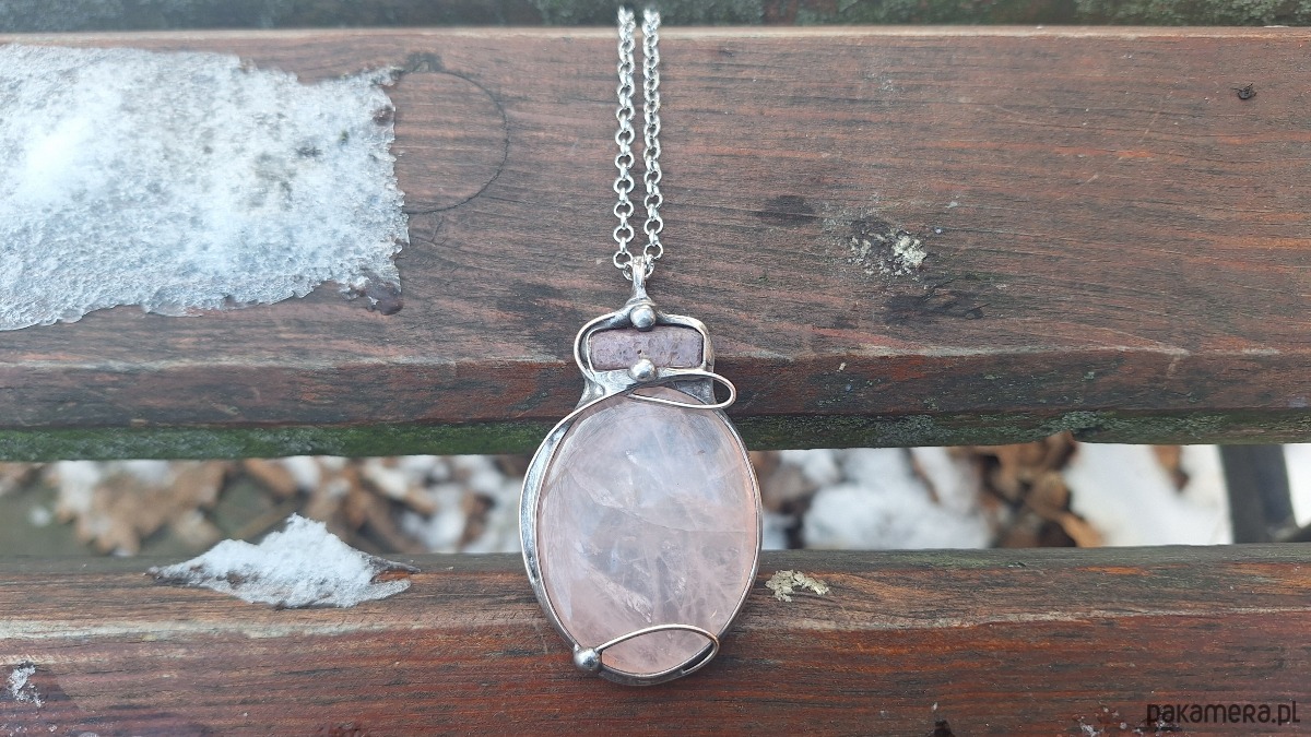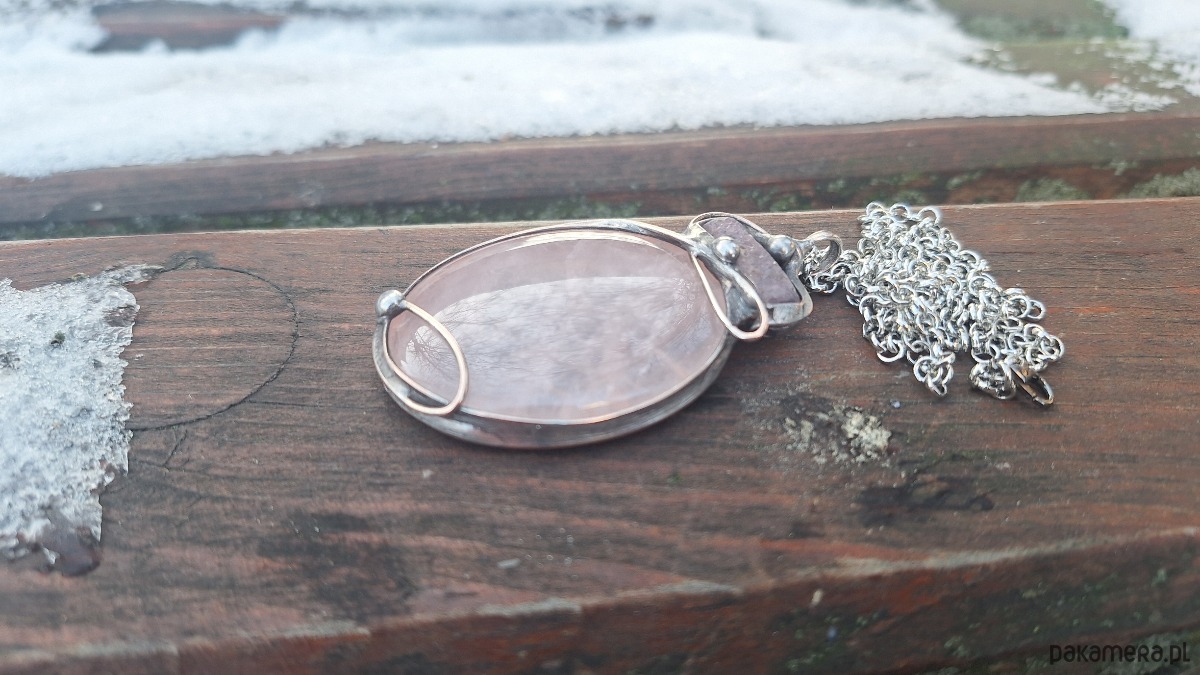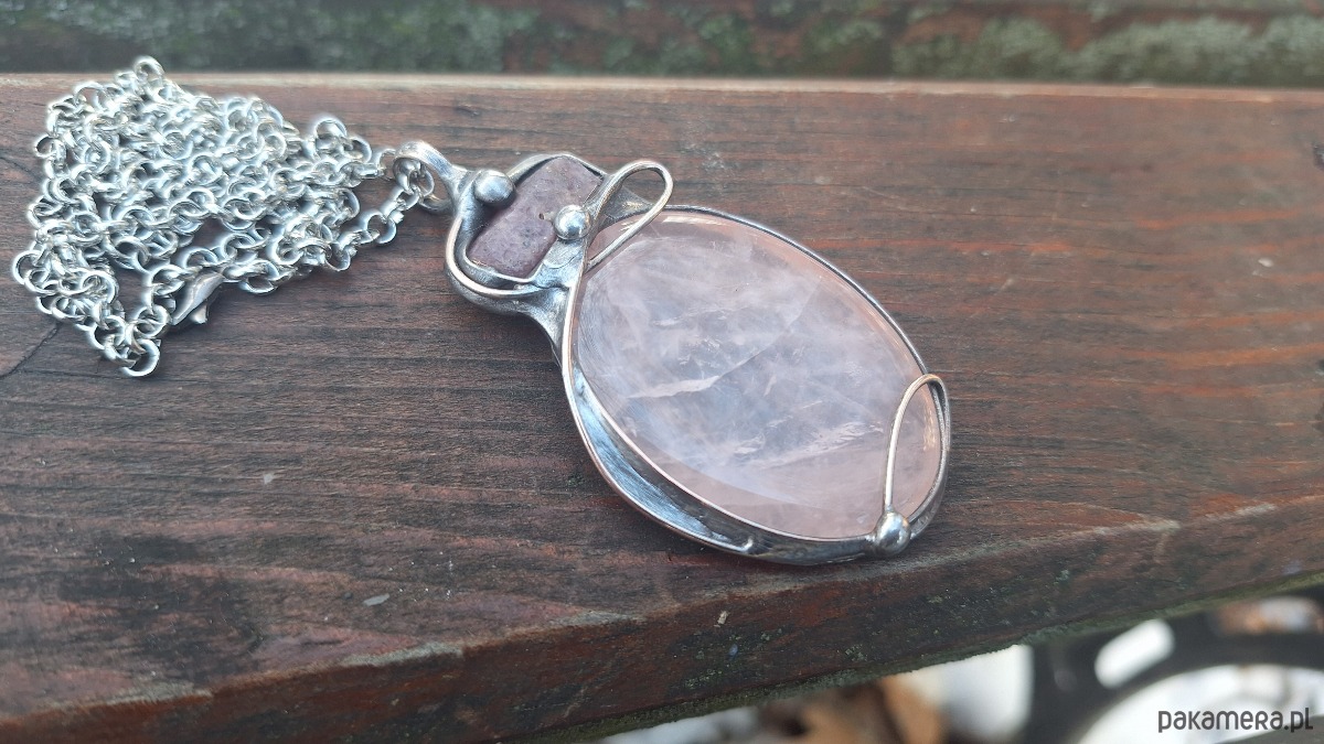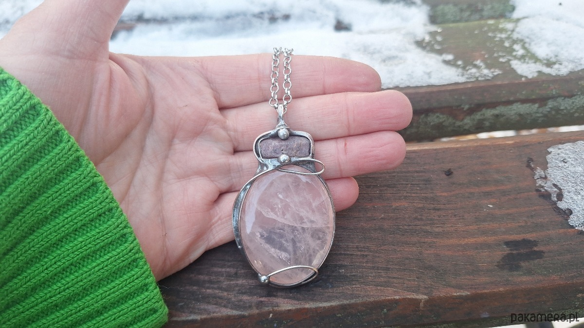 Wisiorek wykonany z miedzi, cyny, różowego kwarcu i rubinu. Wymiary ok. 6 na 3.5 cm. Zawieszony na łańcuszku o długości ok. 50 cm.