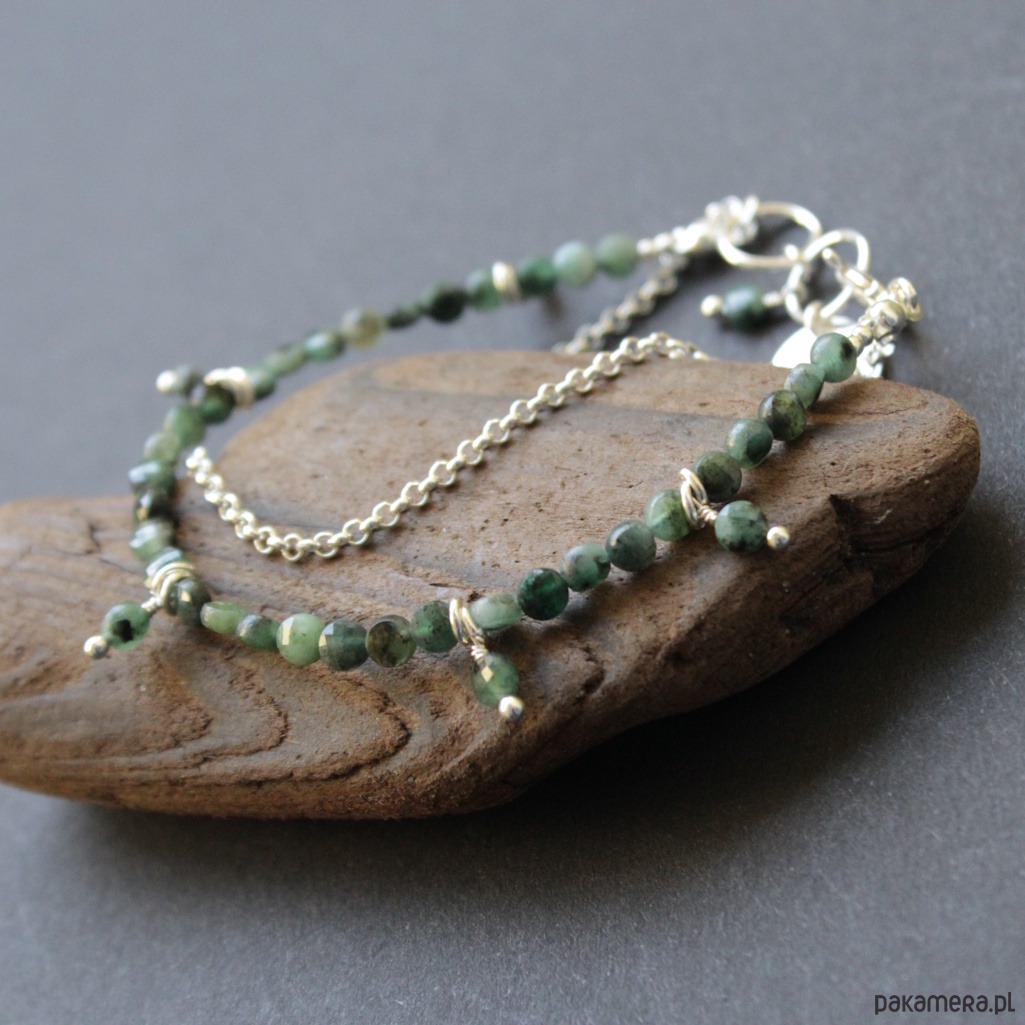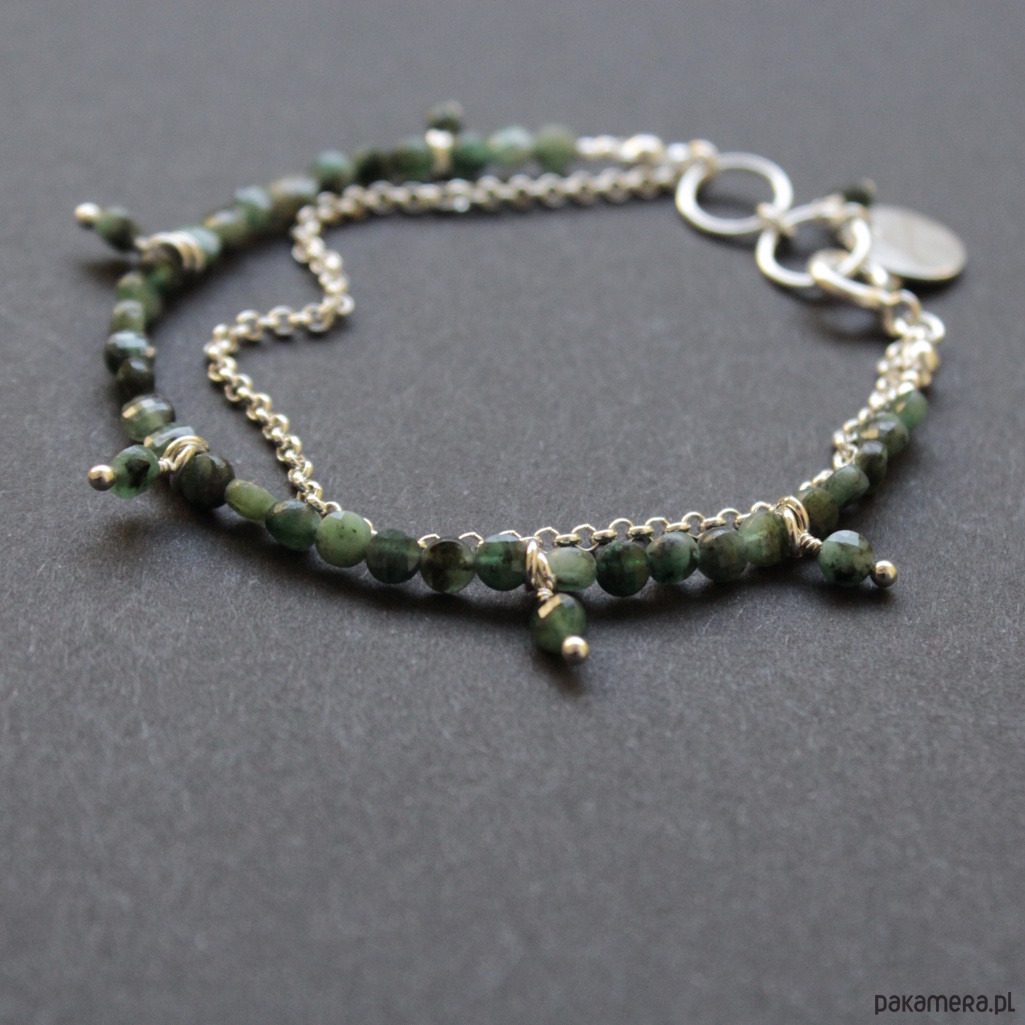 Bransoletka wykonana została ze srebra próby 925 oraz fasetowanych szmaragdów wielkości 0,4 cm.