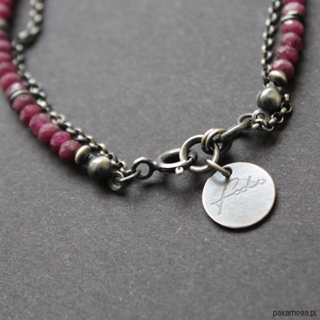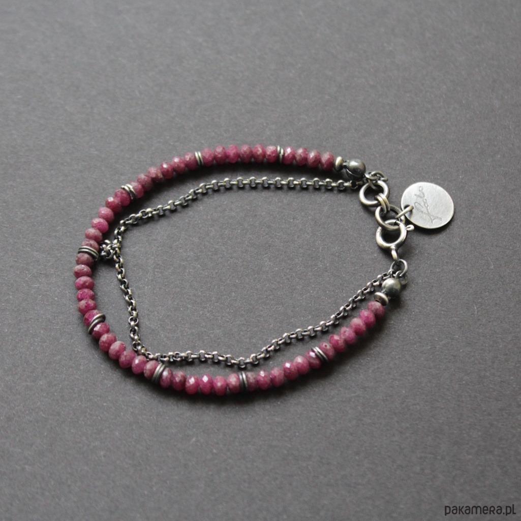 Bransoletka wykonana została z oksydowanego srebra oraz fasetowanych rubinów wielkości 0,35 cm.