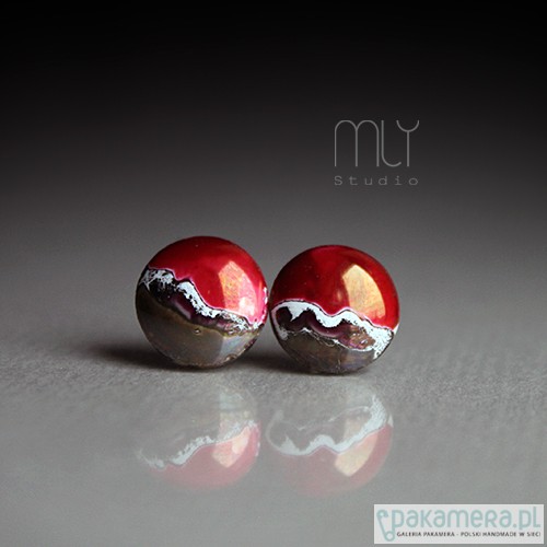 Ceramiczne okrągłe kolczyki w formie sztyftów, ręcznie wykonane z delikatnej gliny kamionkowej, jednostronnie szkliwione mieszanką błękitnych, czerwonych i białych szkliw z efektem plamek i pięknym iryzującym połyskiem, na antyalergicznych sztyftach w kolorze srebrnym. Średnica ok. 9mm. Polecam