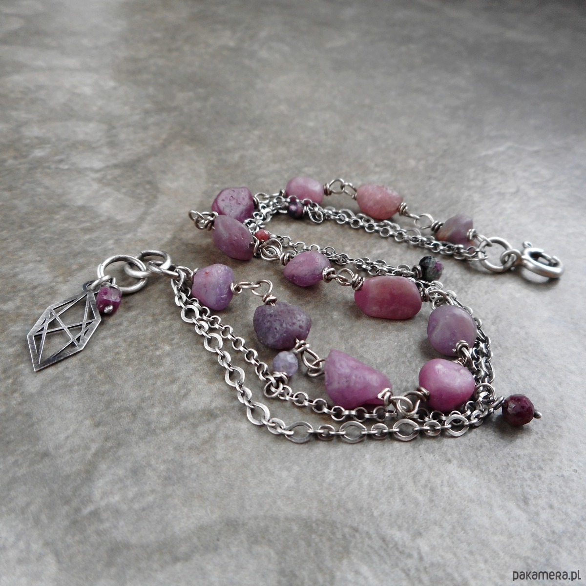 Wyjątkowa bransoletka z kamieni naturalnych i szlachetnego srebra; surowego stylu biżuterii nadają nieszlifowane, nieregularne bryłki rubinu.
