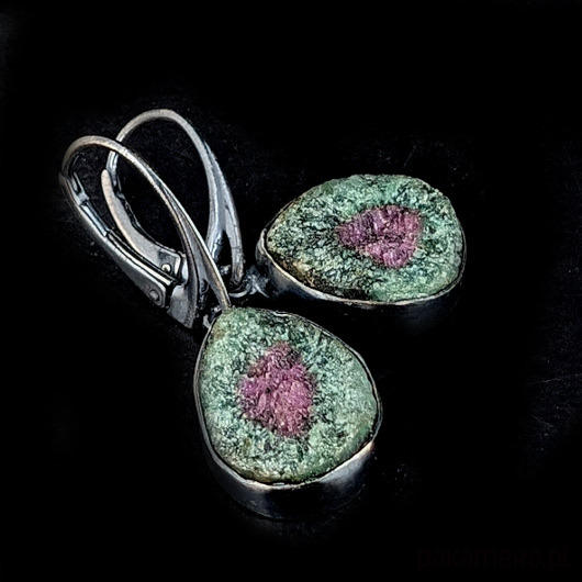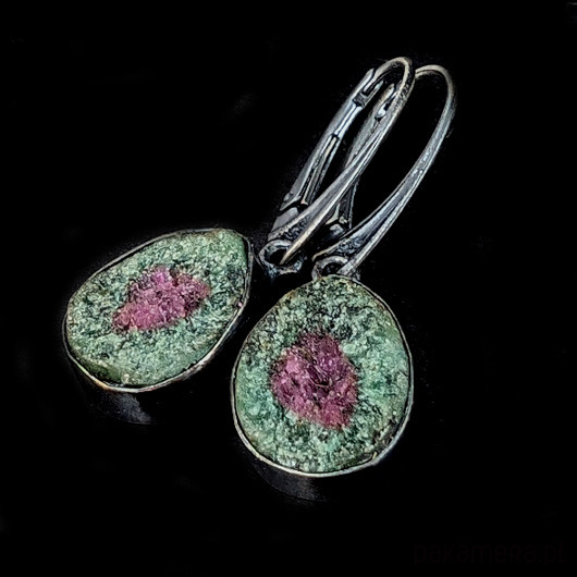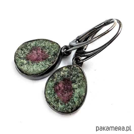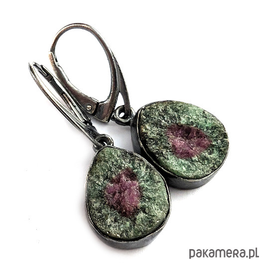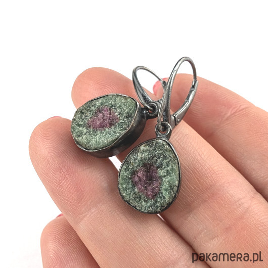 Naturalne zoizyty z wtrętami rubinu. Przepiękne połaczenie barw. Oksydowana, surowa oprawa srebra próby 925. Wymiary całości 15 x 12 mm, z biglami 32 mm. Piękne barwy minerałów połyskujących w świetle. Waga jednego kolczyka 3,2 g. Kolczyki zostaną zapakowane w ozdobne pudełeczko.