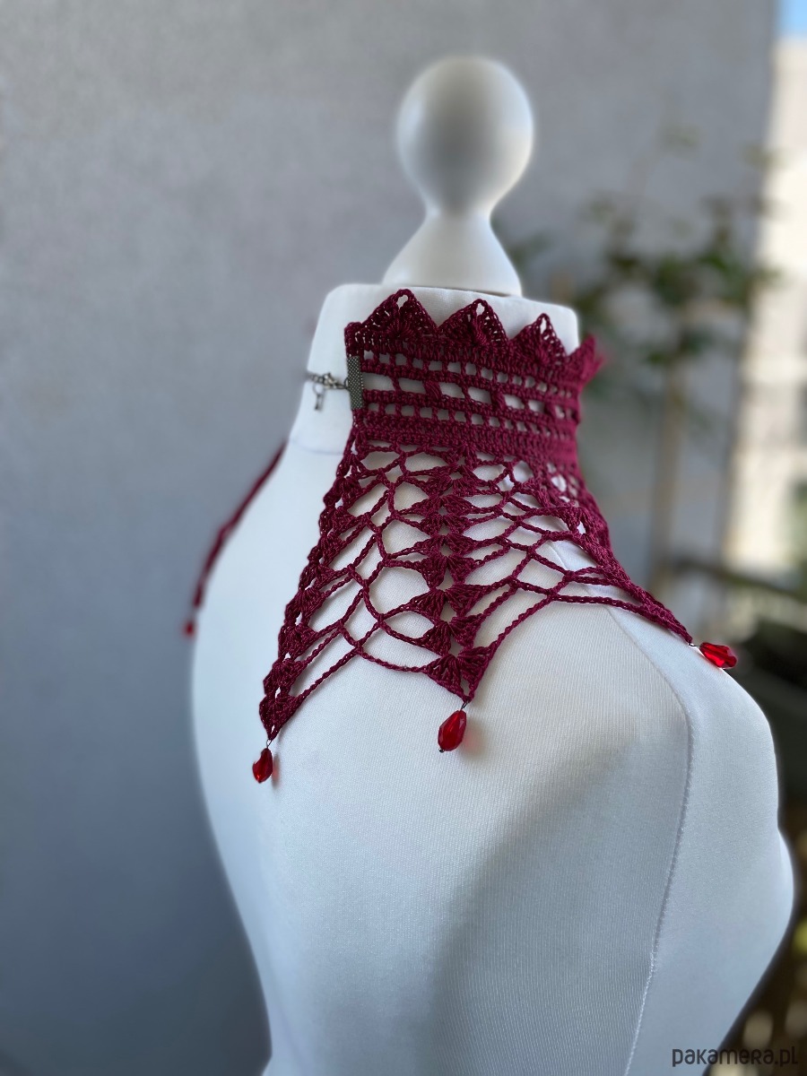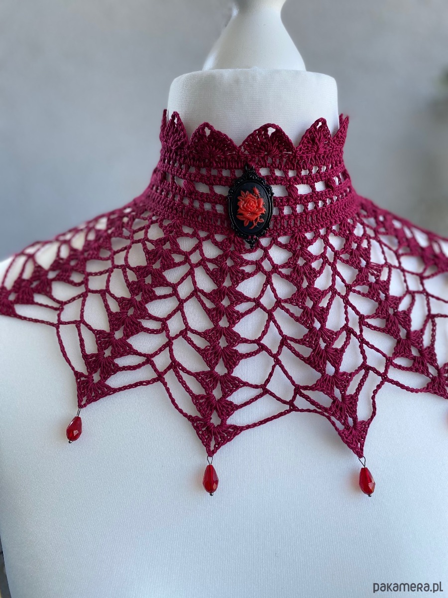 Prześliczna pajęczynowa kolia, w kolorze rubinu, ozdobiona medalionem różą i łezkami czerwonymi, zapinana na regulowane zapięcie, zrobiona z kordonka bawełnianego, prawdziwy klasyk dla smakoszy.