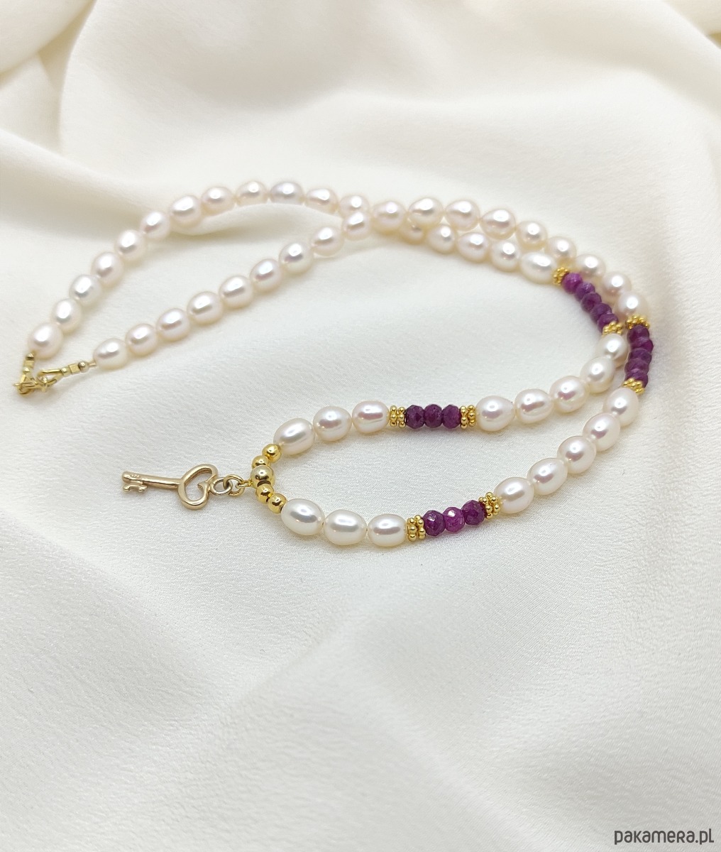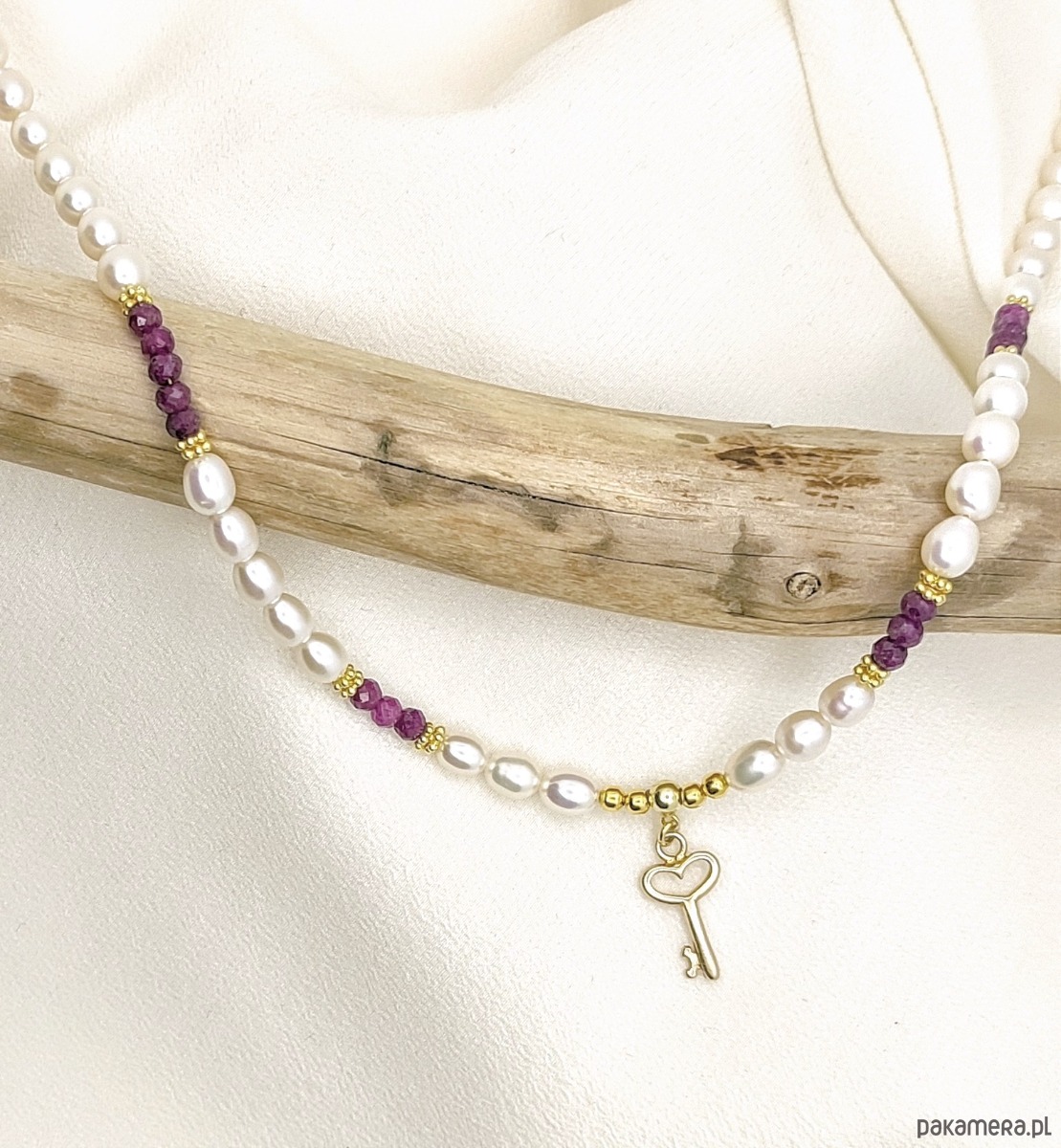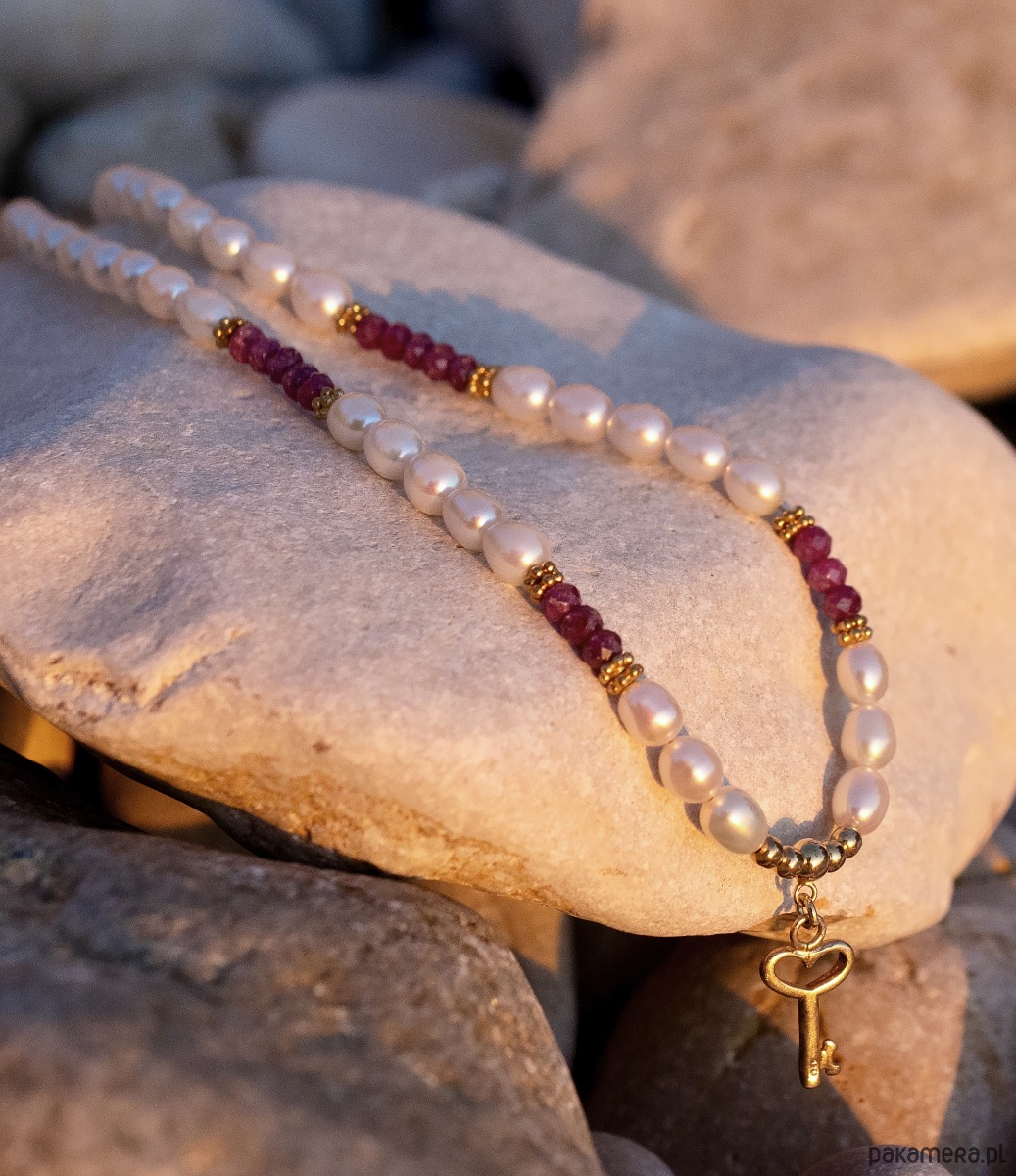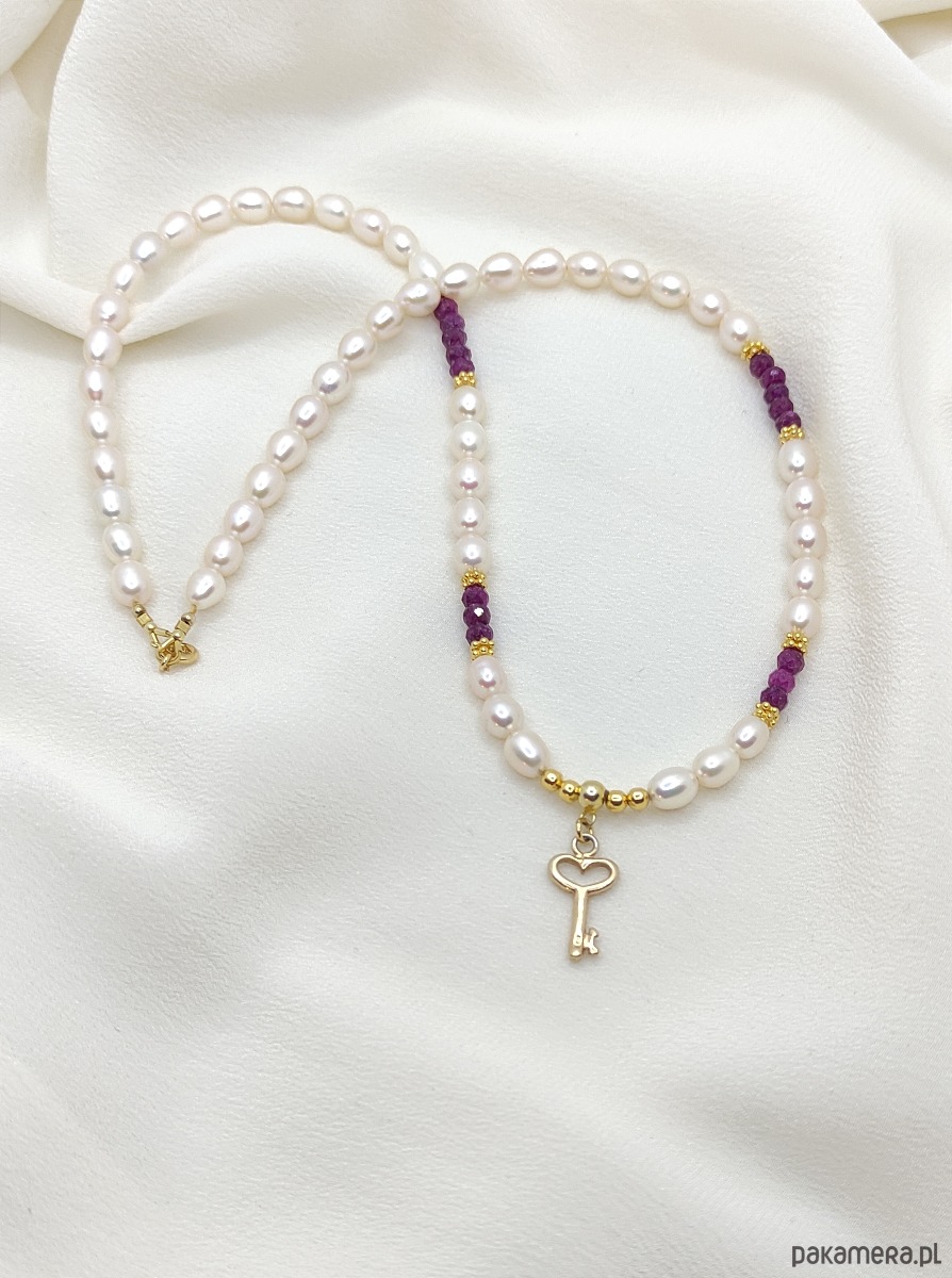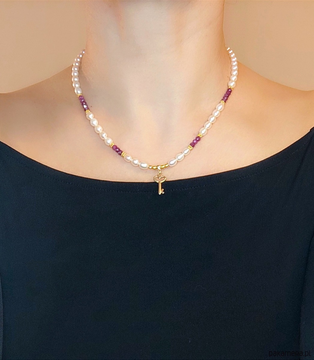 Wyjątkowy naszyjnik z wyrazistą symboliką miłości. Perły, rubiny, pozłacany klucz - to atrybuty serca i wyznanie uczuć. Piękna kompozycja sekwencji pereł i rubinów w intensywnej barwie. Ozdobny kluczyk z główką w kształcie serduszka ładnie układa się na dekolcie.