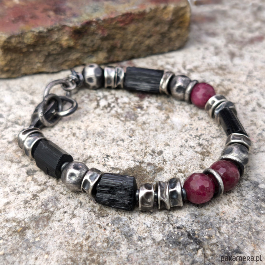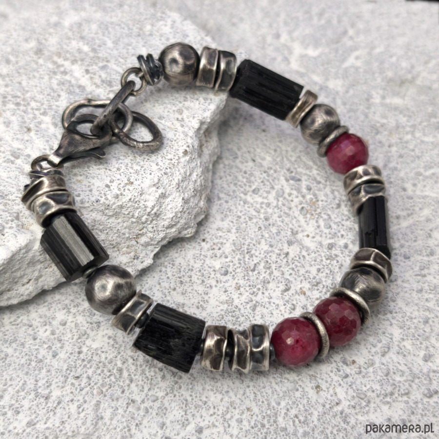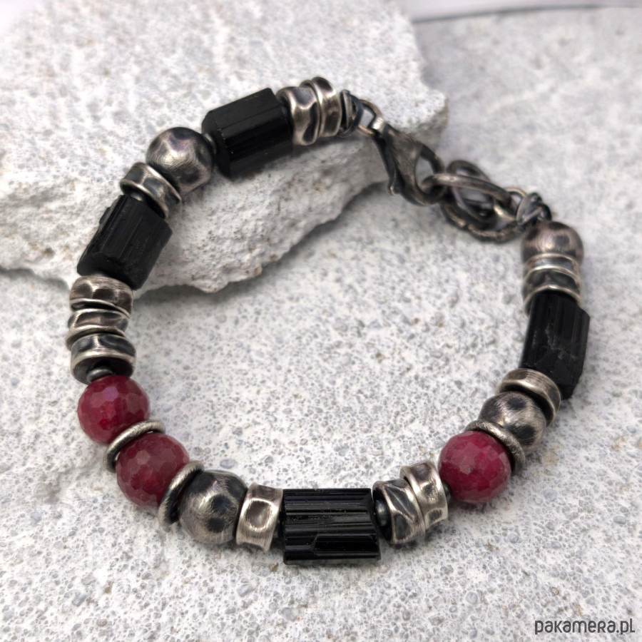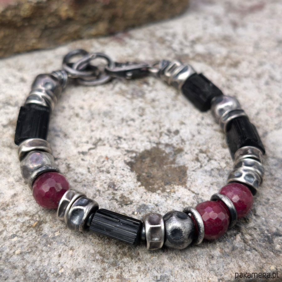 Bransoleta męska - srebro, fasetowane rubiny, czarne turmaliny.