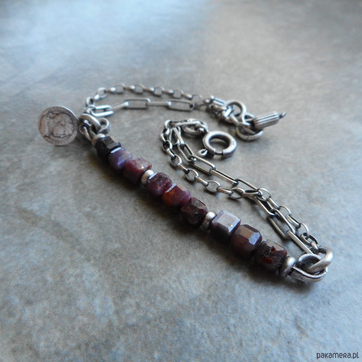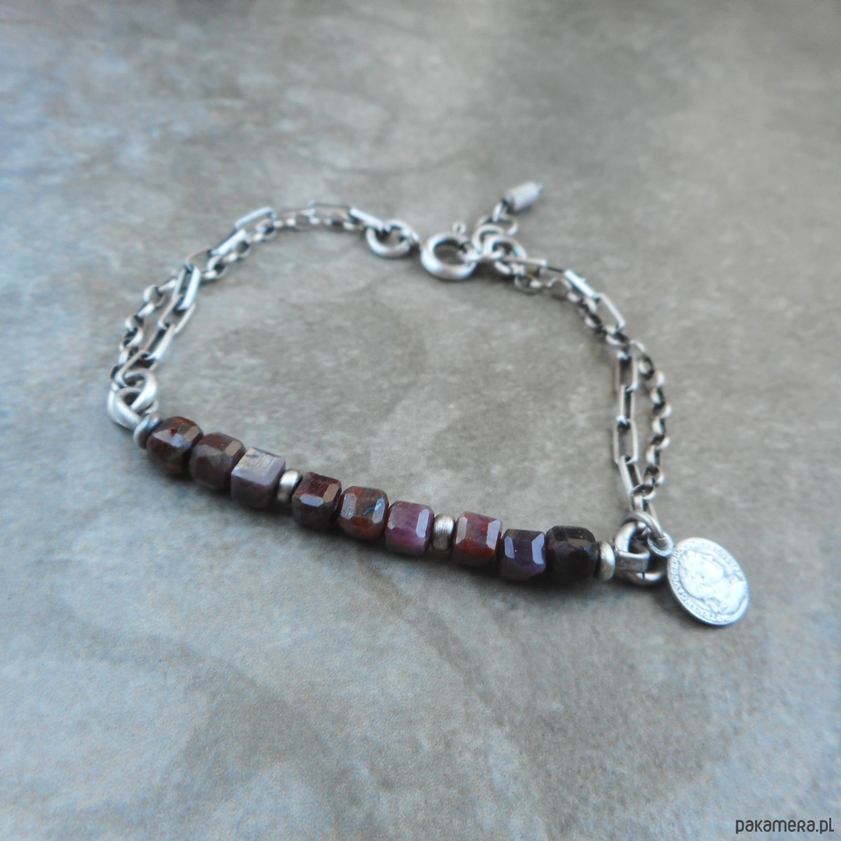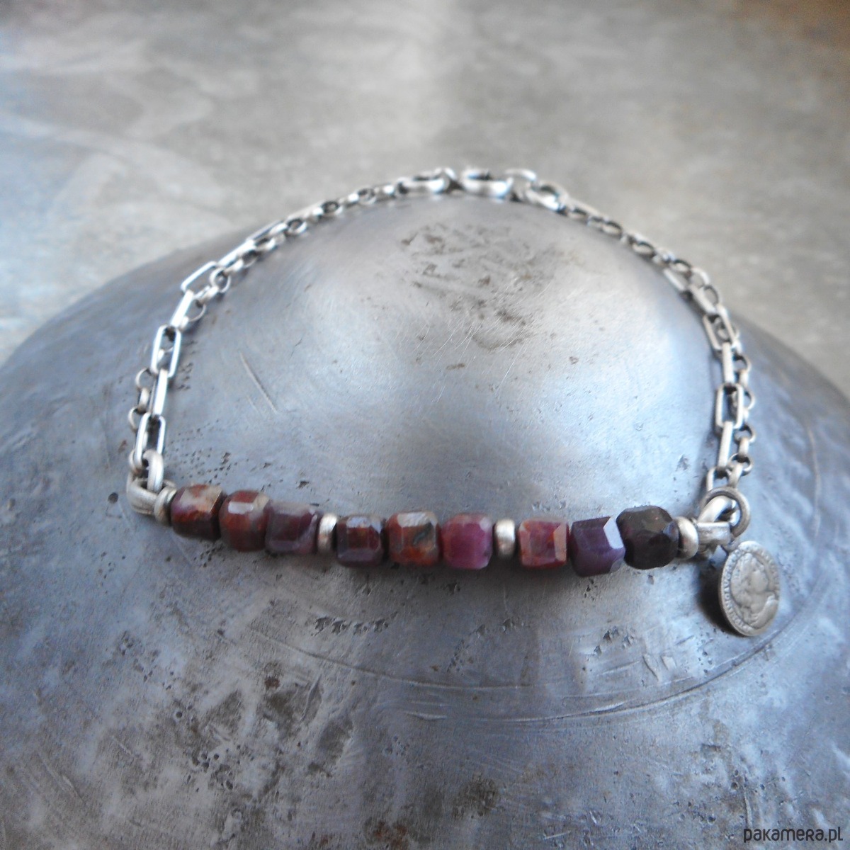 Bransoletka z kamieni naturalnych i szlachetnego srebra, o surowym charakterze, szereg rubinowych kostek ozdobiony zawieszką w formie monety.