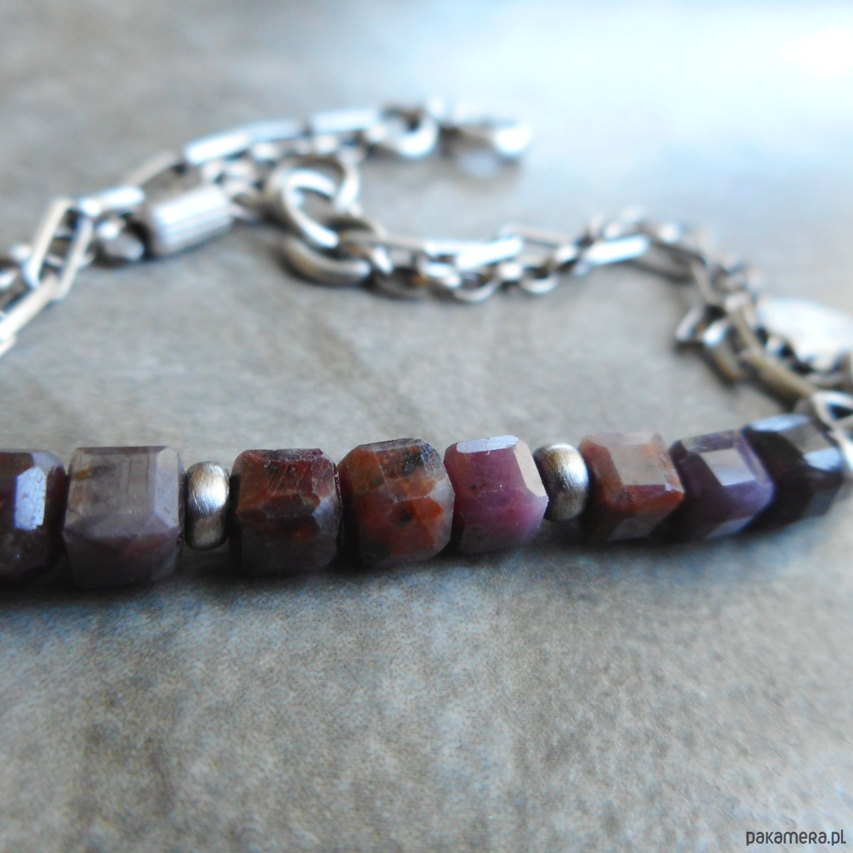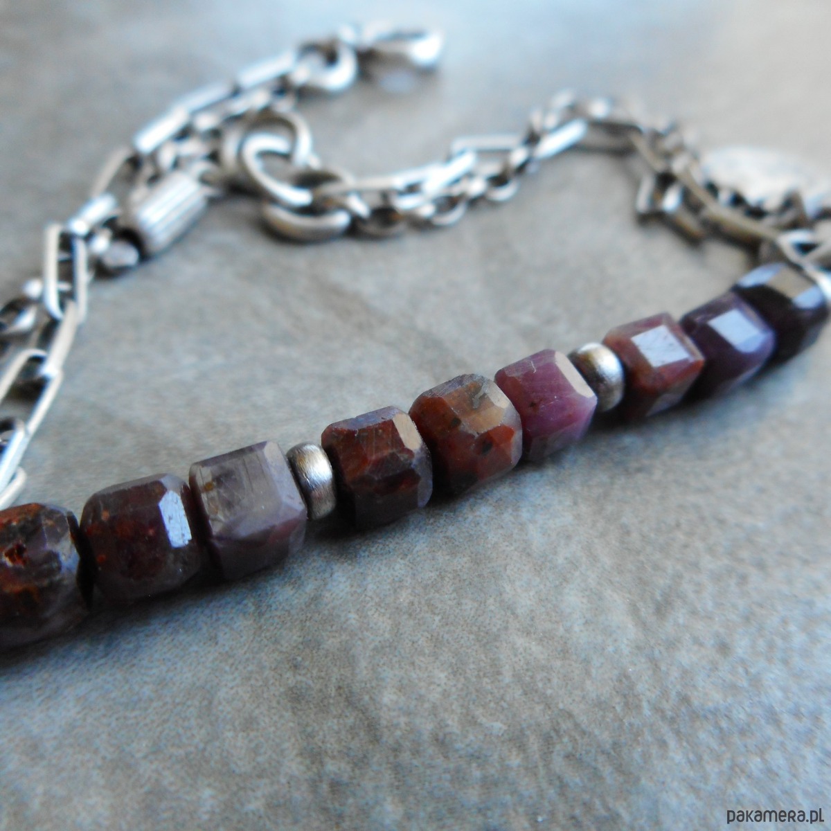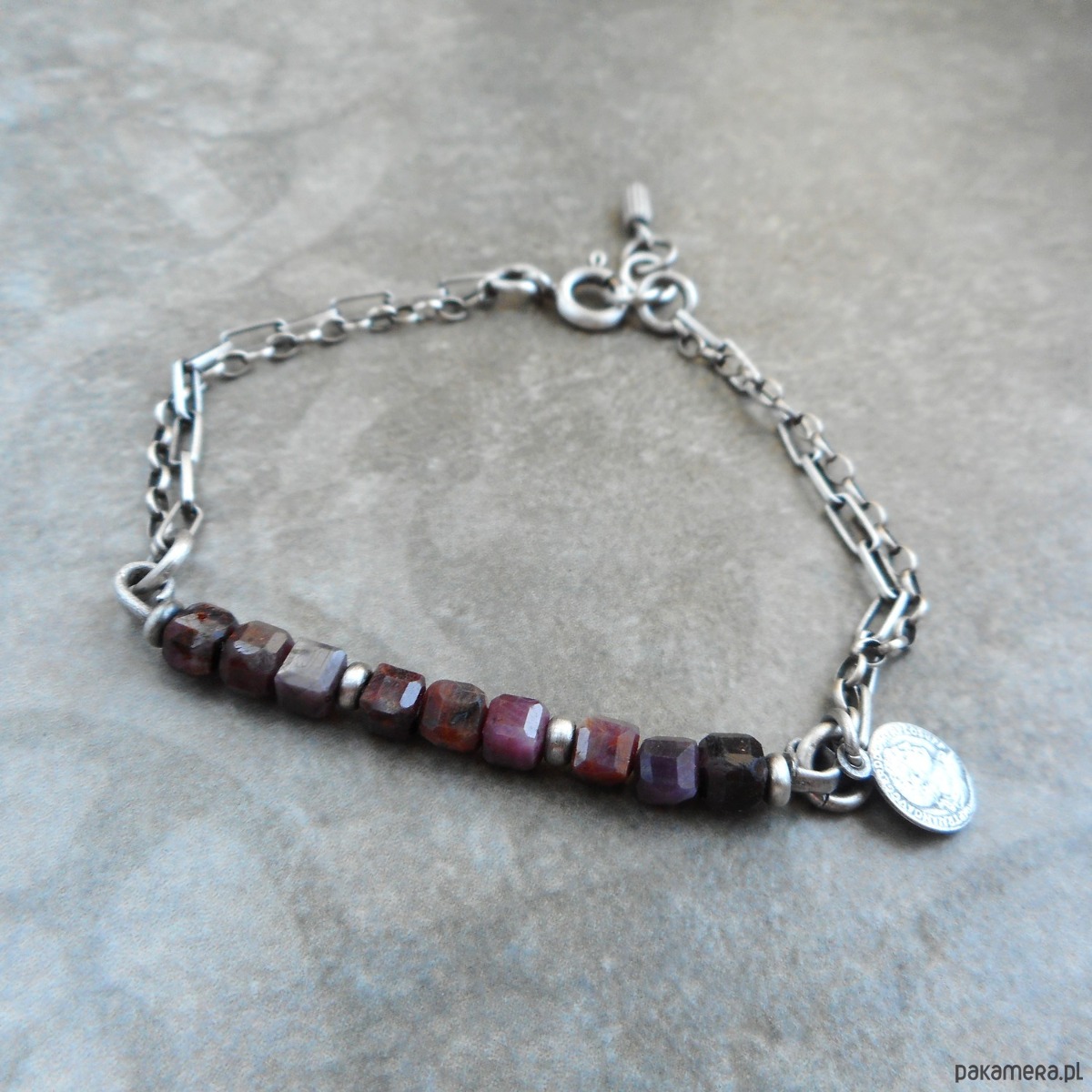 Bransoletka z kamieni naturalnych i szlachetnego srebra, o surowym charakterze, szereg rubinowych kostek ozdobiony zawieszką w formie monety.