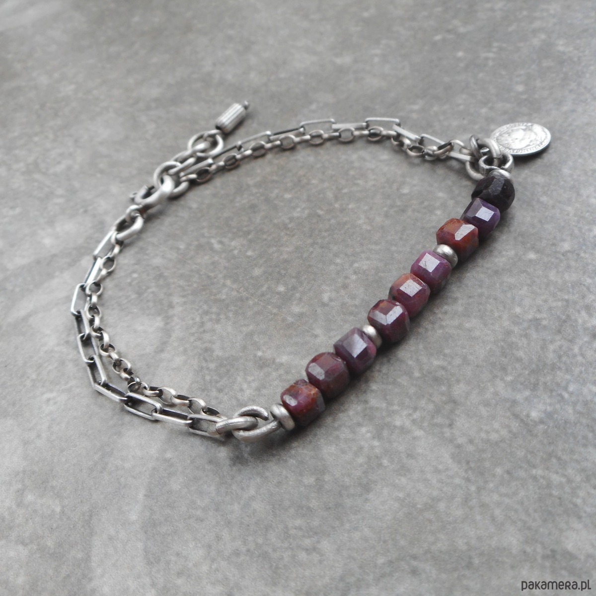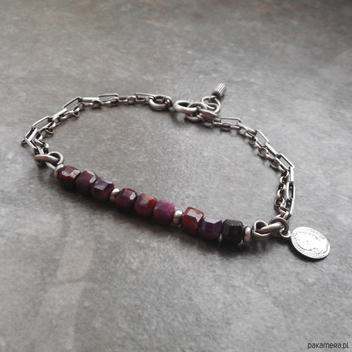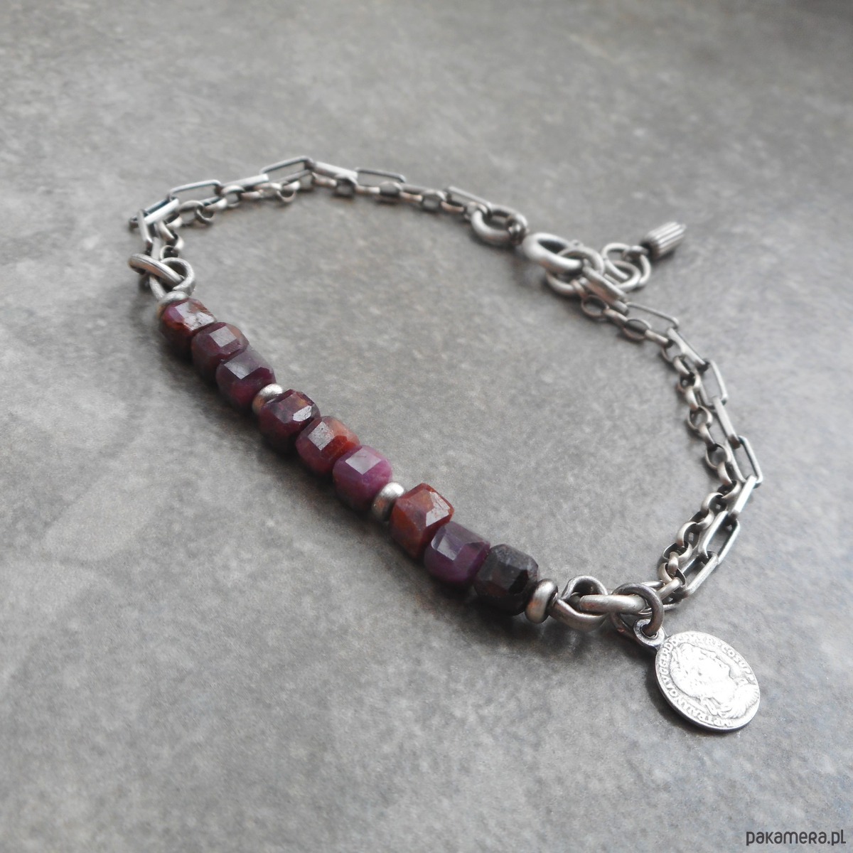 Bransoletka z kamieni naturalnych i szlachetnego srebra, o surowym charakterze, szereg rubinowych kostek ozdobiony zawieszką w formie monety.