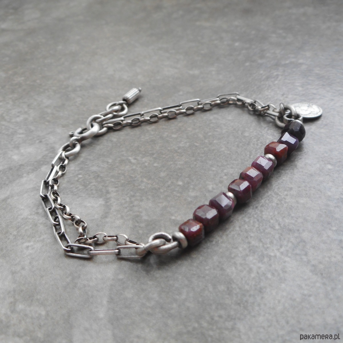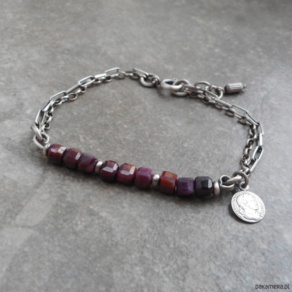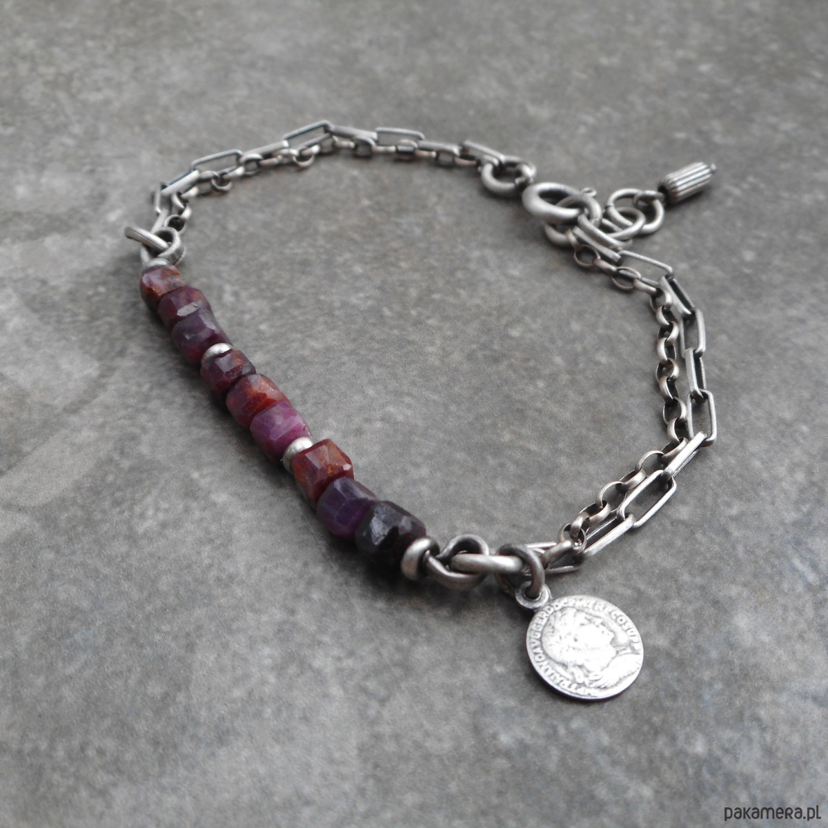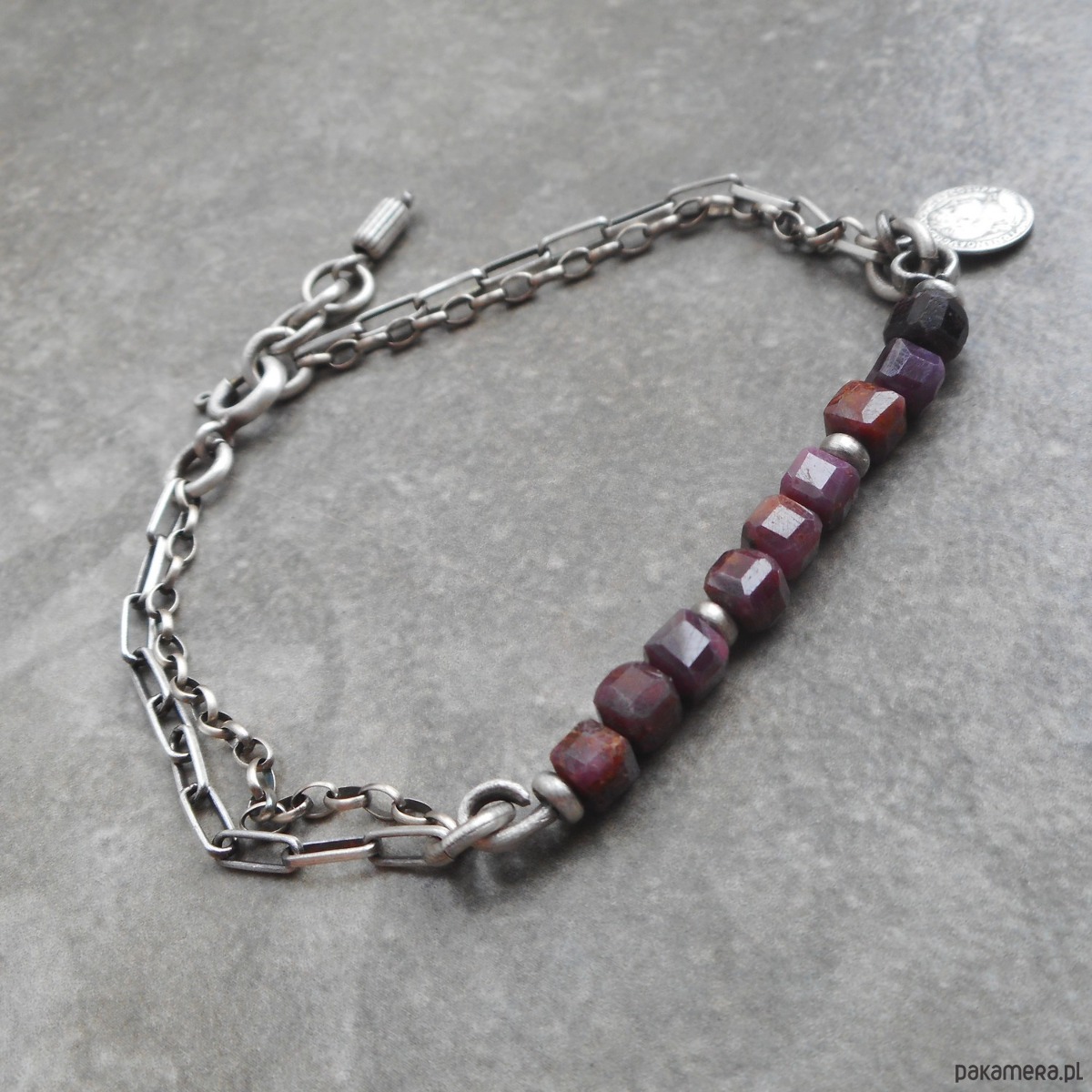 Bransoletka z kamieni naturalnych i szlachetnego srebra, o surowym charakterze, szereg rubinowych kostek ozdobiony zawieszką w formie monety.