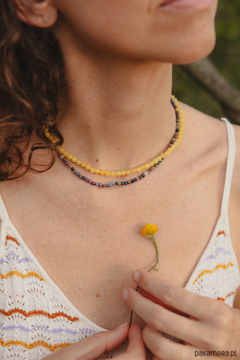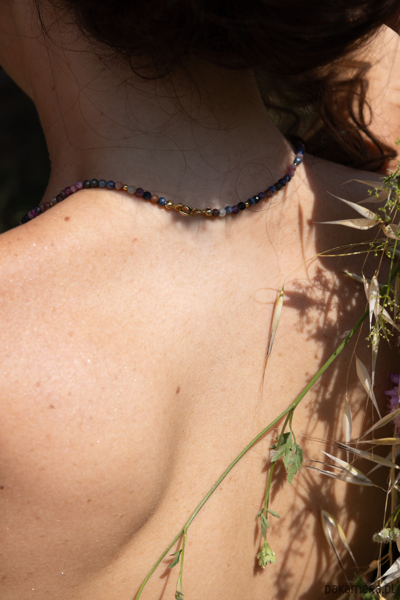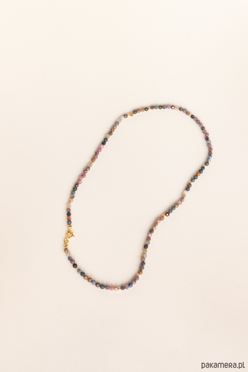 - naszyjnik został wykonany z drobnych rubinów i szafirów w kształcie kuli fasetowanej przeplatany mini kuleczkami ze srebra pozłacanego 24karatowym złotem