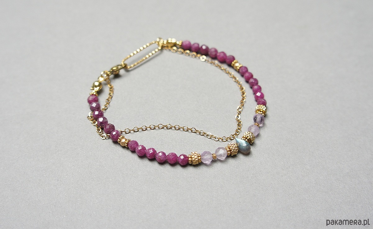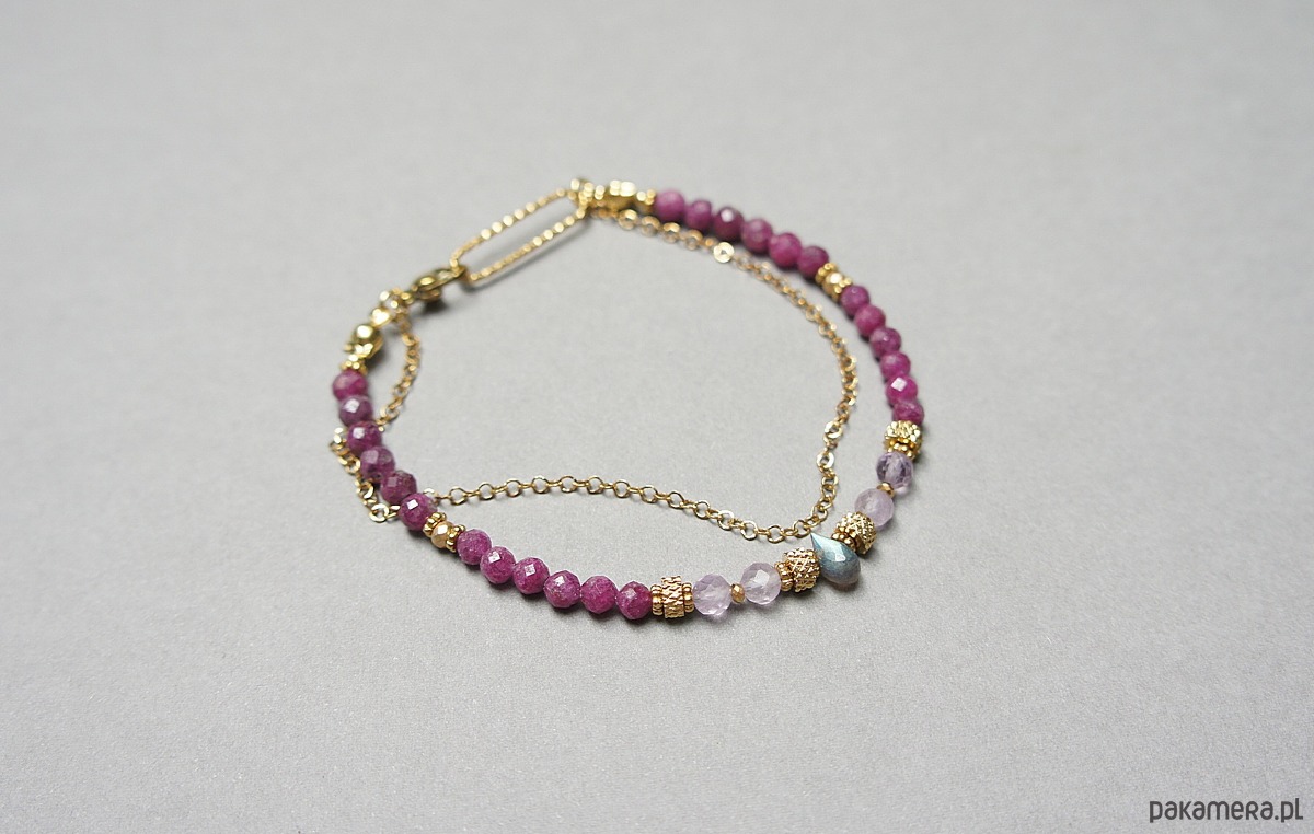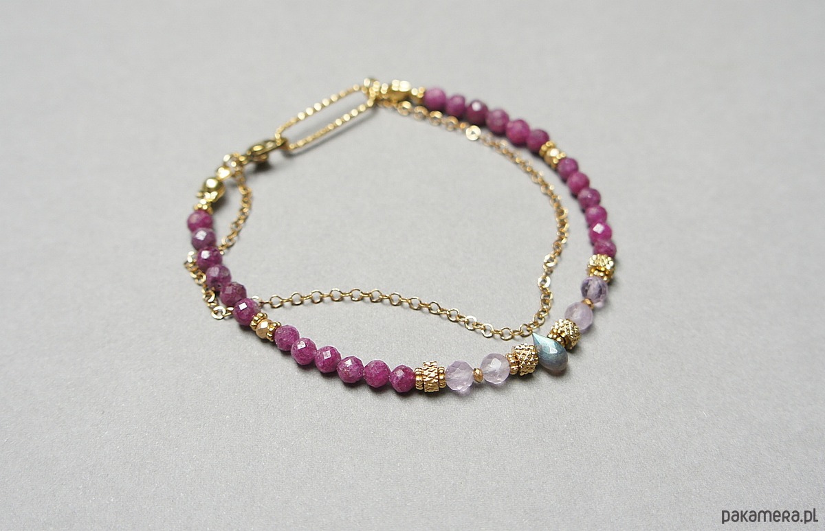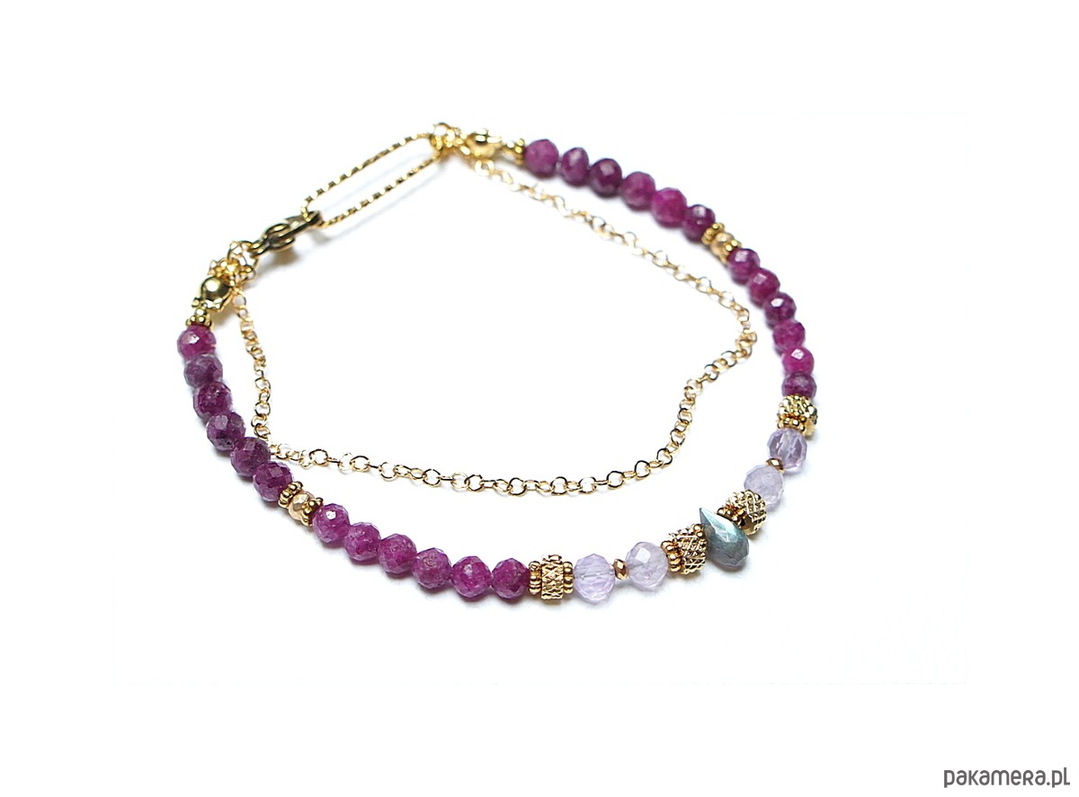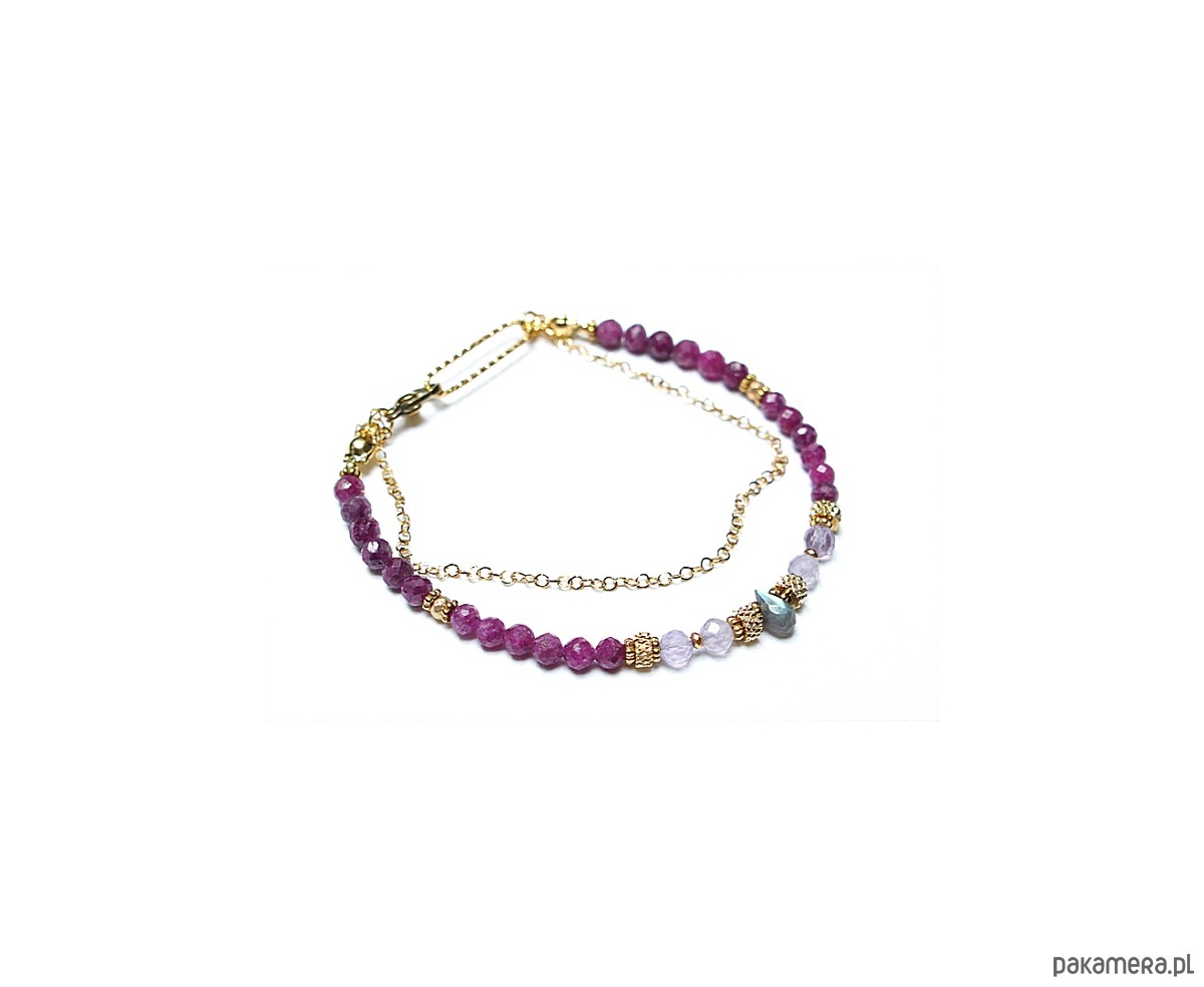 Delikatna bransoletka wykonana w całości ze stali szlachetnej pozłacanej oraz naturalnych, szlachetnych kamieni - fasetowanych kuleczek rubinów [4mm], fasetowanego ametrynu [4mm], hematytu fasetowanego, platerowanego [3mm], przekładek z hematytu [1mm] oraz zawieszki z labradorytu w kształcie brioletki. Całkowita długość bransoletki - 19cm. Biżuteria ozdobnie zapakowana.