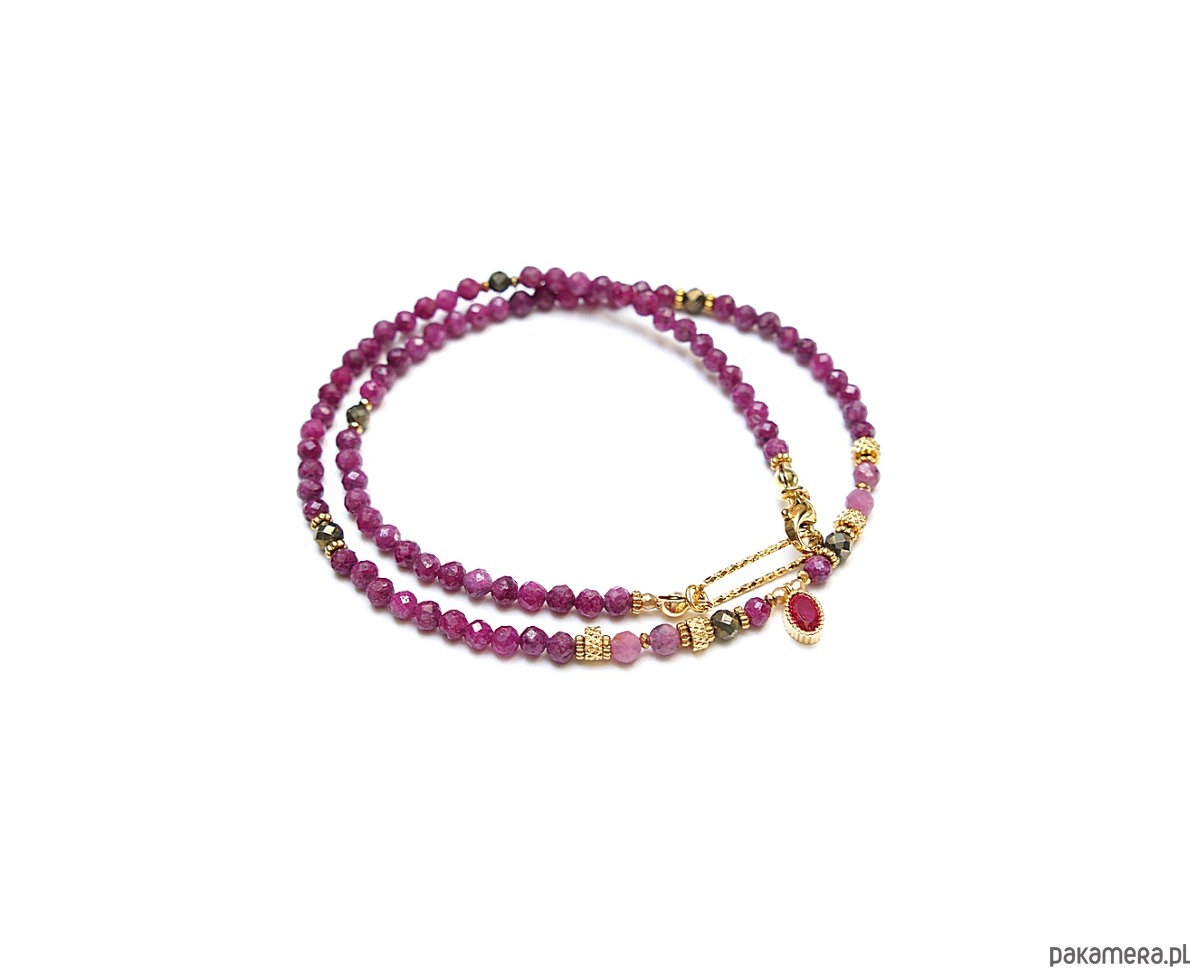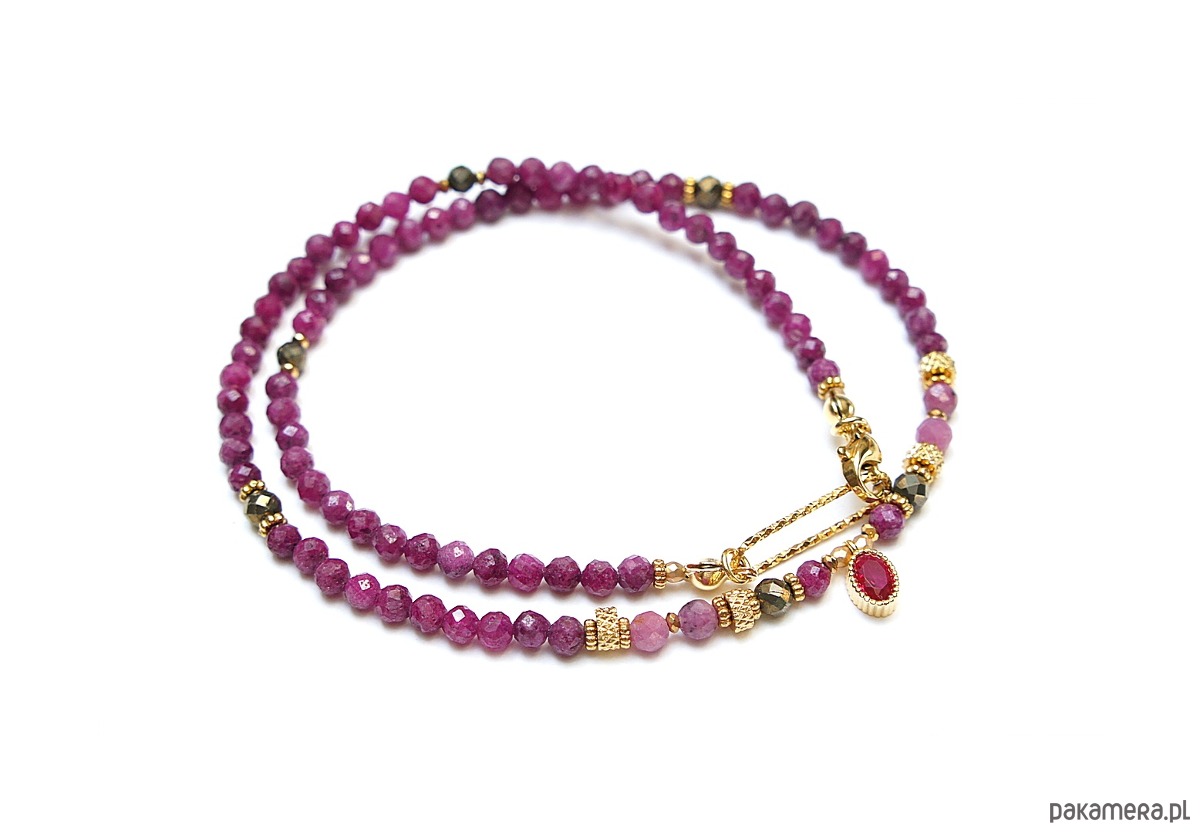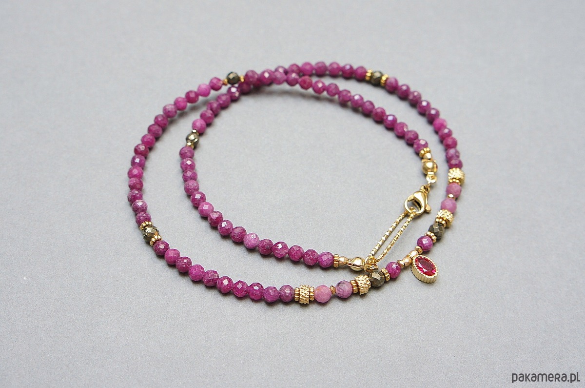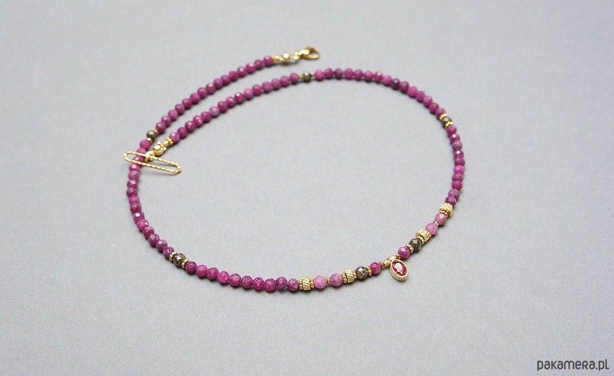 Krótki, delikatny naszyjnik wykonany w całości z pozłacanej stali szlachetnej oraz szlachetnych kamieni - fasetowanych, naturalnych rubinów [3mm i 4mm], pirytów fasetowanych [3mm], hematytu fasetowanego, platerowanego [2mm], przekładek z hematytu [1mm] oraz zawieszki z cyrkonią w okuciu. Naszyjnik o długości ok. 43cm.