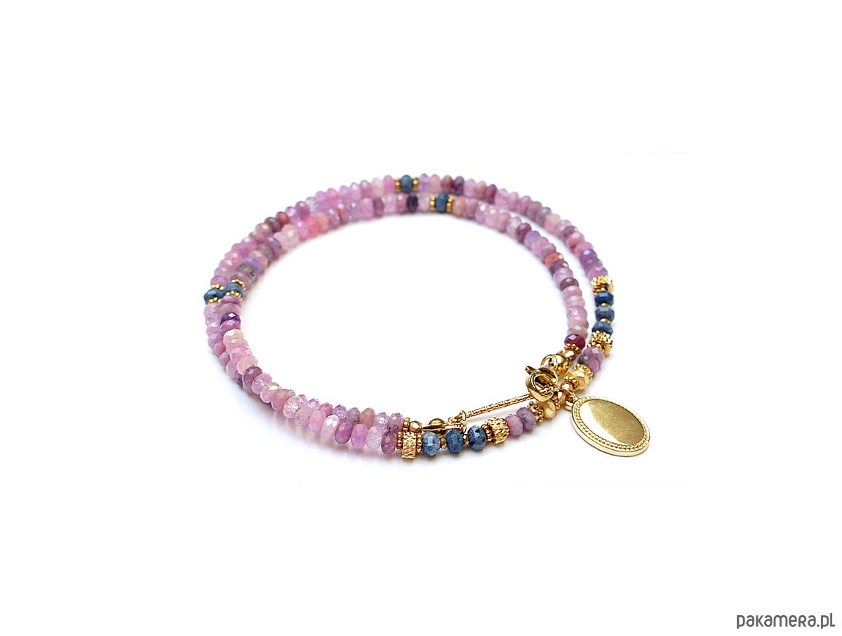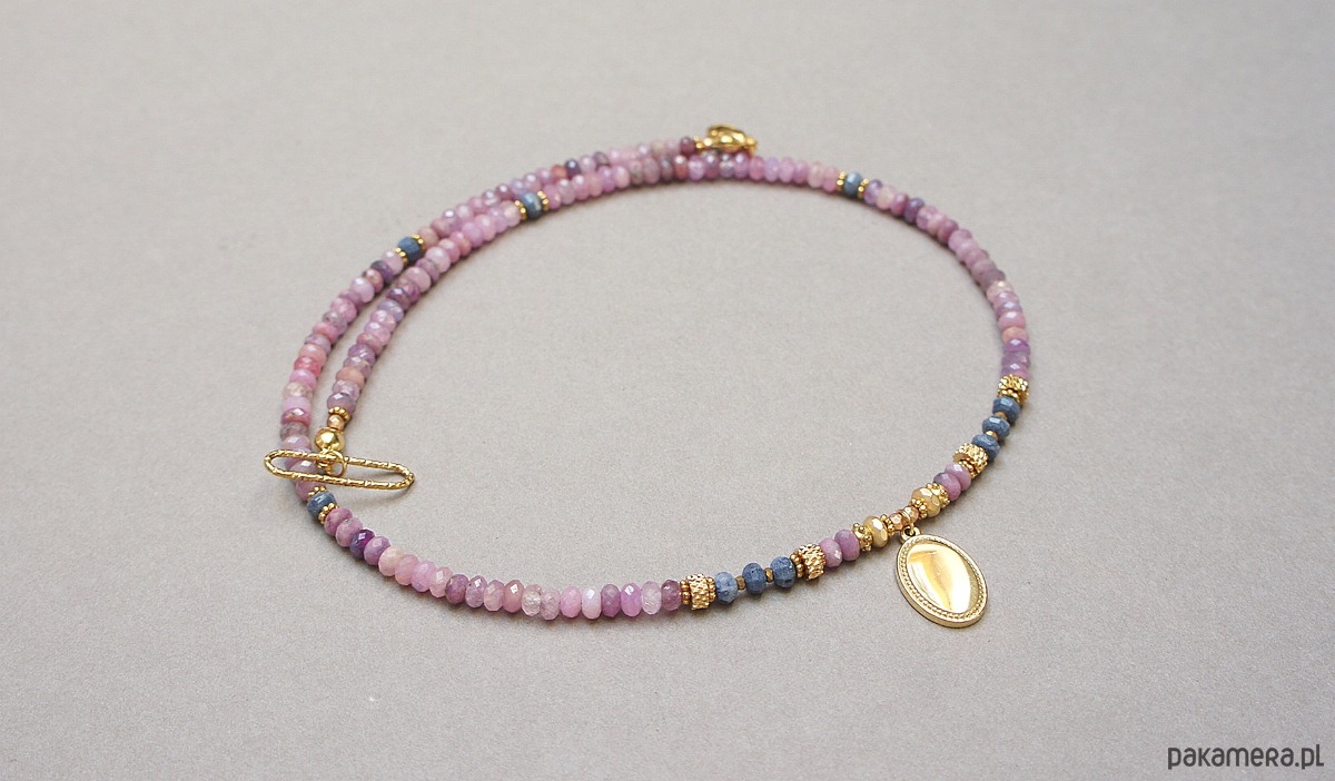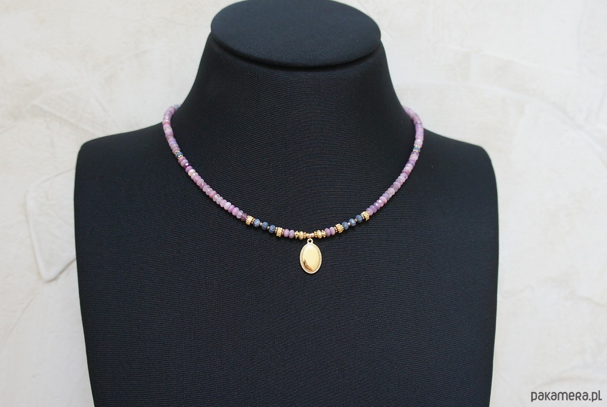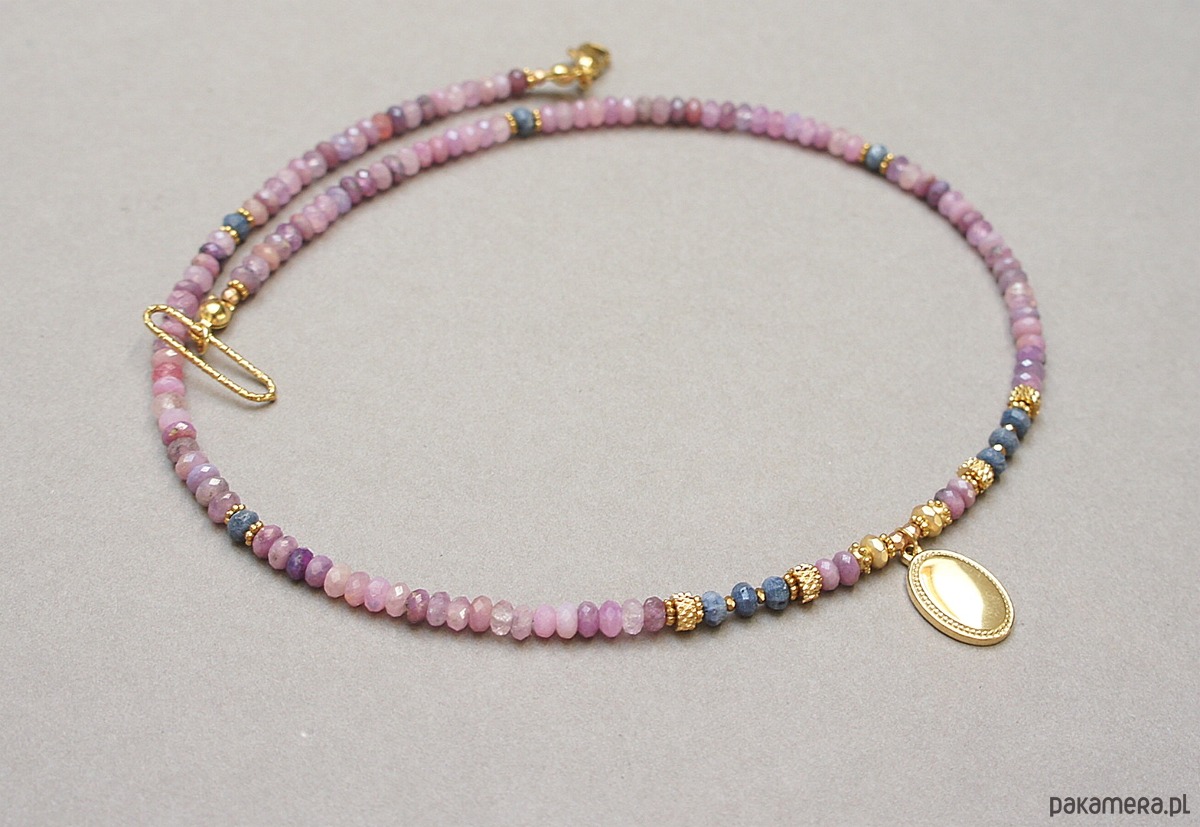 Krótki, delikatny naszyjnik wykonany w całości z pozłacanej stali szlachetnej oraz szlachetnych kamieni - fasetowanych, naturalnych rubinów w kształcie oponek [4 x 2mm], oponek niebieskiego naturalnego korala [ok. 3 x 2mm], hematytu fasetowanego, platerowanego [4 x 2mm i 2mm], przekładek z hematytu [1mm]. Naszyjnik o długości ok. 43cm.