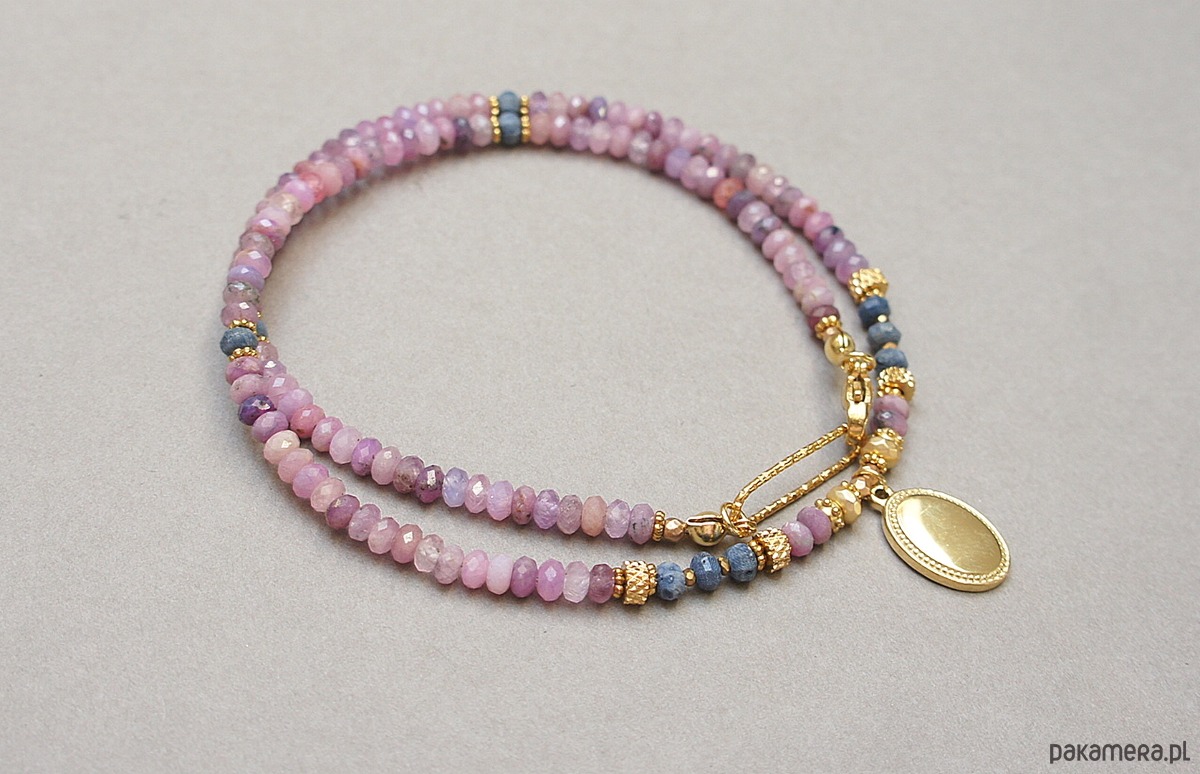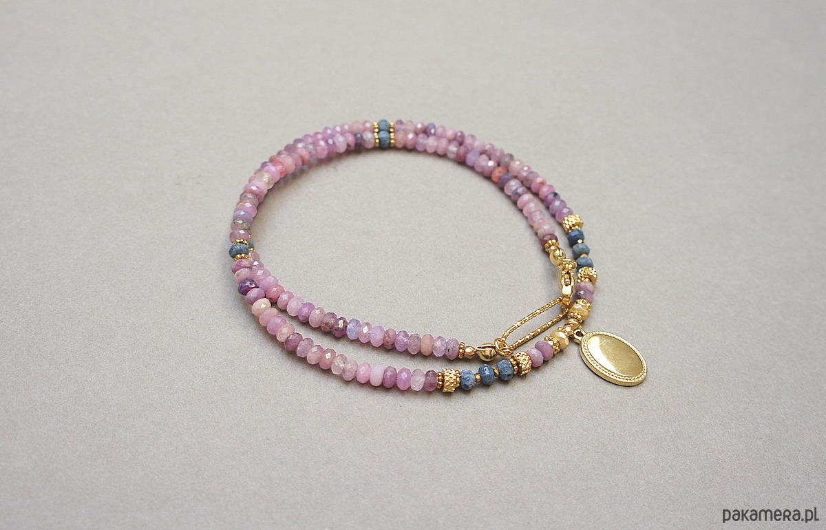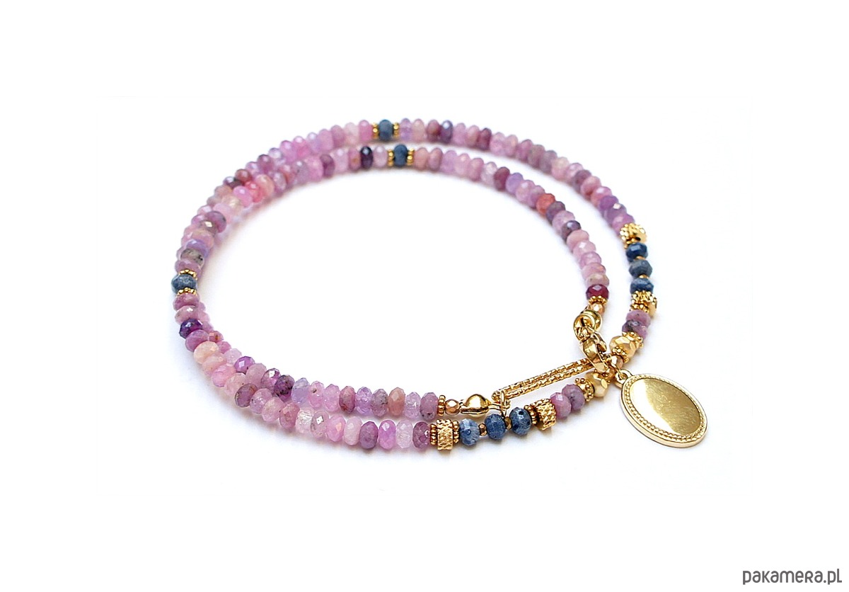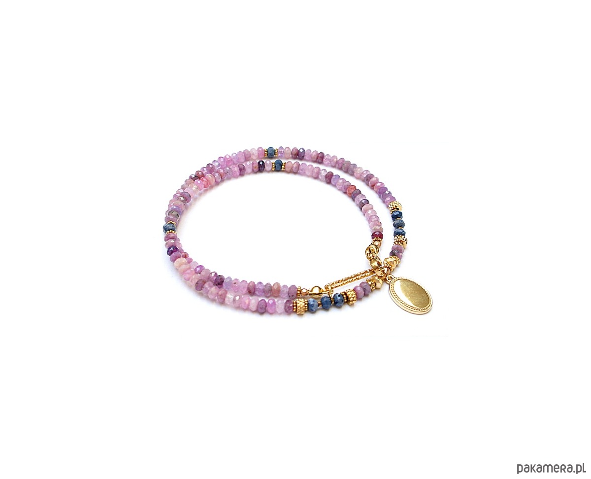 Krótki, delikatny naszyjnik wykonany w całości z pozłacanej stali szlachetnej oraz szlachetnych kamieni - fasetowanych, naturalnych rubinów w kształcie oponek [4 x 2mm], oponek niebieskiego naturalnego korala [ok. 3 x 2mm], hematytu fasetowanego, platerowanego [4 x 2mm i 2mm], przekładek z hematytu [1mm]. Naszyjnik o długości ok. 43cm.