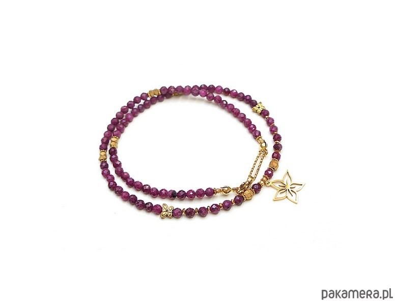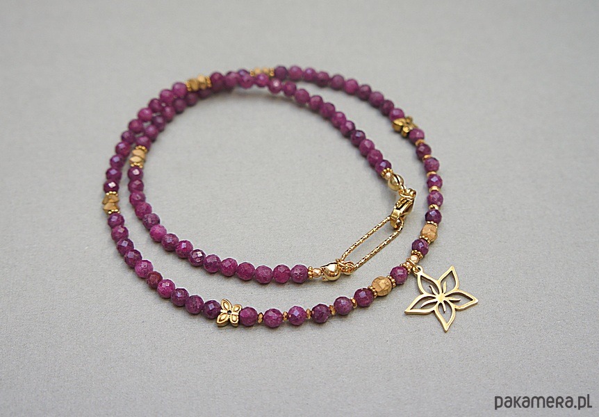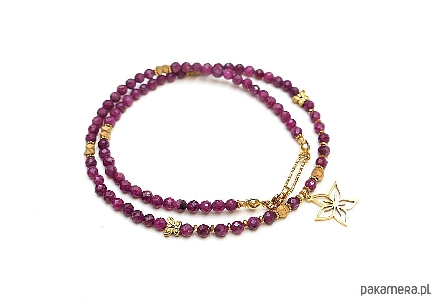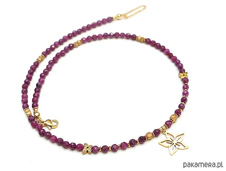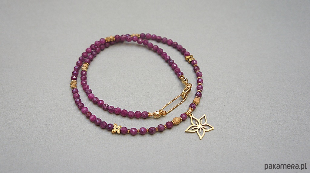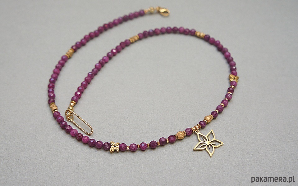 Krótki, minimalistyczny naszyjnik wykonany w całości z pozłacanej stali szlachetnej oraz naturalnych, szlachetnych kamieni - rubiny fasetowane [4mm], hematyt fasetowany [5mm], cyrkonie fasetowane [2,5mm], przekładek z hematytu [3 x 2mm, 2mm, 6mm - motyle]. Naszyjnik o długości ok. 43,5cm. Biżuteria ozdobnie zapakowana.