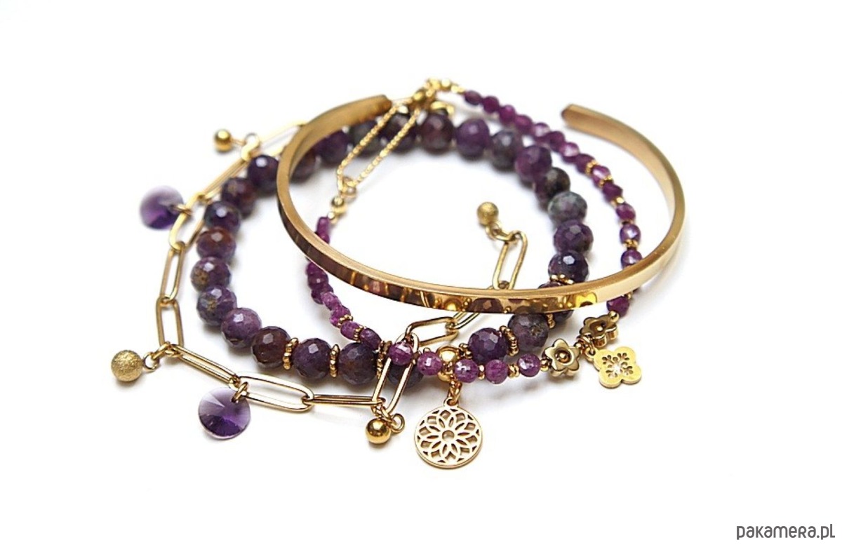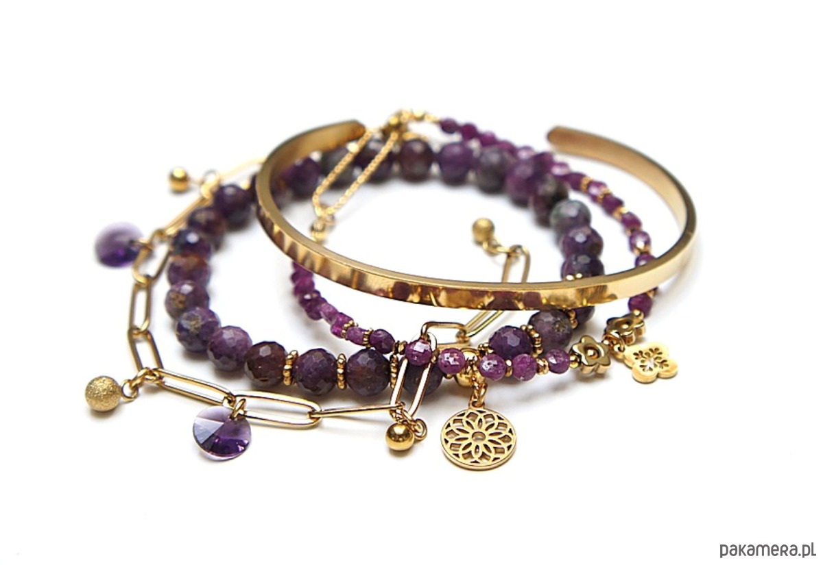 Zestaw czterech bransoletek wykonanych w całości z pozłacanej stali szlachetnej oraz naturalnych, szlachetnych kamieni - rubiny fasetowane [4mm oraz 6mm], przekładek z hematytu [6mm], zawieszek z kryształkami Swarovski. Bransoletki pasują na nadgarstek 15 - 16cm Biżuteria ozdobnie zapakowana.