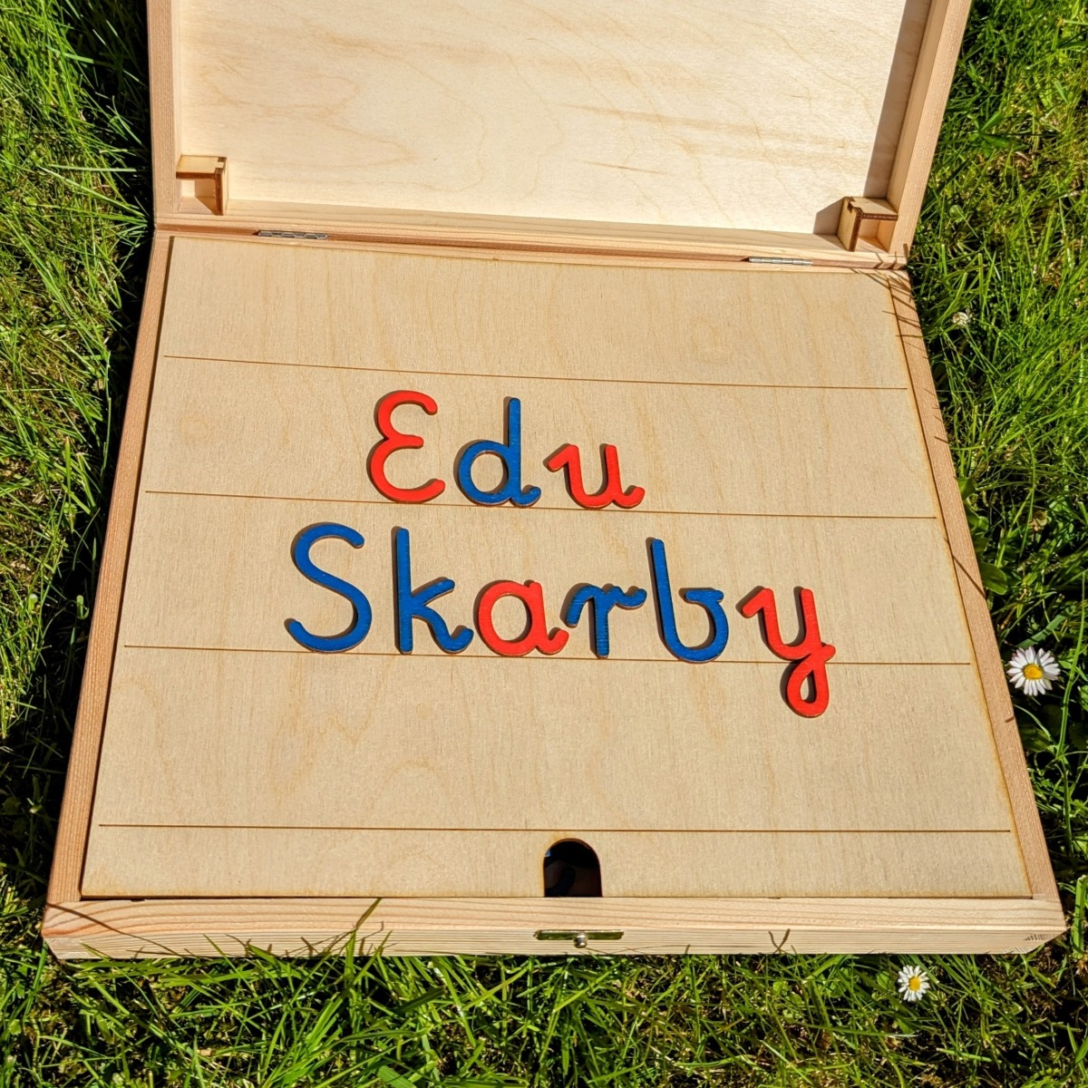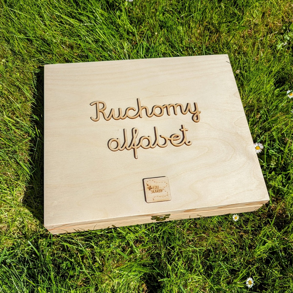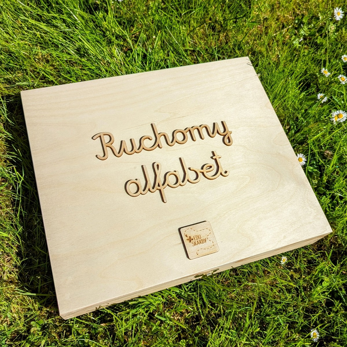 - Drewniane pudełko o wymiarach 35x30 cm. Pudełko zawiera przegródki: po jednej przegródce na każdą małą literkę, literki duże wszystkie w jednej przegródce.
