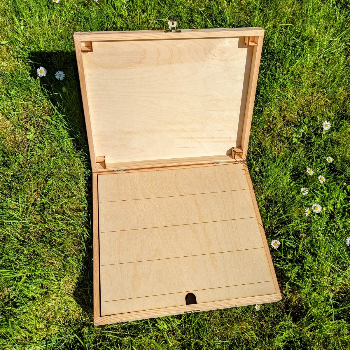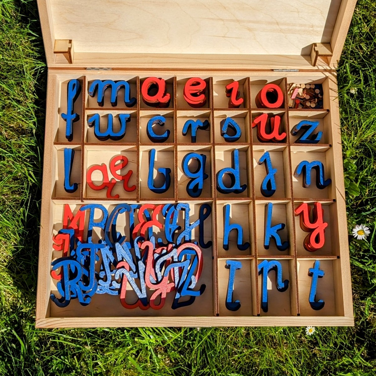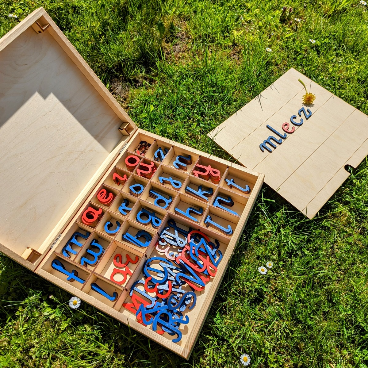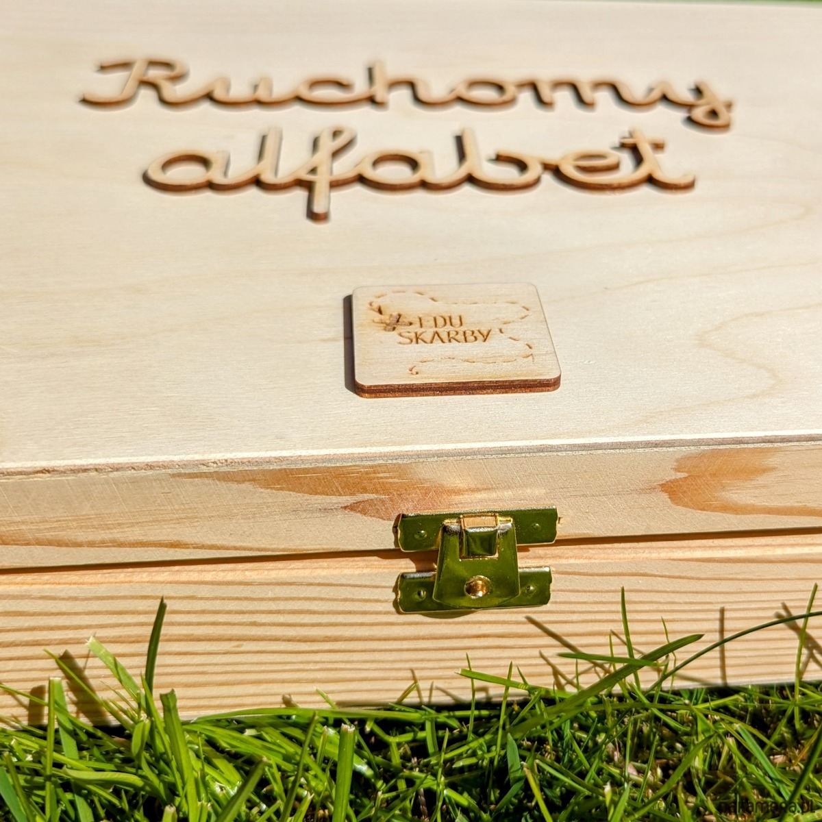 - Drewniane pudełko o wymiarach 35x30 cm. Pudełko zawiera przegródki: po jednej przegródce na każdą małą literkę, literki duże wszystkie w jednej przegródce.