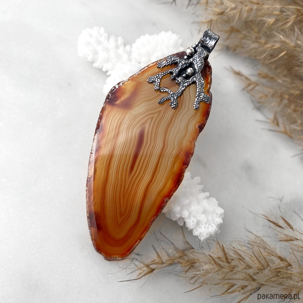 Wisior z motywem rafy koralowej, wykonany ręcznie ze srebra i plastra agatu.