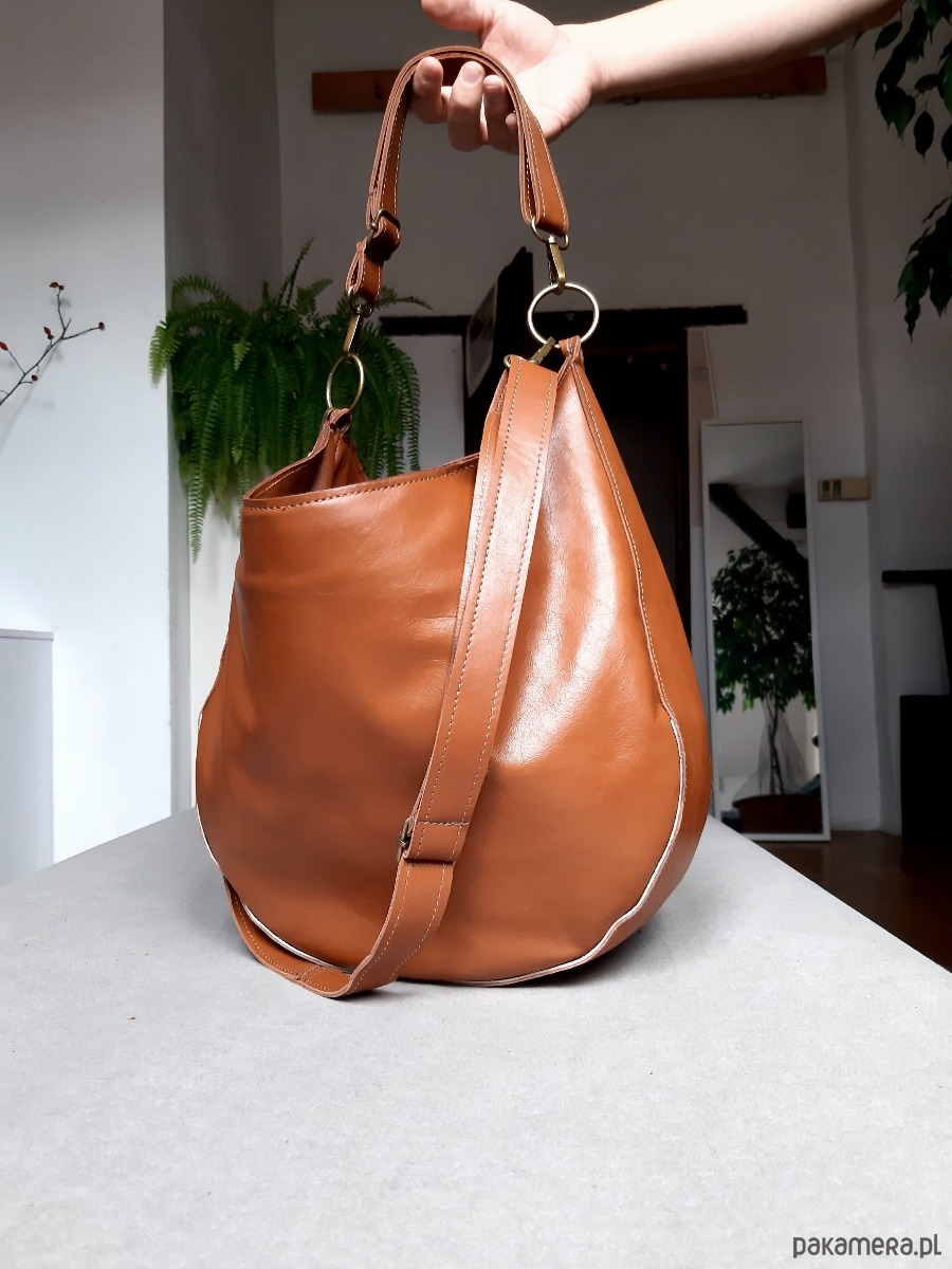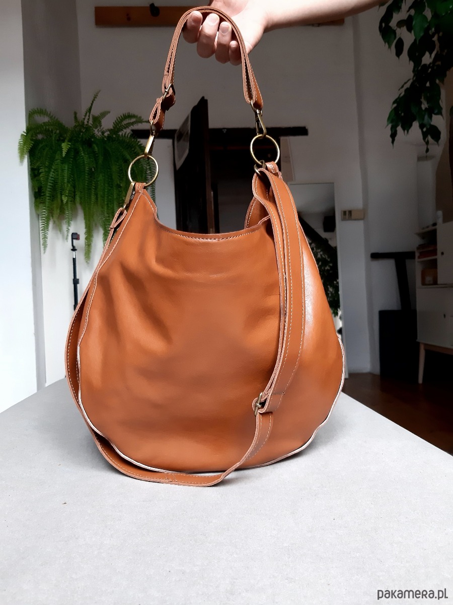 Miękka zaokrąglona torebka w stylu "banana bag". Do noszenia na krótkim pasku ciasno na ramieniu lub na skos na regulowanym. Uszyta z niezwykle miękkiej brązowej / rudej skóry naturalnej. Cudowna na jesień i po.