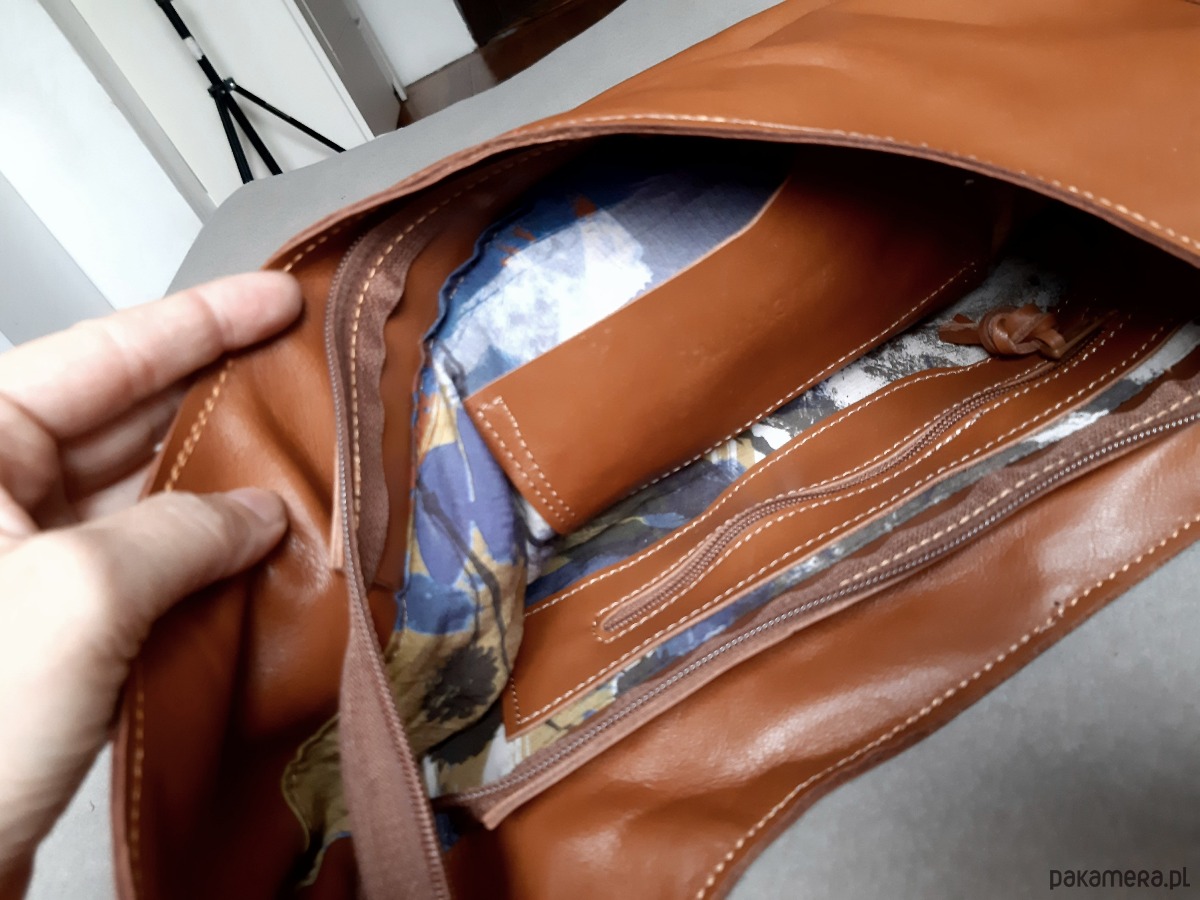 Wewnątrz podszewka. Kieszonka na zamek i kieszonka na telefon. Mieści a4. Ale raczej zeszyt niż teczkę. Wys. na środku 28 cm, bok w najszerszym miejscu 10 cm.