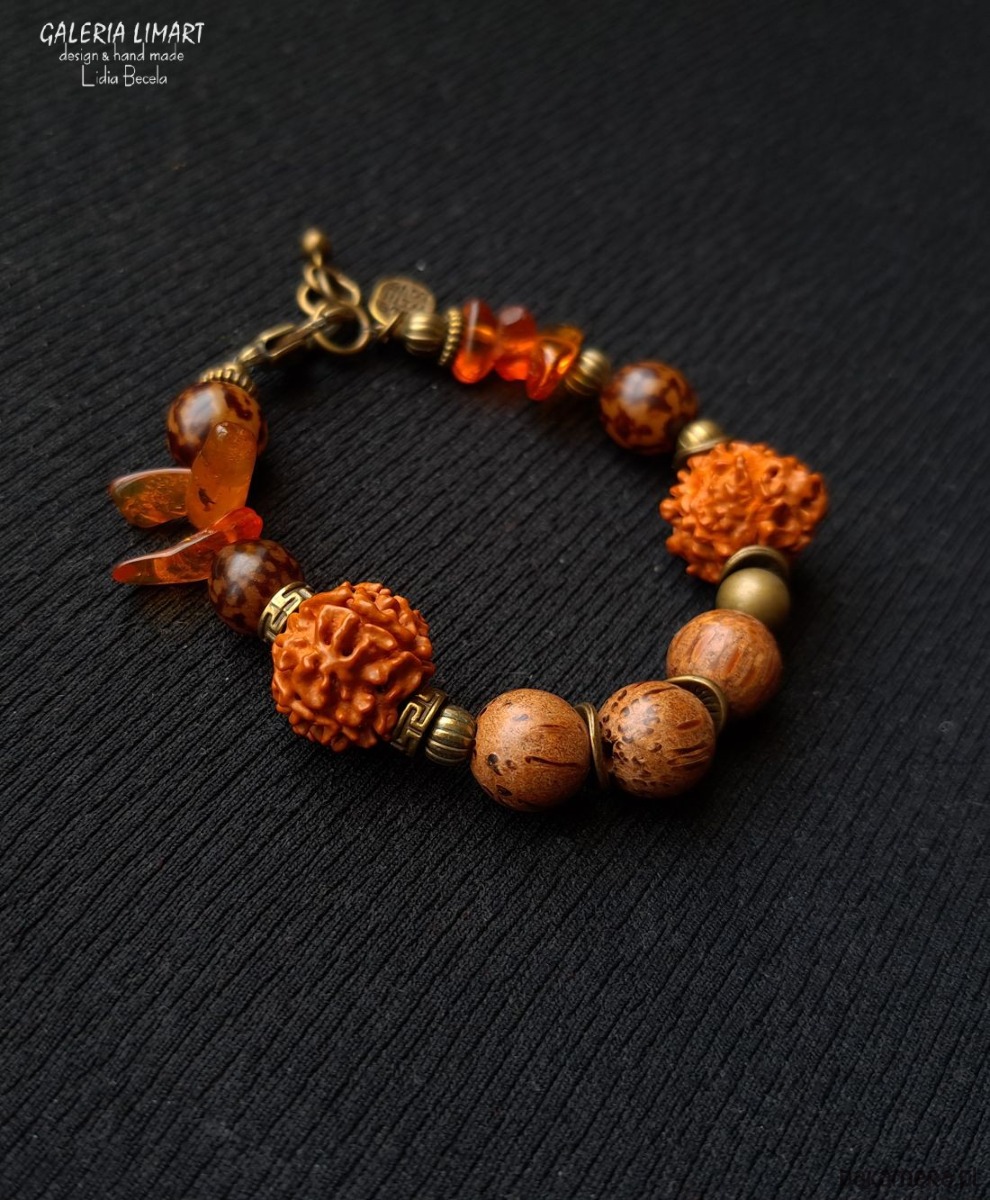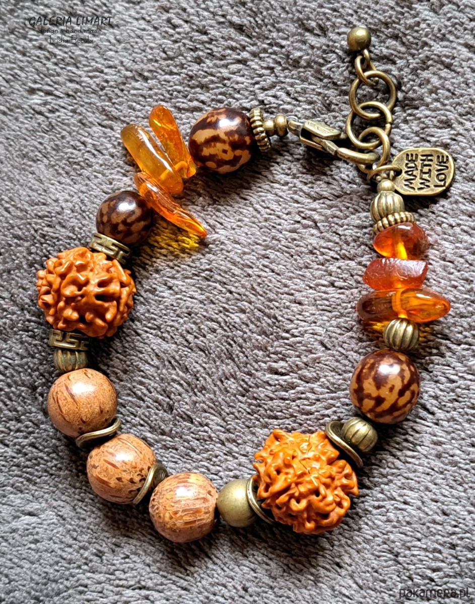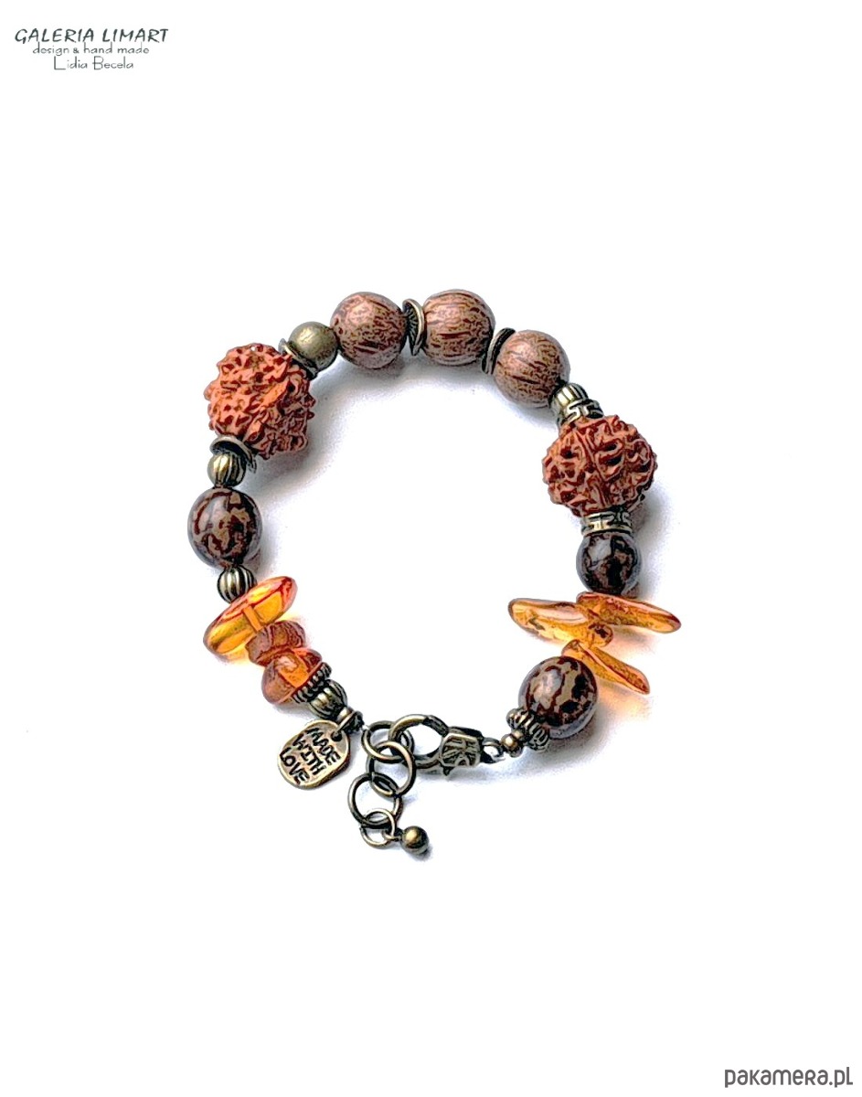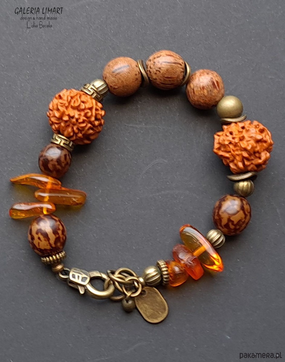 Rudraksha i bursztyn w niezwykłej etnicznej bransoletce unikat handmade UNISEX
